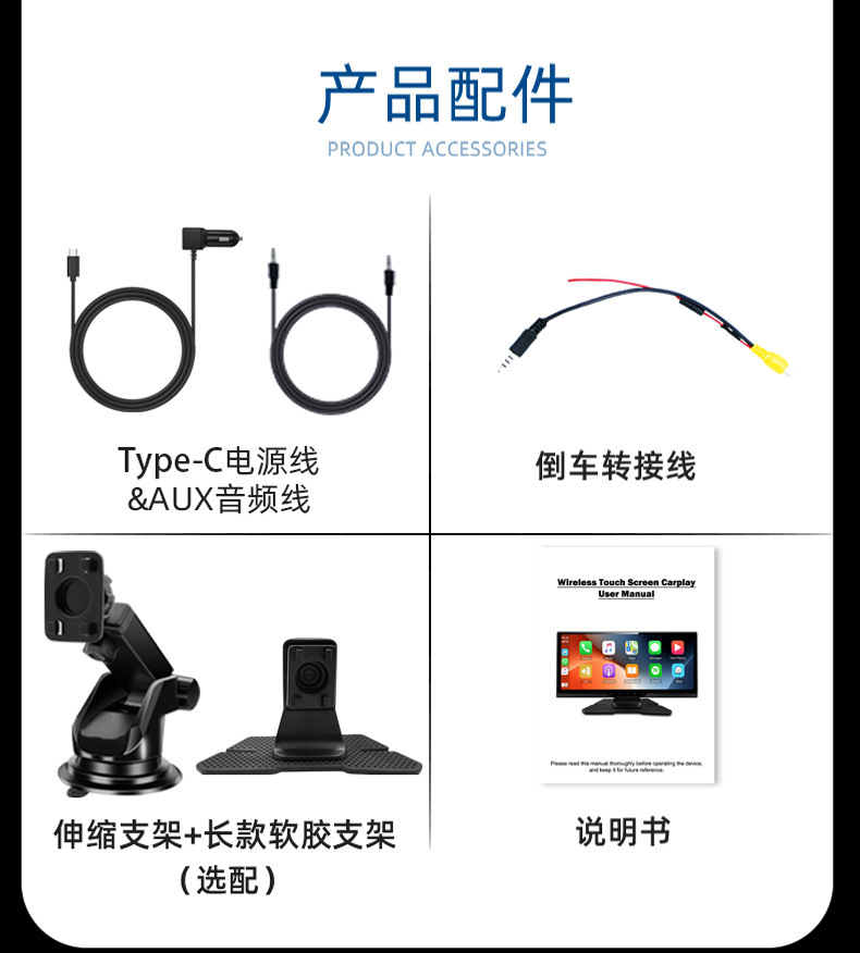 9.配可调节伸缩支架,塑胶圆盘,倒车转接线,12V点烟器电源线,通用PND说明书