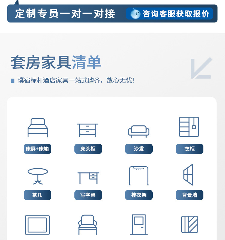 стрип-таблица; 1.2m кровать; 1.5m кровать; 1.8m кровать; экран кровати; диван с карточным сиденьем; небольшой круглый стол; табурет для багажа; Кресло для чтения; Шкаф под раковину