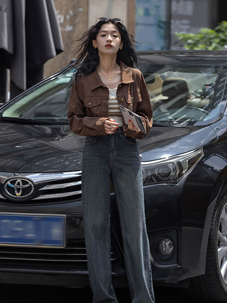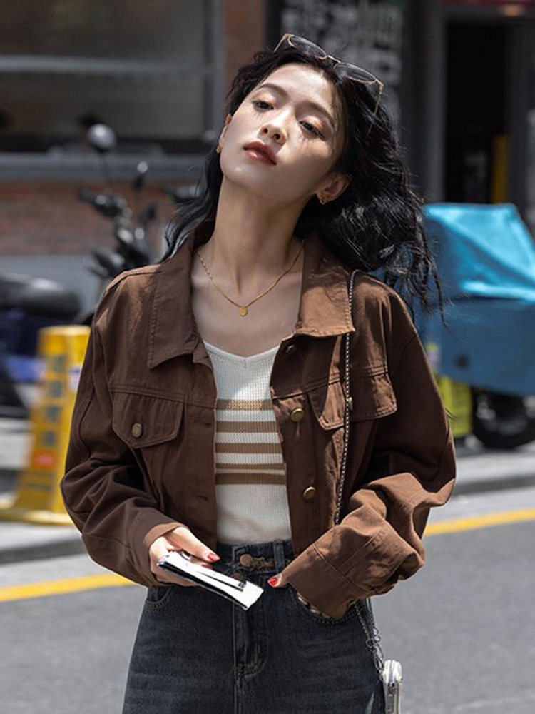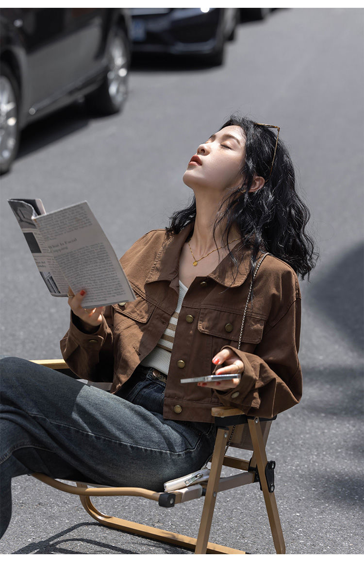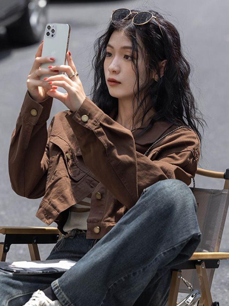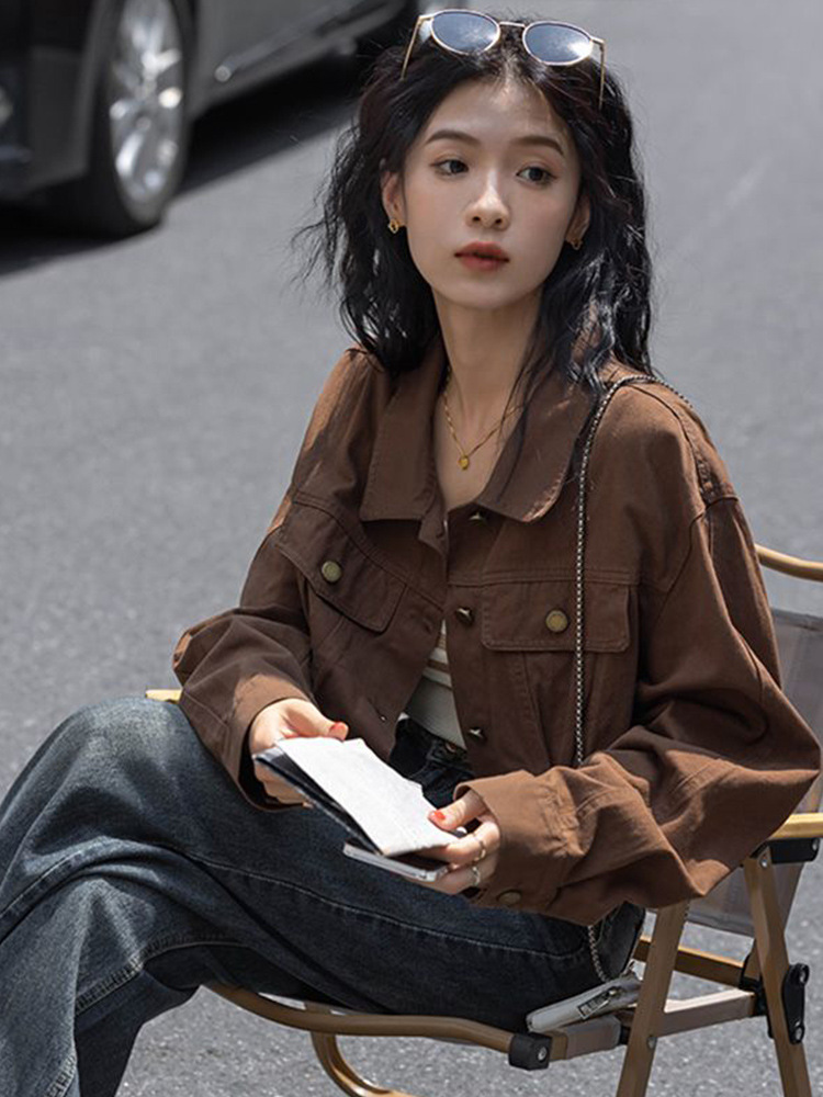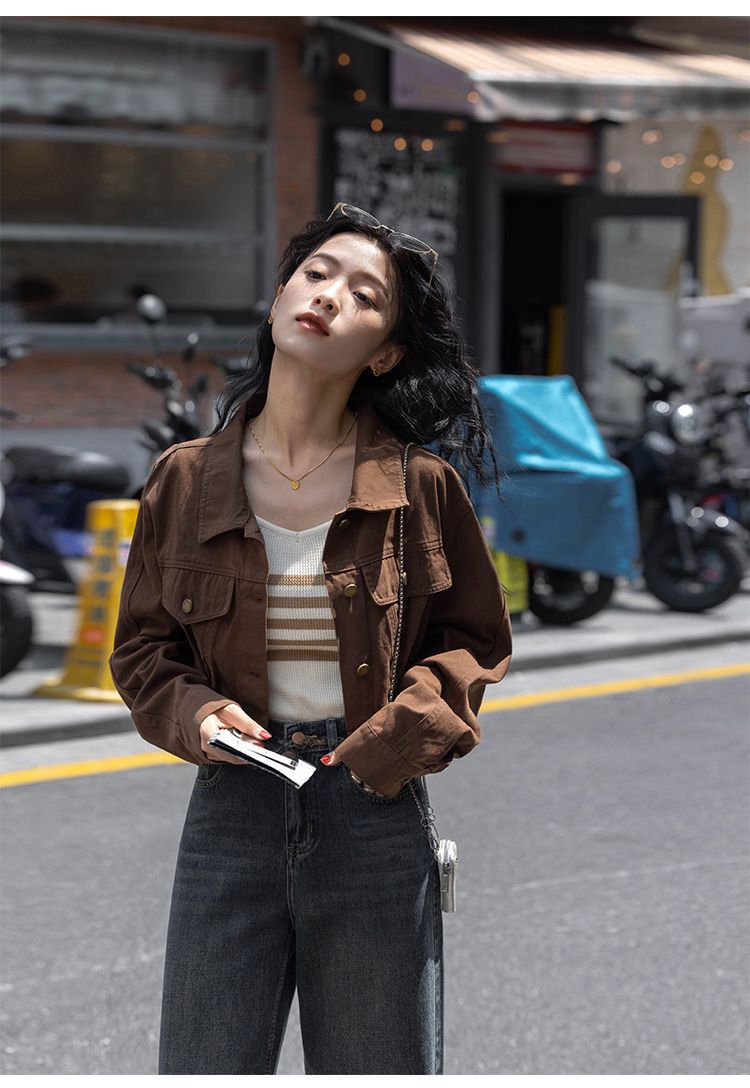 Женская кофейно-коричневая куртка с длинными рукавами в стиле Майяра, новая облегающая короткая рабочая куртка весны и осени 2025 года для невысоких фигур.