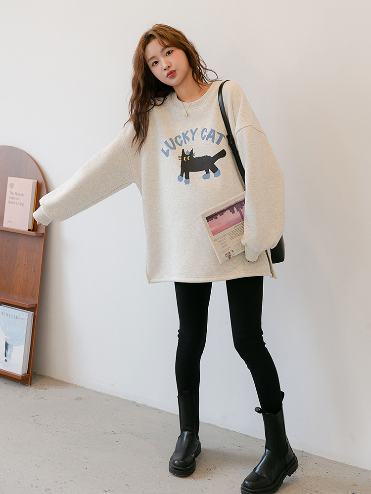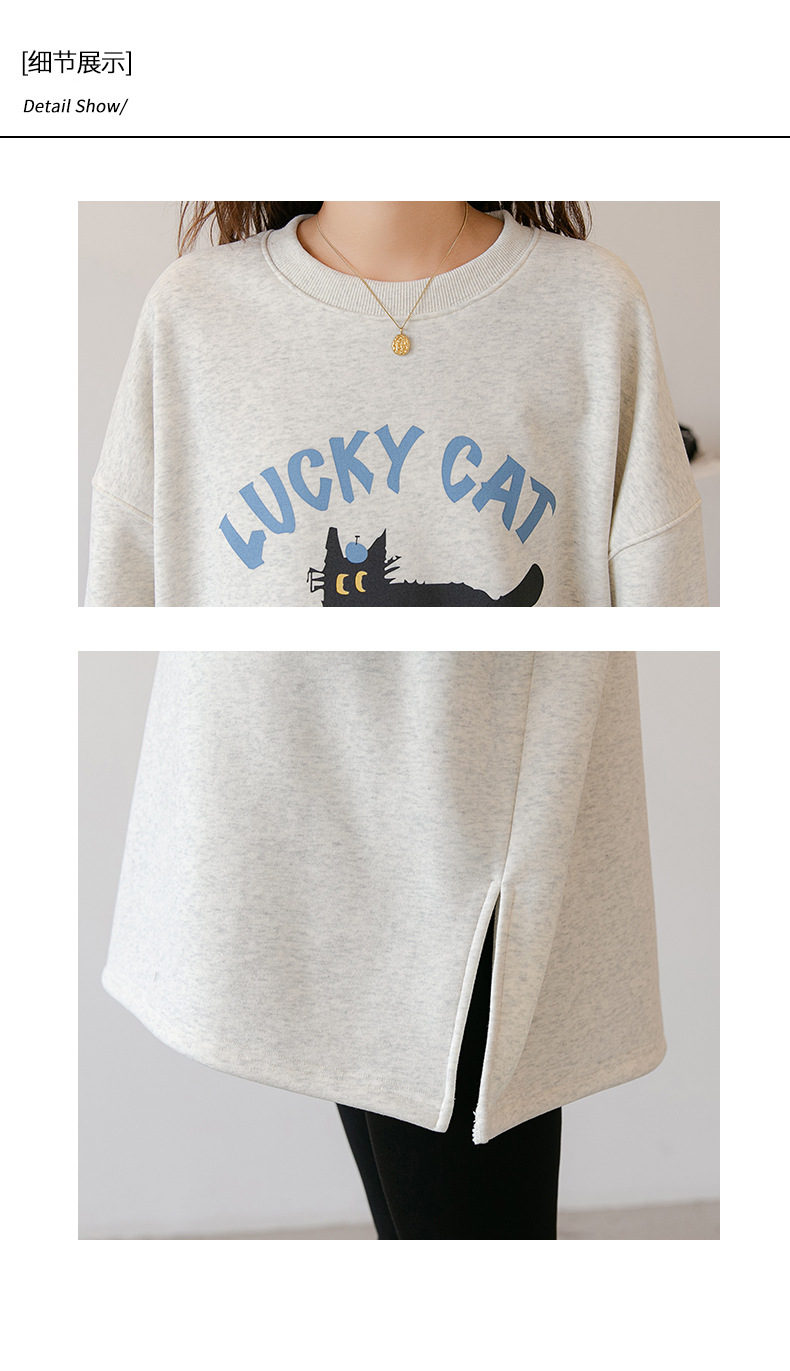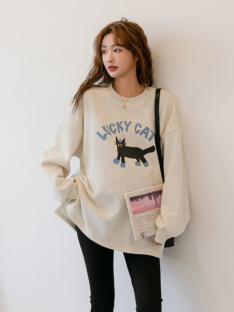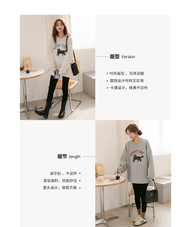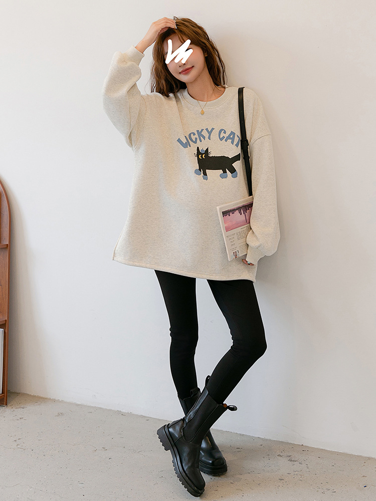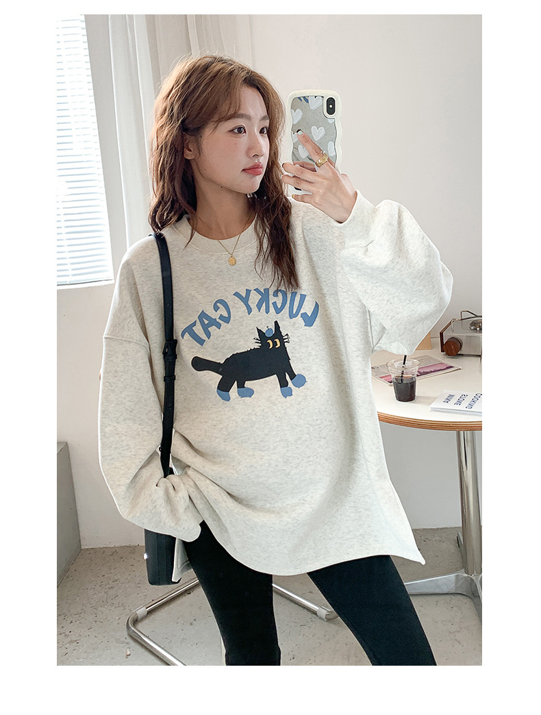 Толстовка с круглым вырезом на флисовой подкладке и принтом «Счастливый кот», одежда для беременных в корейском стиле, свободный повседневный пуловер с длинными рукавами, модный.