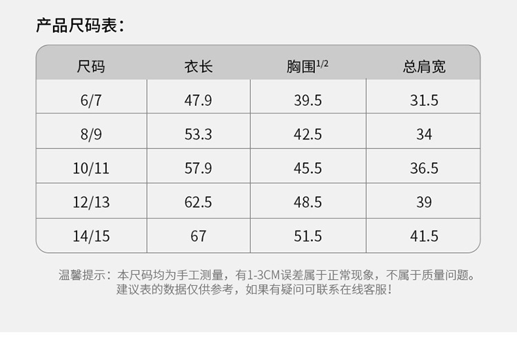6/7(120cm); 8/9(130cm); 10/11(140cm); 12/13(150cm); 14/15(160cm)