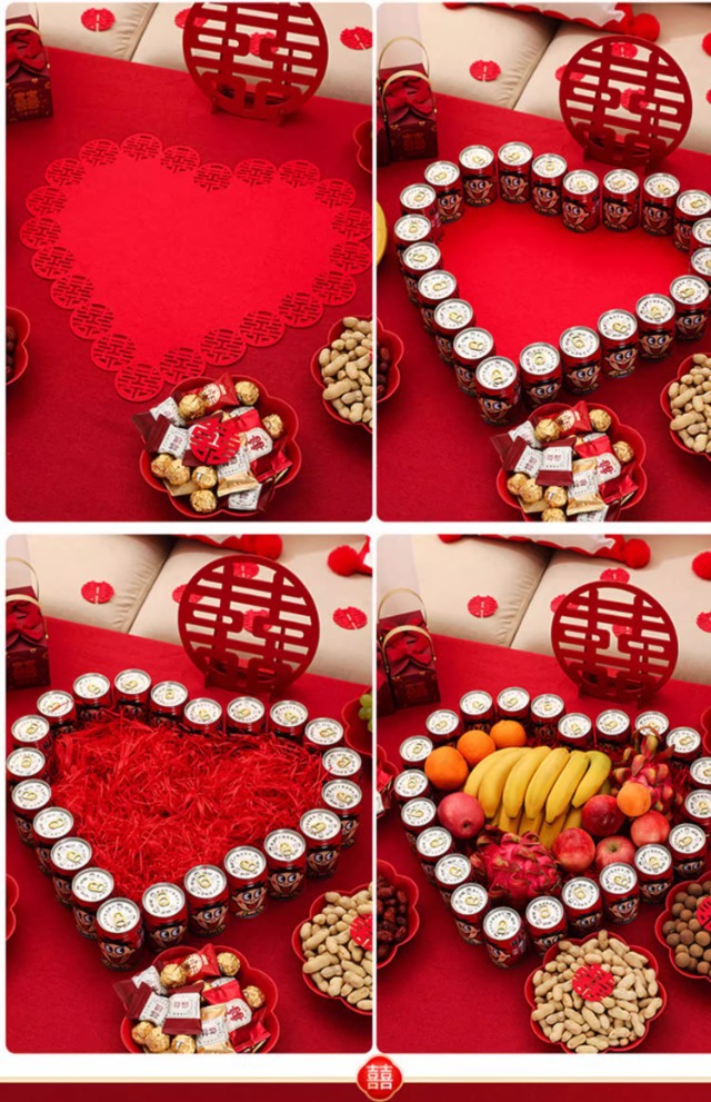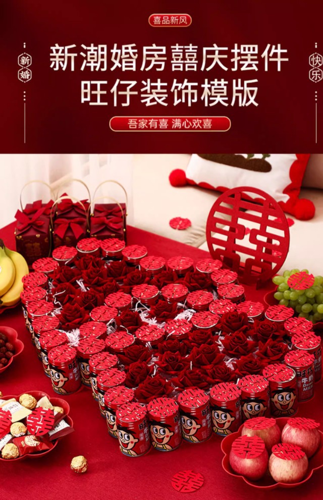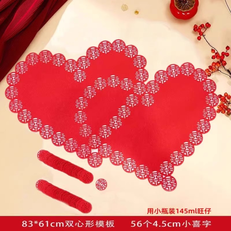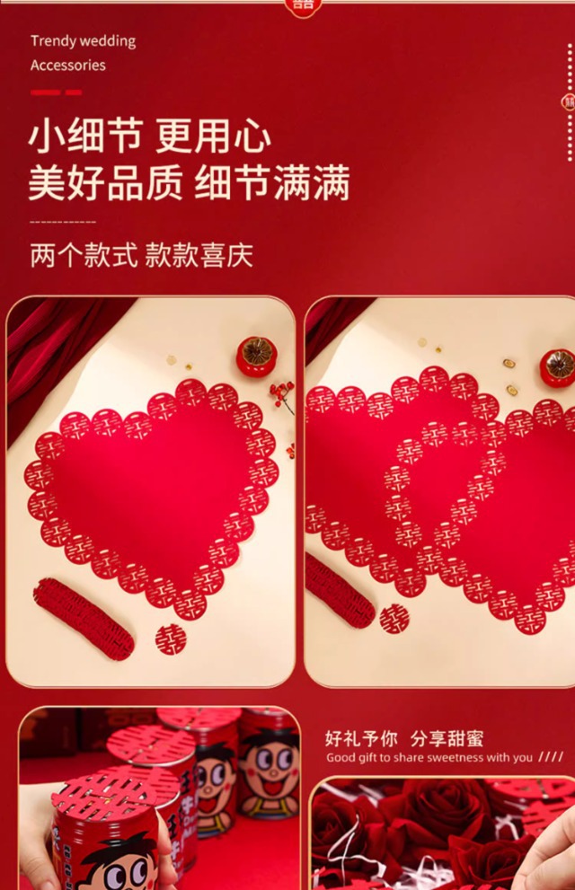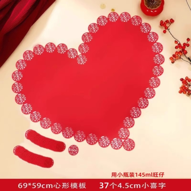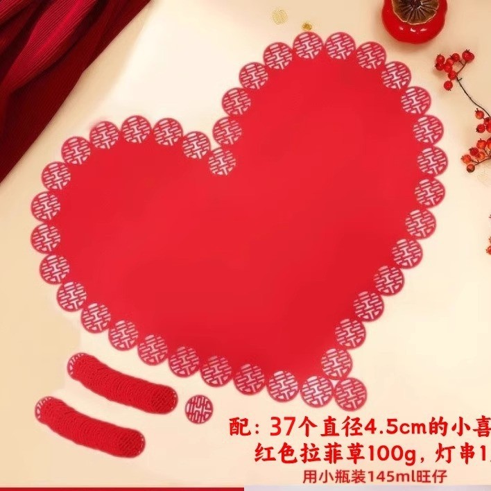 Двойной шаблон для позирования сердца + 56 счастливых персонажей, подходит для 145 мл маленькой банки Ванзукай; Двойной шаблон для позирования сердца + 56 счастливых слов + 100 г рафии + 1m легкая струна подходит для 145 мл маленькая банка Wangzai; Шаблон дисплея в форме сердца + 38 символов «двойное счастье», подходит для небольших банок Wangzai объемом 145 мл.; Шаблон для оформления в форме сердца + 38 символов «двойное счастье» + 100 г рафии + 1m гирлянда, подходит для мини-банок Wangzai объемом 145 мл.; Шаблон для позиционирования двойного сердца + 42 счастливых персонажа, подходит для большой банки Wangzai объемом 245 мл.; Шаблон дисплея в форме сердца + 22 символа «двойное счастье», подходит для больших банок Want Want объемом 245 мл.; 100 г рафии + 1m гирлянды; Акриловая модель с двойным счастьем: диаметр около 22 см.; Пластиковая модель с двойным счастьем: диаметр около 21 см.; 10 упаковок красных лепестков [около 1000 штук]; Флизелиновая фруктовая тарелка Юаньси, 30 шт.