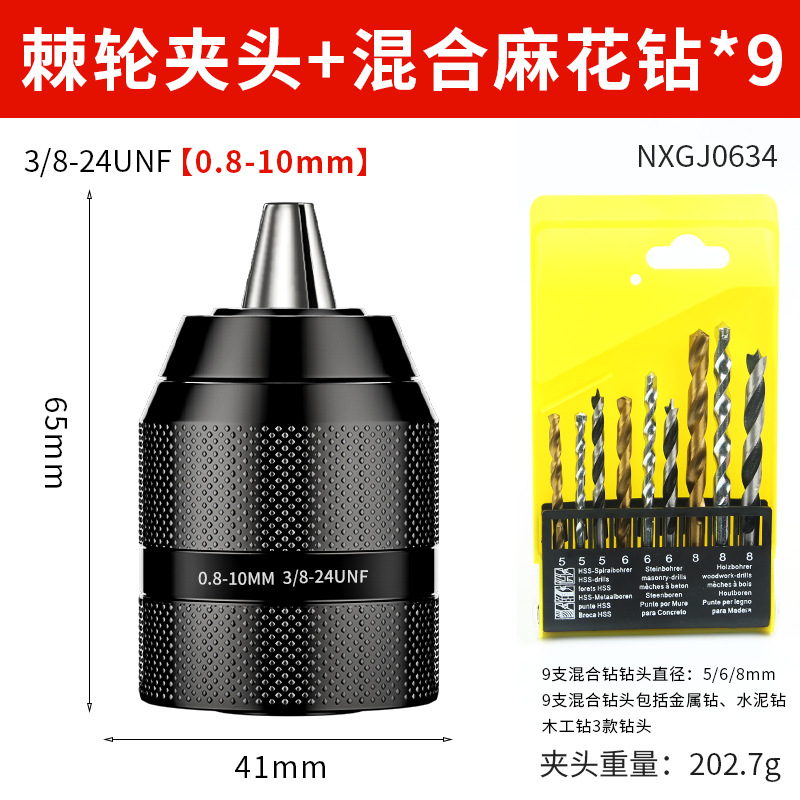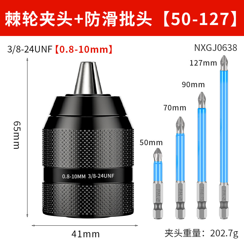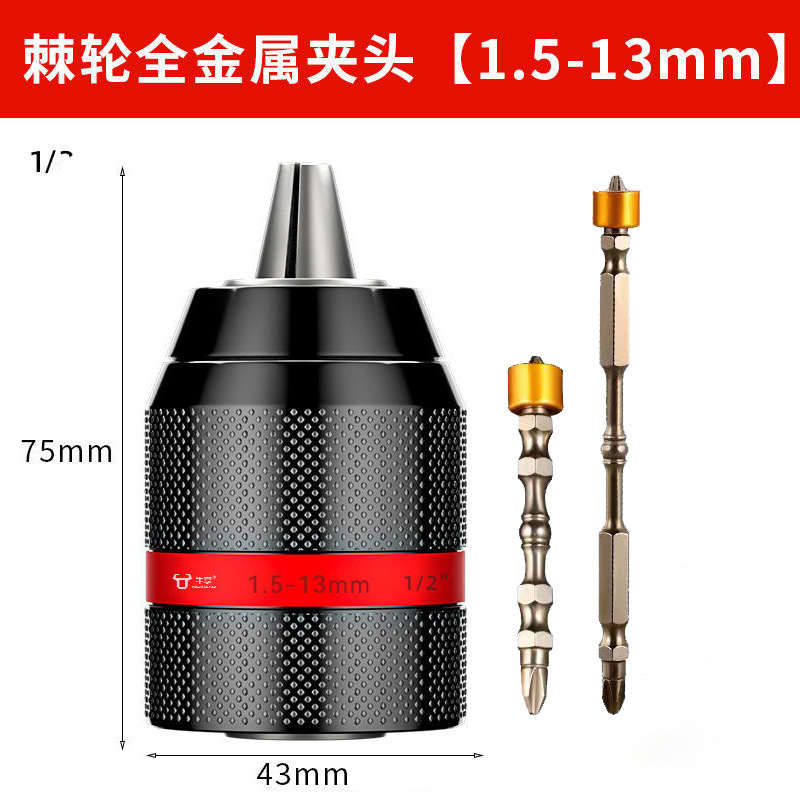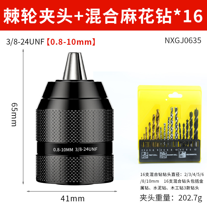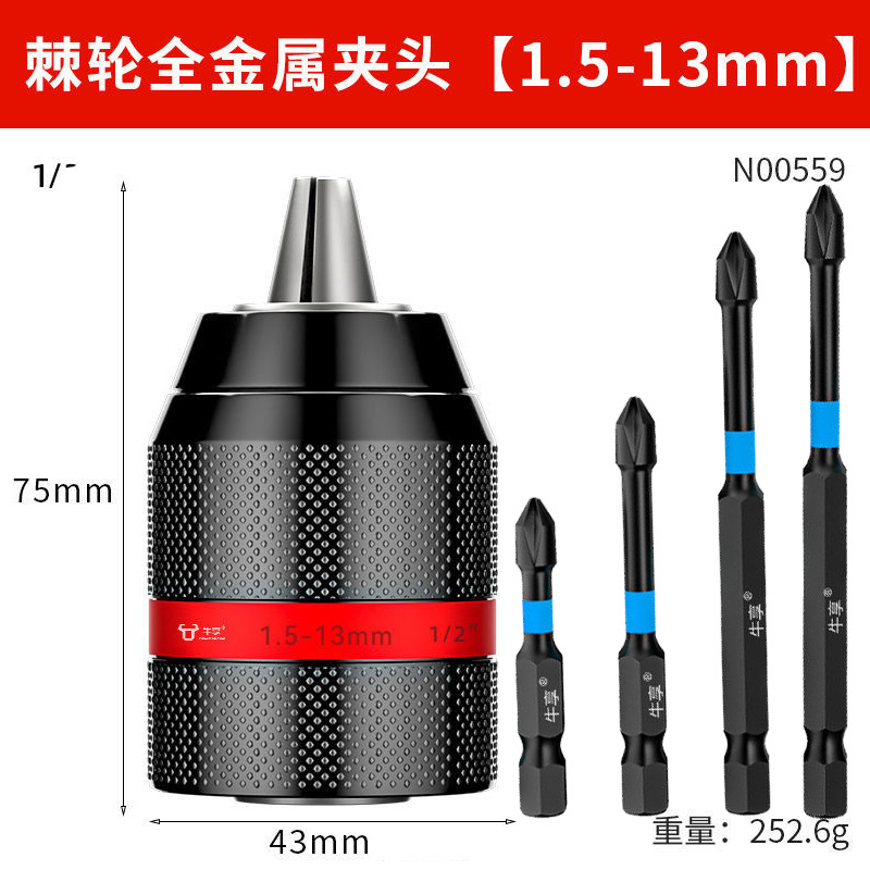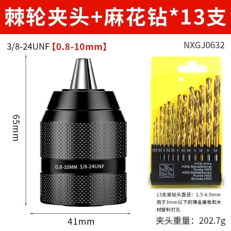 Недавно модернизированный металлический патрон [0,8-10 мм]; Недавно модернизированный металлический патрон [1,5-13 мм]; Цельнометаллический патрон [0,8-10] + 2 бита с магнитной катушкой; Цельнометаллический патрон [0,8-10] + 4 противоскользящих насадки; Цельнометаллический патрон [0,8-10] + 4 ударных насадки; Цельнометаллический патрон [0,8-10] + 4 строительных дрели; Цельнометаллический патрон [0,8-10] + 4 сверла для керамической плитки; Цельнометаллический патрон [0,8-10] + 9 смешанных спиральных сверл.; Цельнометаллический патрон [0,8-10] + 16 смешанных сверл.; Цельнометаллический патрон [0,8-10] + 13 спиральных сверл с титановым покрытием; Цельнометаллический патрон [0,8-10] + 8 трехточечных сверл для деревообработки; Цельнометаллический патрон с храповым механизмом [0,8-10 мм] + стойка электрического ключа 3/8; Цельнометаллический патрон с храповым механизмом [1,5-13 мм] + стойка электрического ключа 1/2; Цельнометаллический патрон с храповым механизмом [1,5-13 мм] + сильная магнитная кольцевая насадка; Цельнометаллический патрон с храповым механизмом [1,5-13 мм] + новая сверхтвердая насадка; Патрон для ключей на 10 мм с ключом; Патрон для ключей на 13 мм; Ручной самозапирающийся патрон диаметром 13 мм.; Патрон для ключей на 16 мм