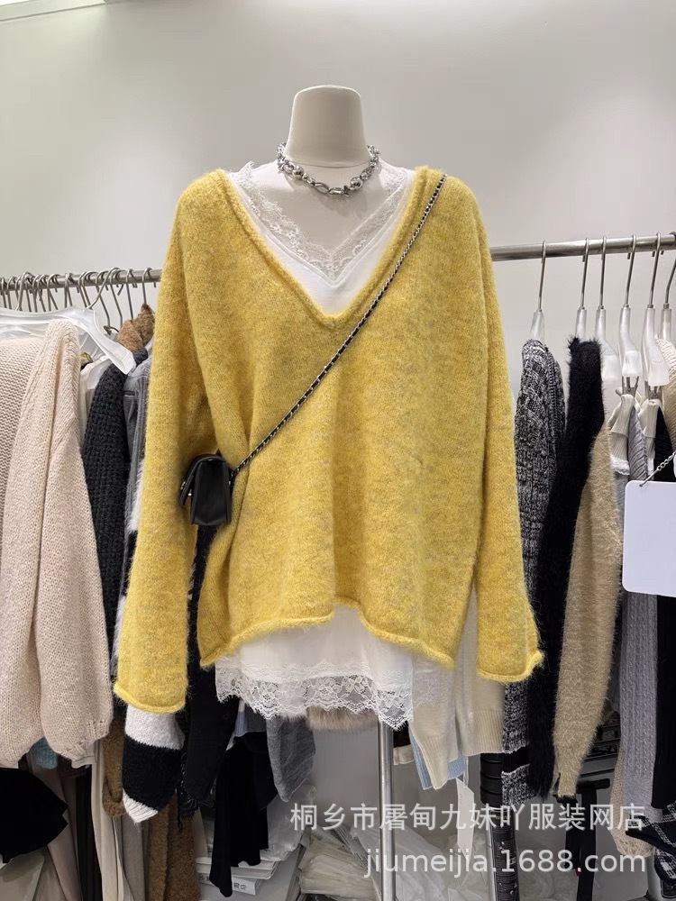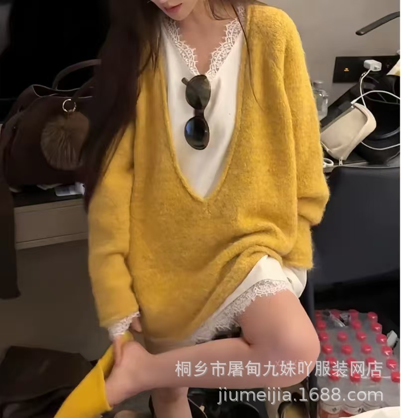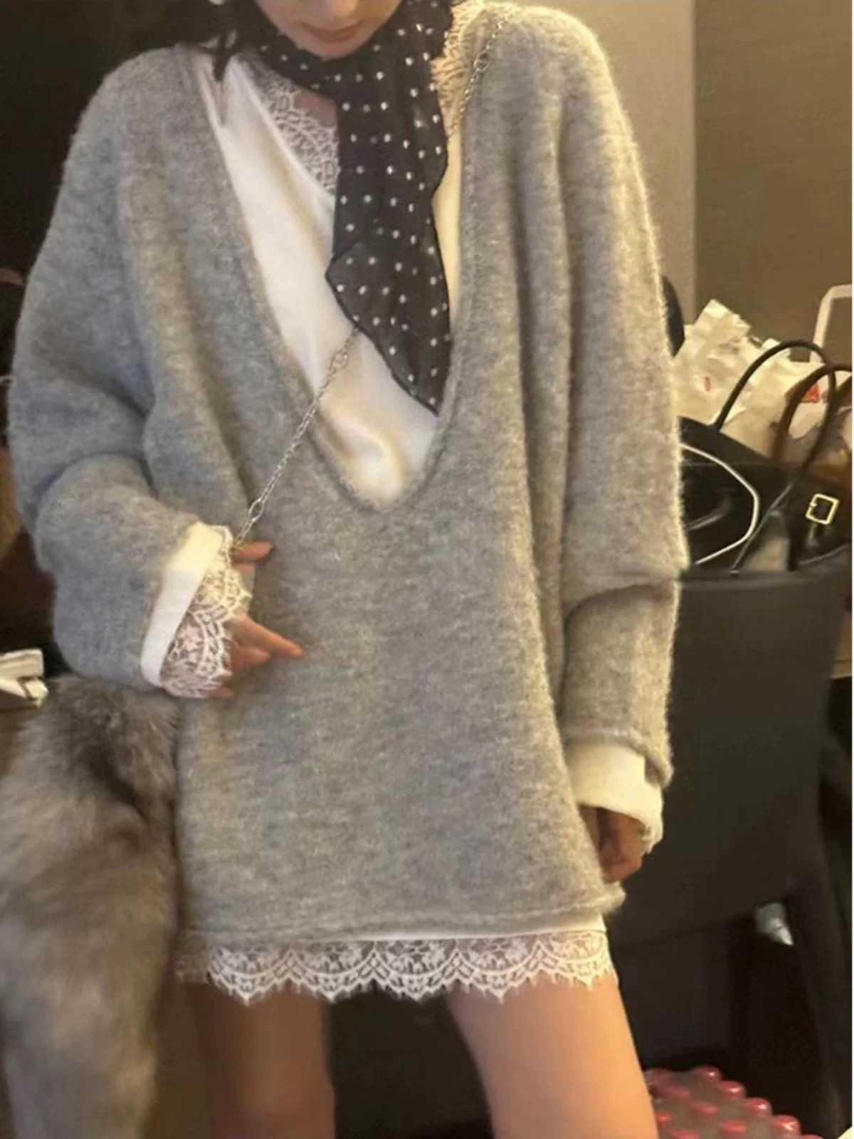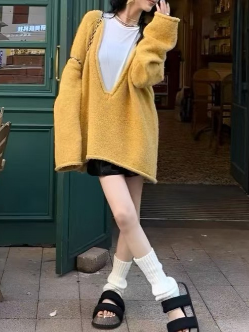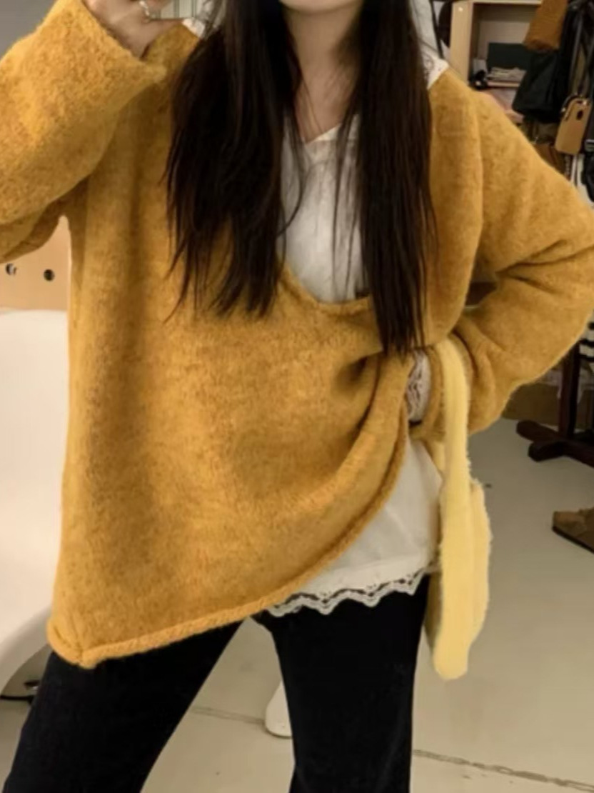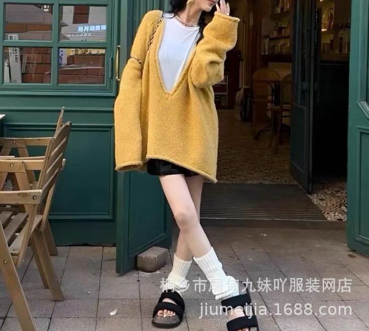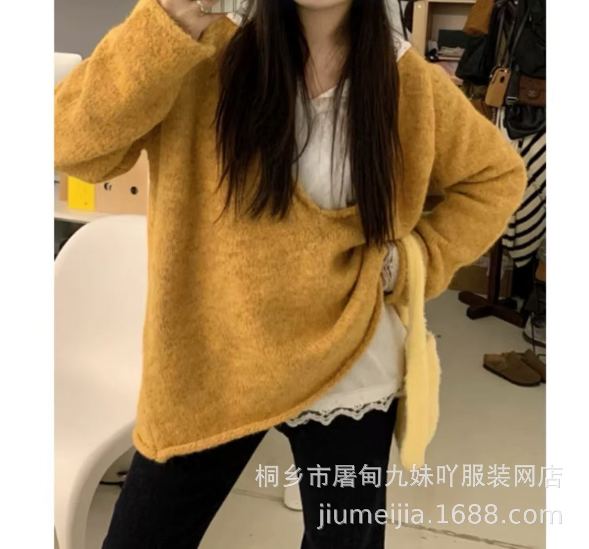 Корейский ленивый свободный мягкий клейкий большой свитер с v-вырезом женский 2024 осень и зима новый модный свитер с длинными рукавами