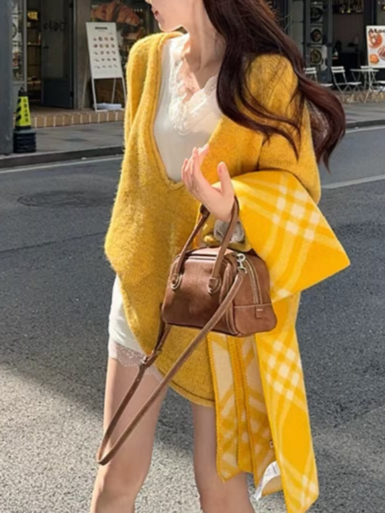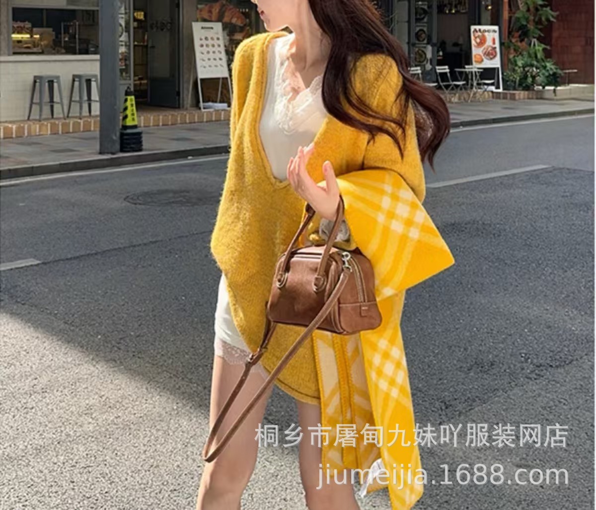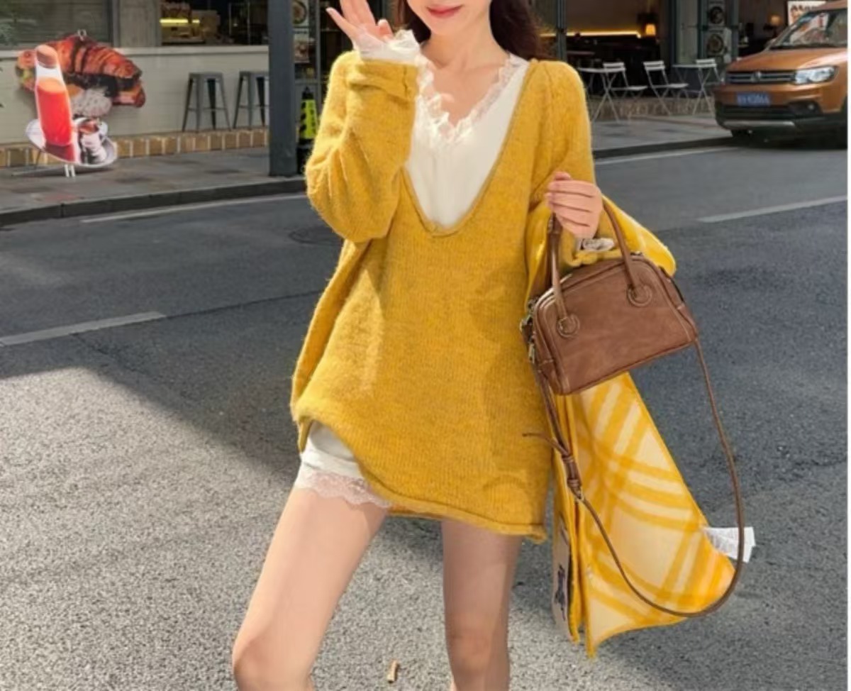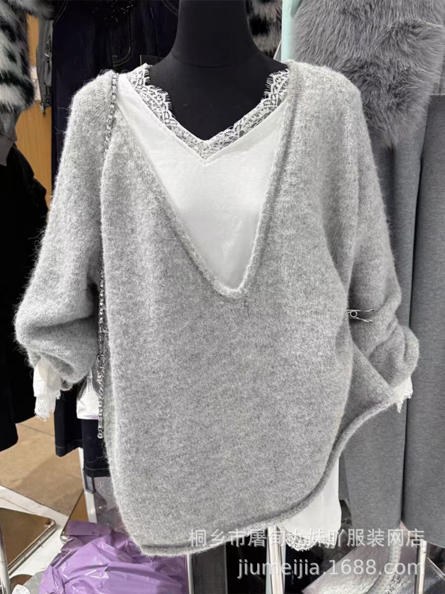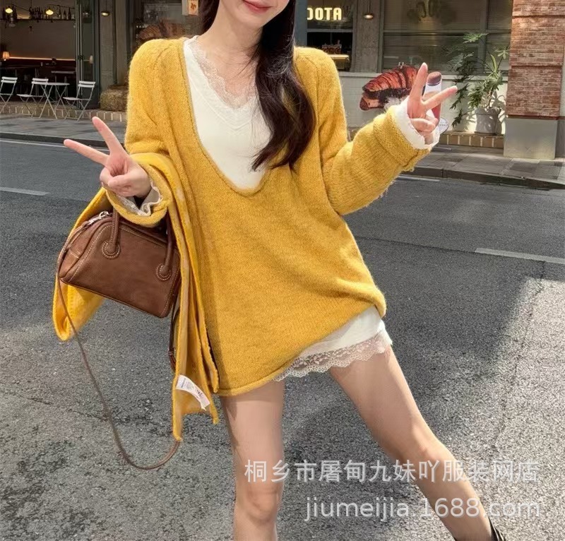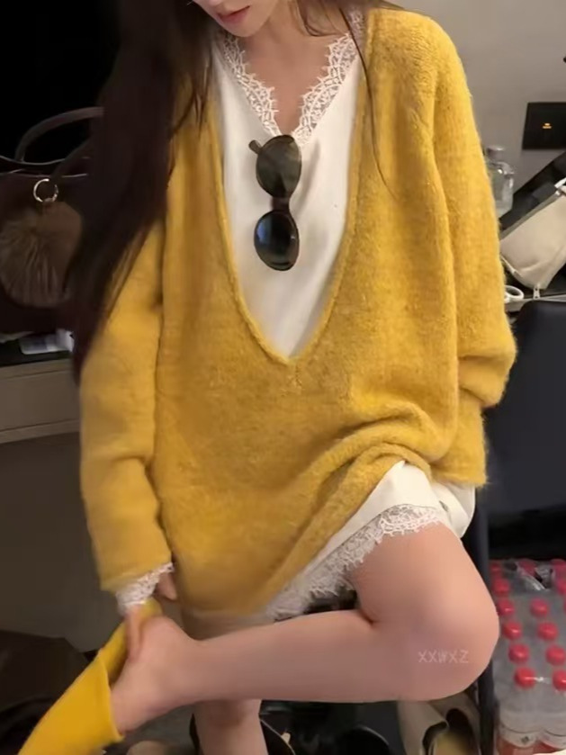 Корейский ленивый свободный мягкий клейкий большой свитер с v-вырезом женский 2024 осень и зима новый модный свитер с длинными рукавами