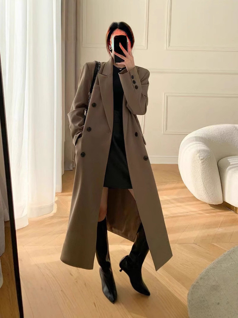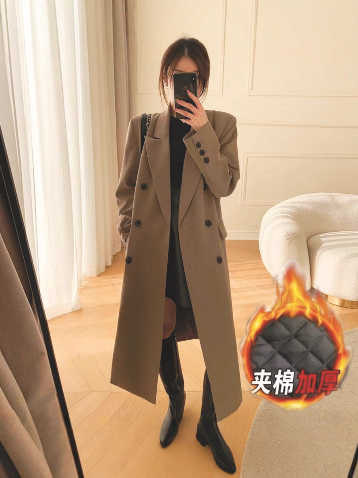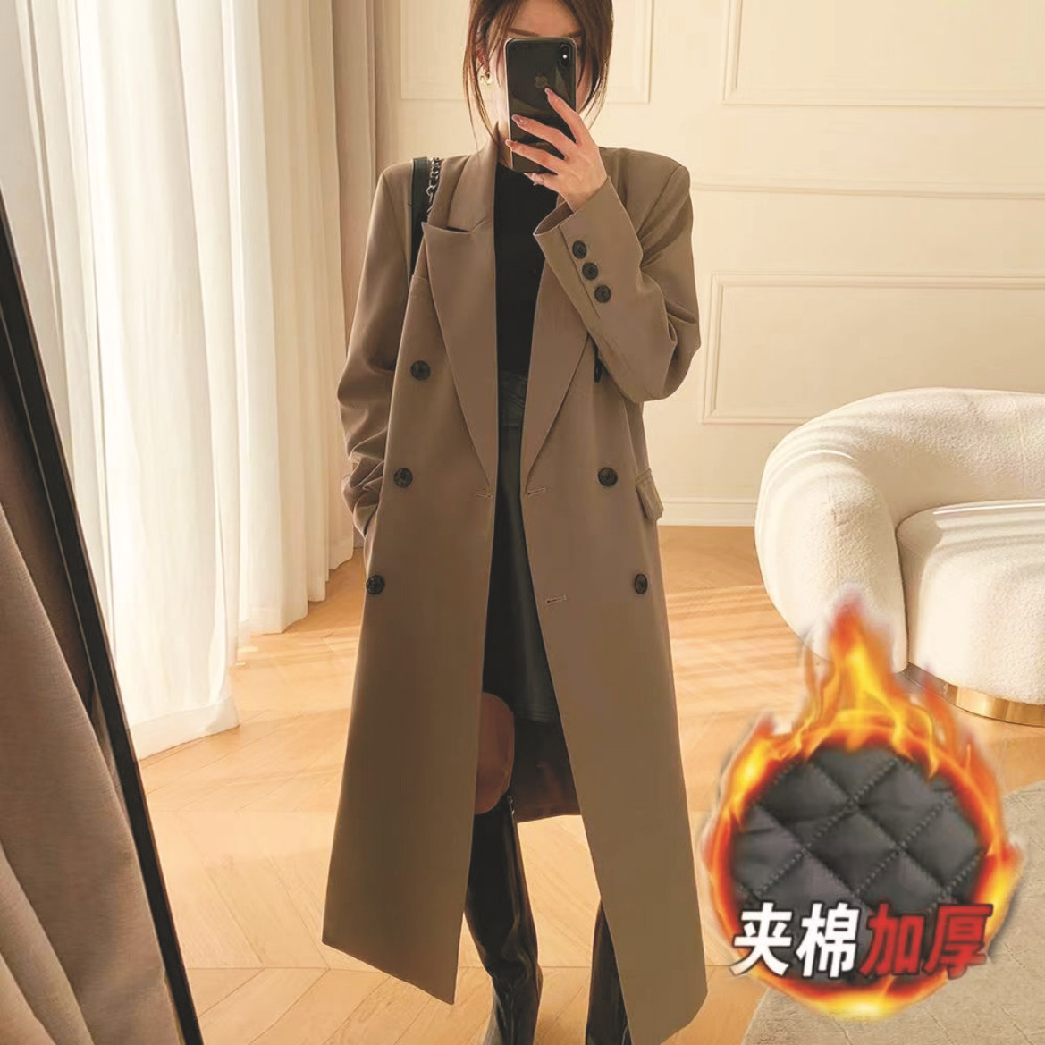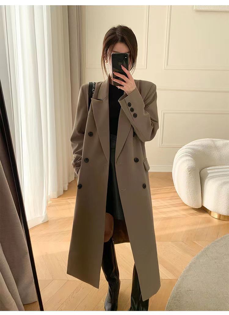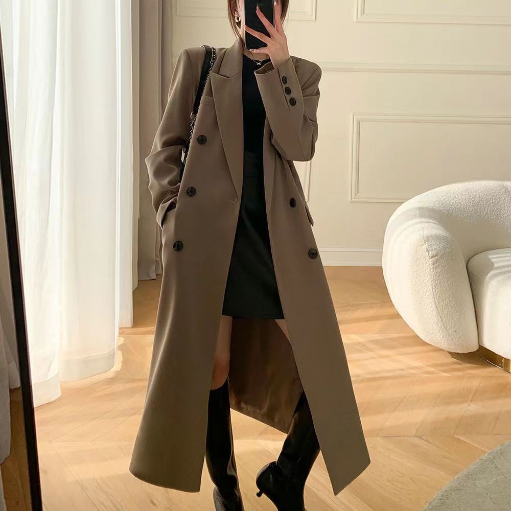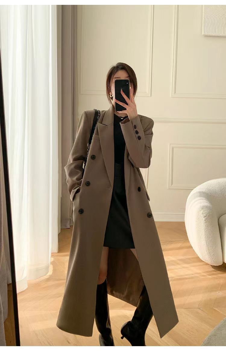 【Качественная ткань】Элегантный удлиненный двубортный плащ для женщин, средней длины, осенне-зимний, утепленный, приталенный пальто-тренч