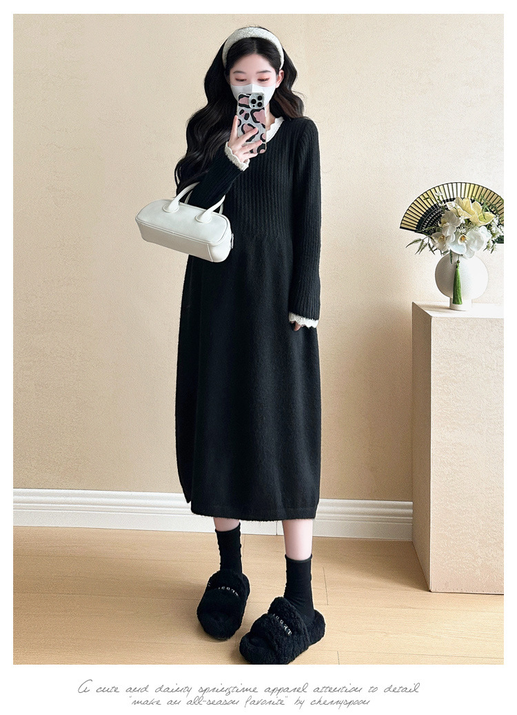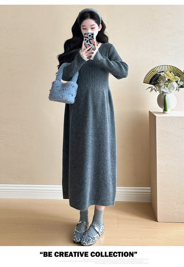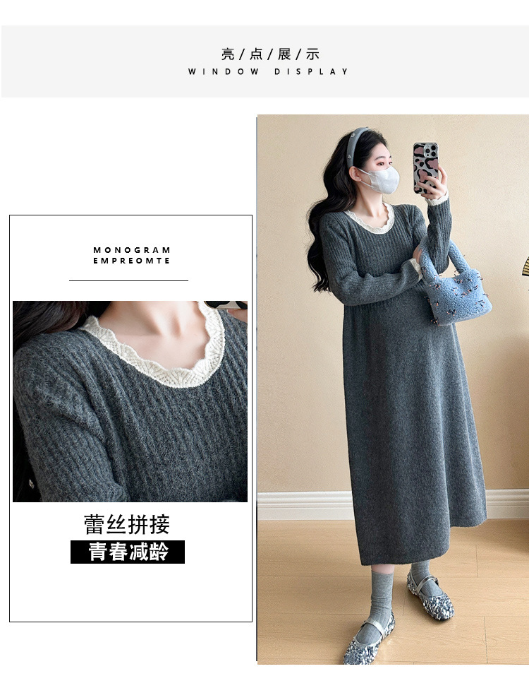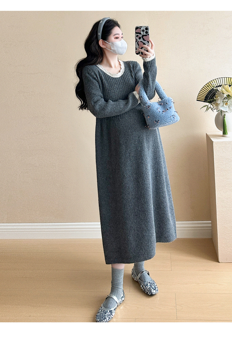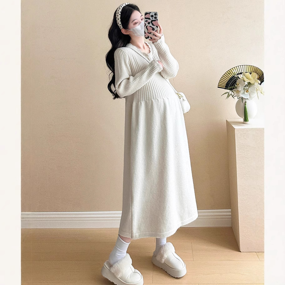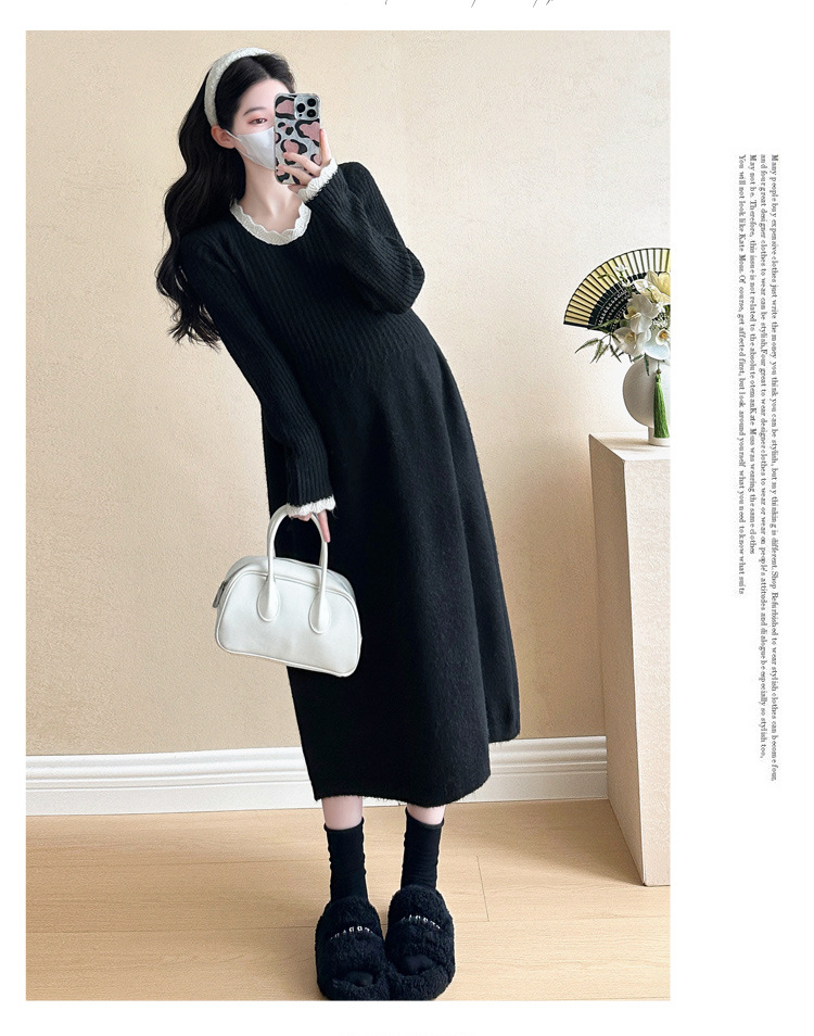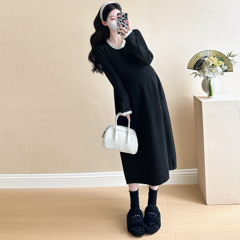 Одежда для беременных осенью и зимой трикотажное платье с длинными рукавами 2024 новая корейская версия сладкого кружева сшивания тонкая нижняя юбка