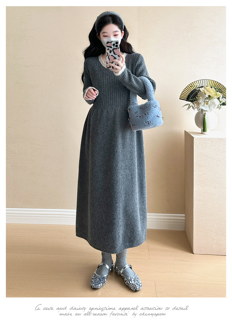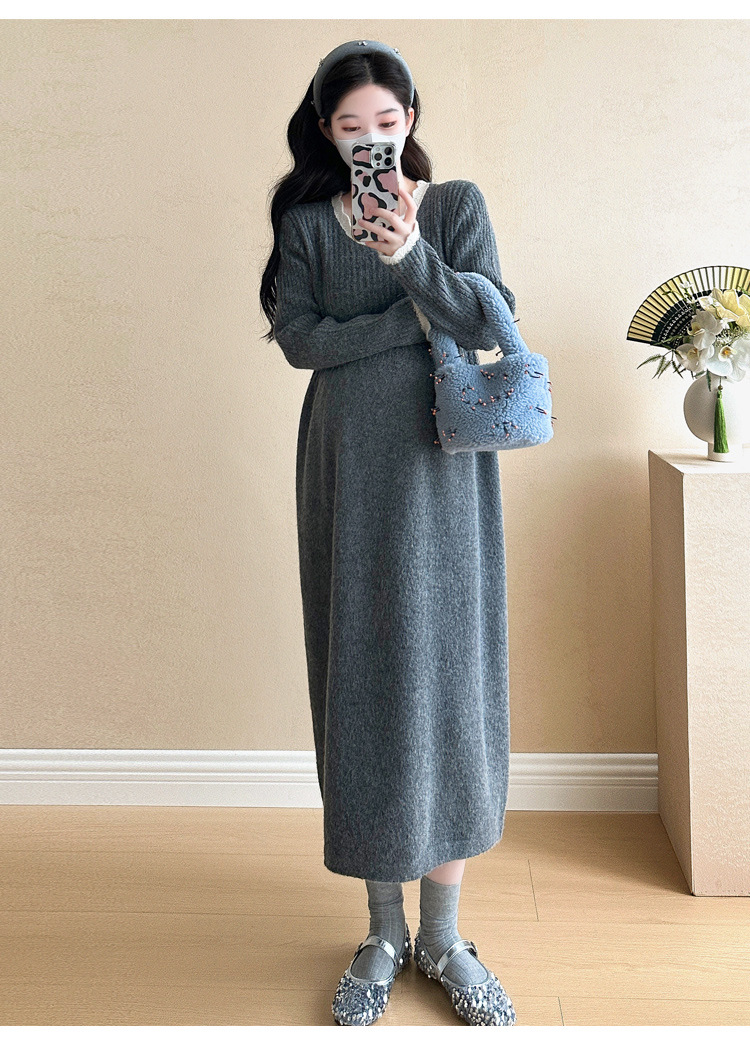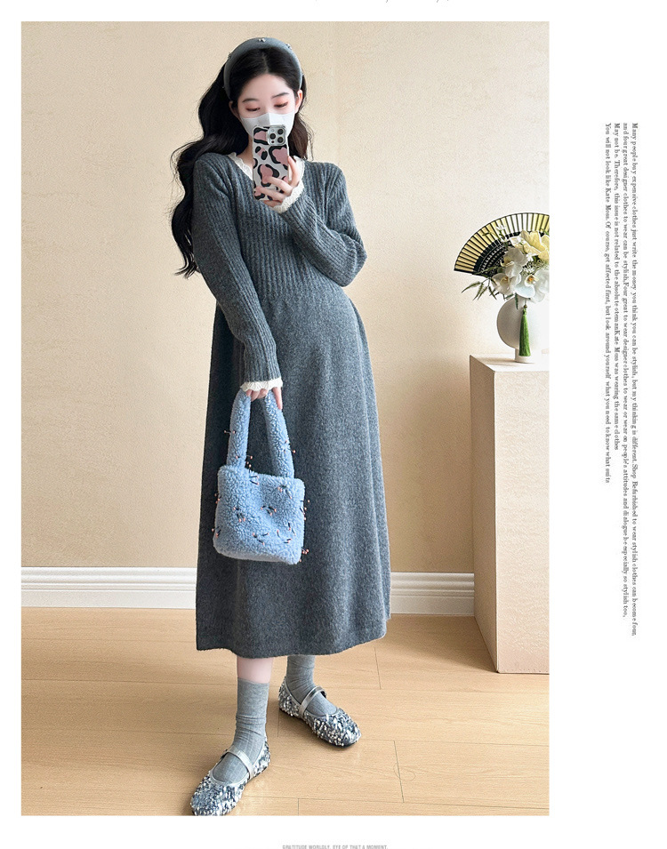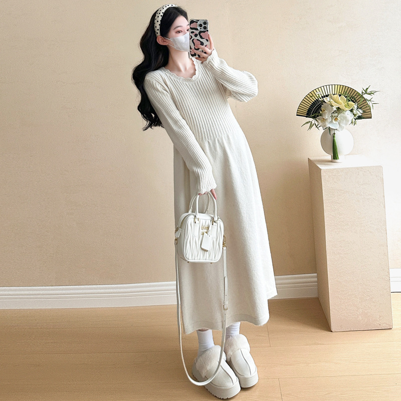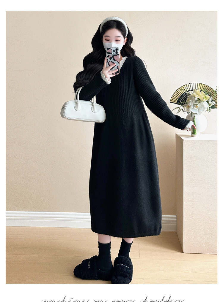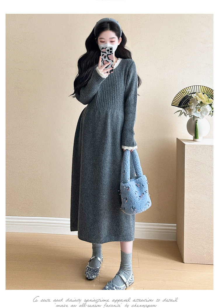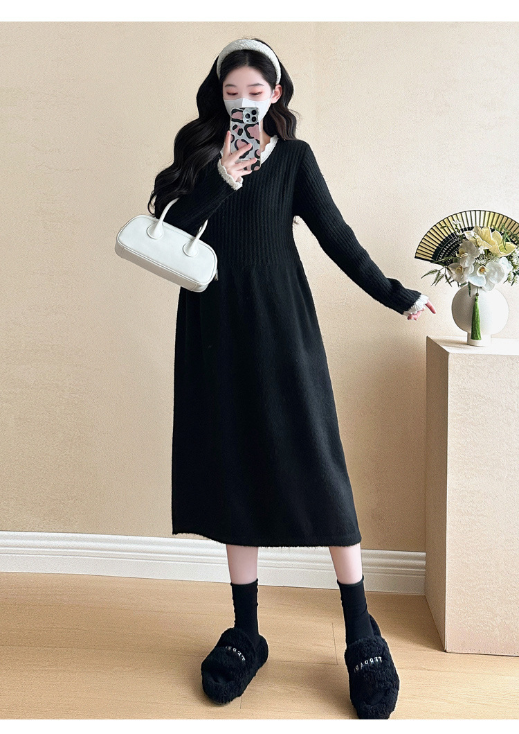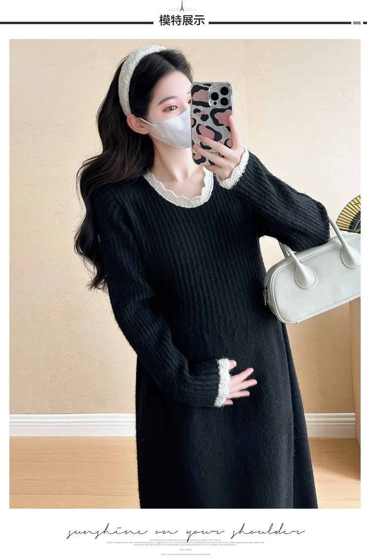 Одежда для беременных осенью и зимой трикотажное платье с длинными рукавами 2024 новая корейская версия сладкого кружева сшивания тонкая нижняя юбка