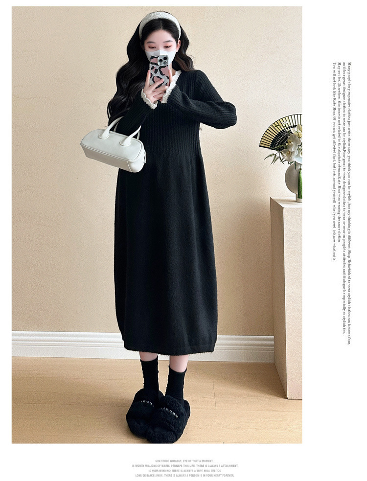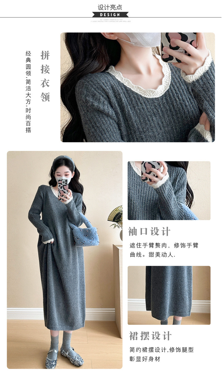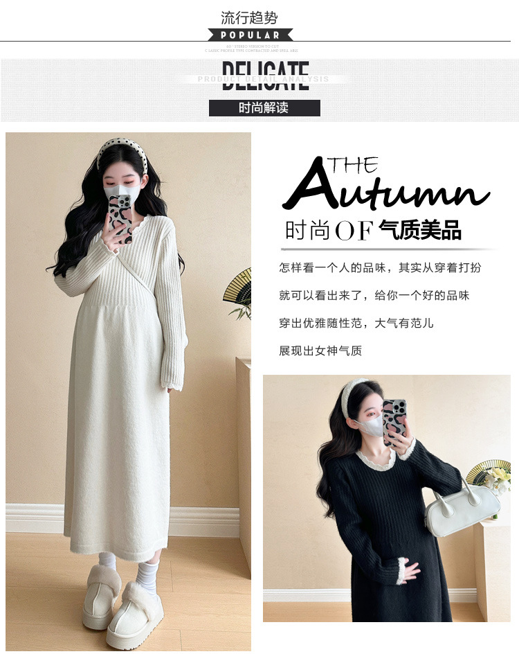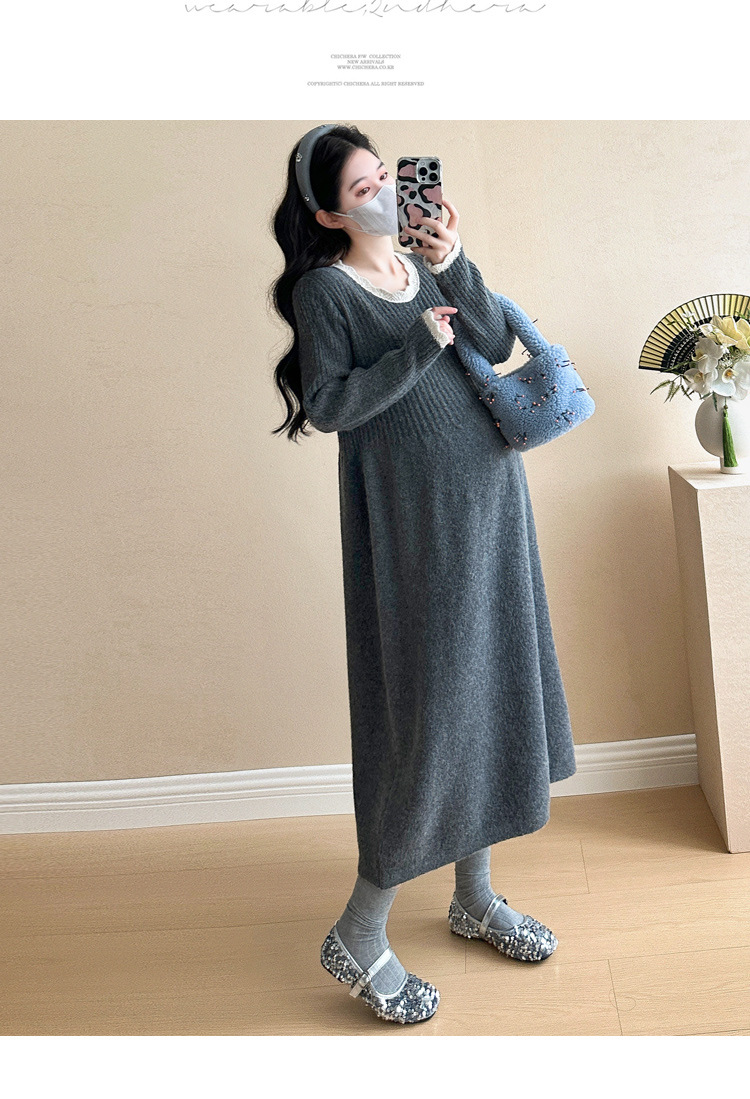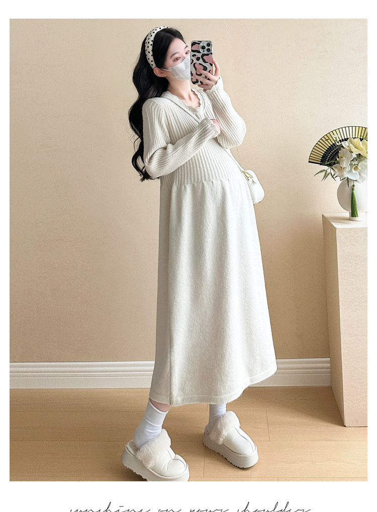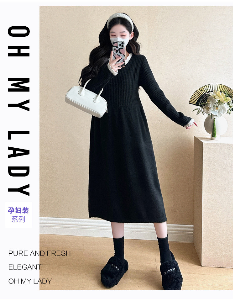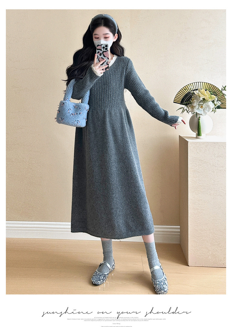 Одежда для беременных осенью и зимой трикотажное платье с длинными рукавами 2024 новая корейская версия сладкого кружева сшивания тонкая нижняя юбка