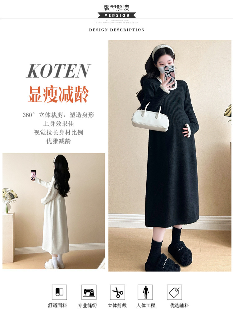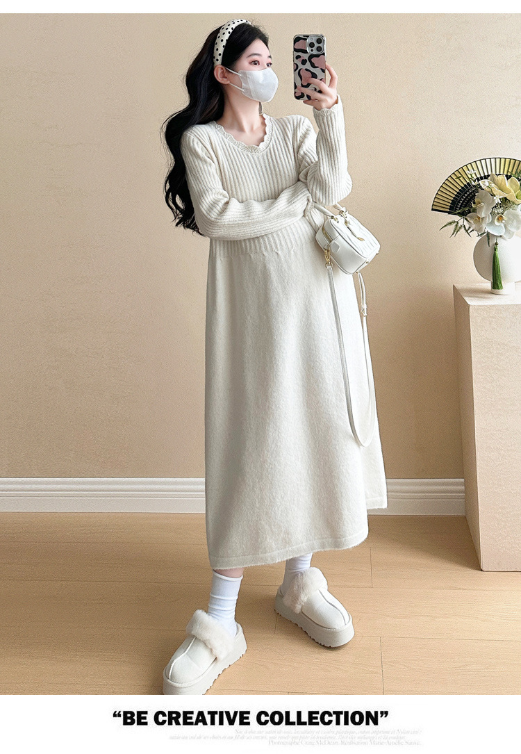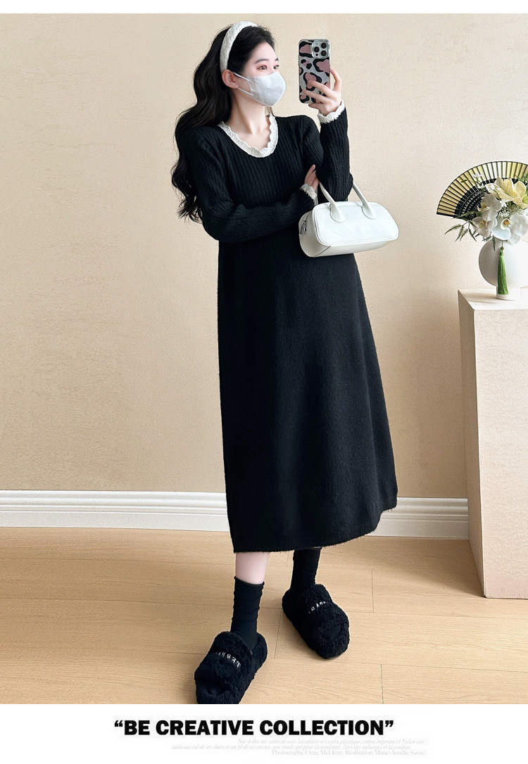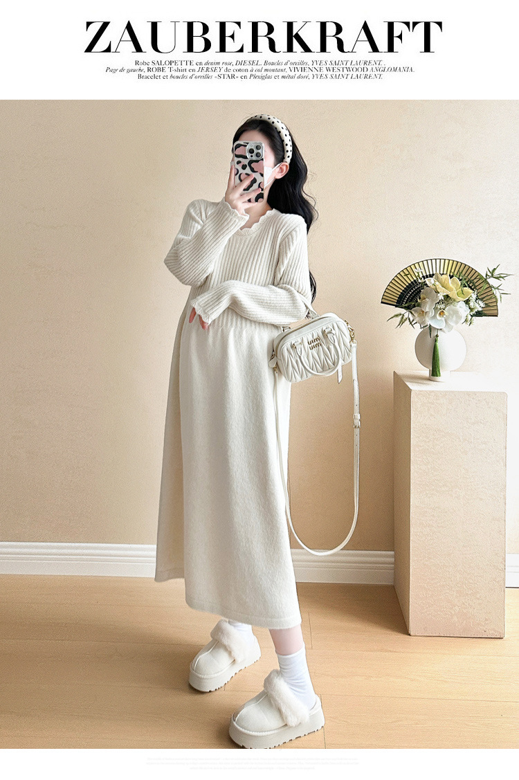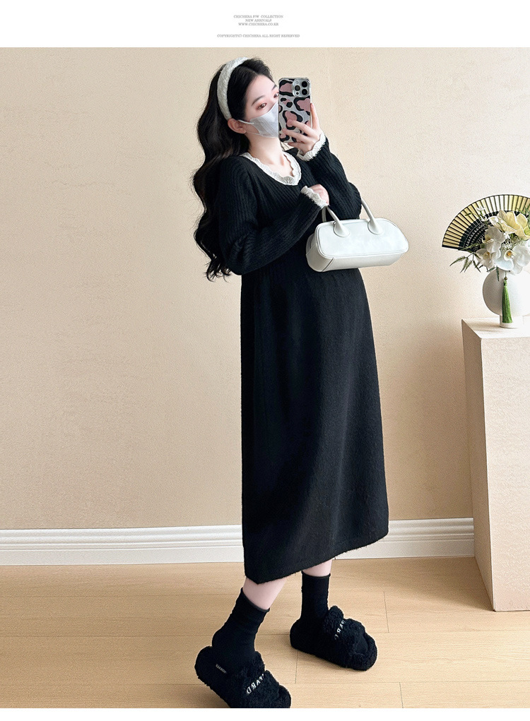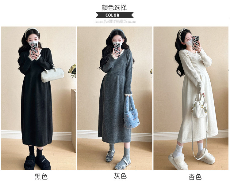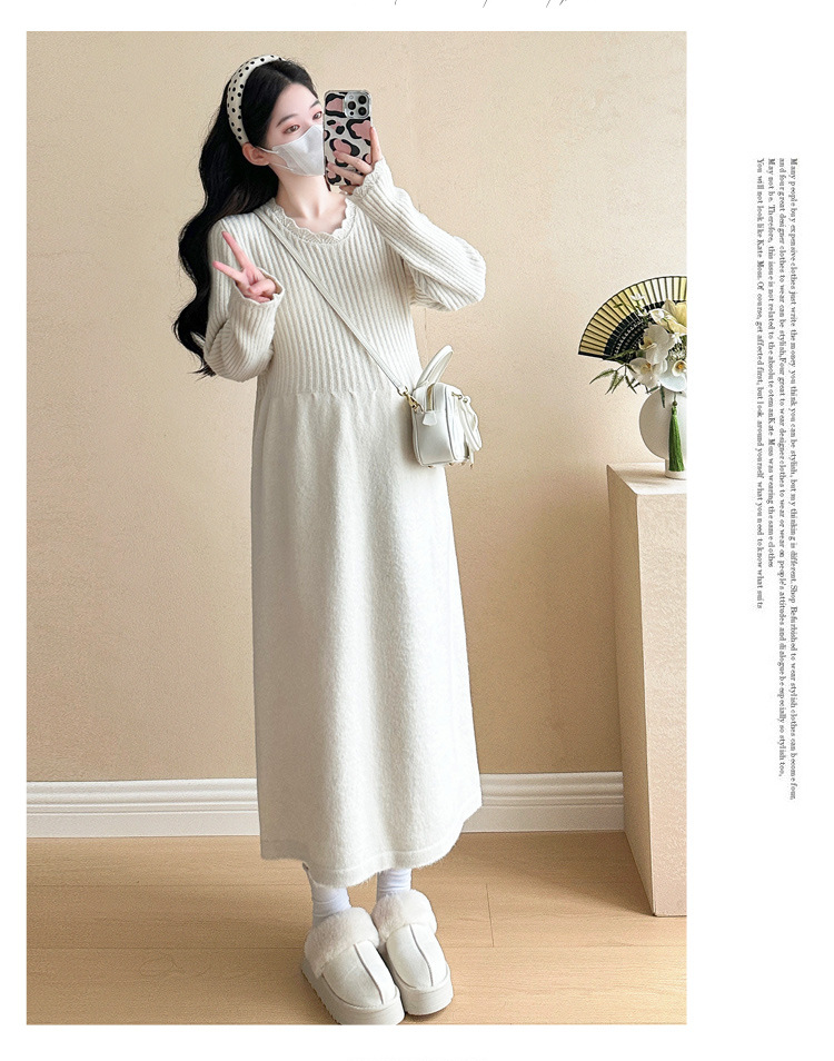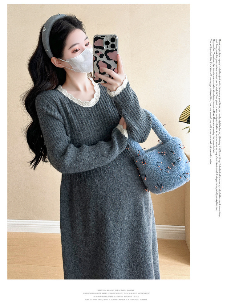 Одежда для беременных осенью и зимой трикотажное платье с длинными рукавами 2024 новая корейская версия сладкого кружева сшивания тонкая нижняя юбка