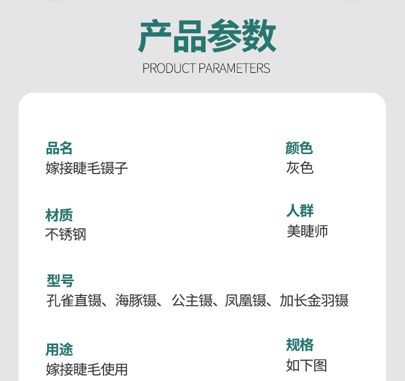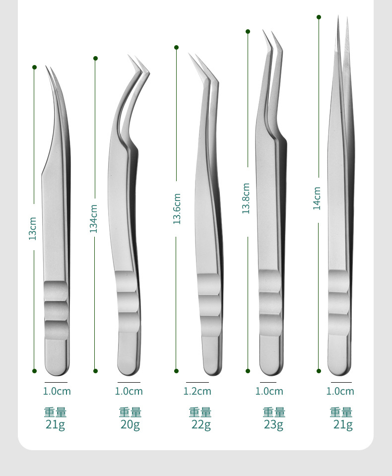 Пинцет Phoenix (универсальный пинцет); Пинцет принцессы; Пинцет для пингвинов; Пинцет Дельфин; Пинцет с золотыми перьями; короткое золотое перо; Пинцет прямой павлин; пинцет-бабочка; 7-фигурный пинцет; Пинцет феникса с длинным горлышком; Зажим для ячеек; Пинцет для разделения волос с пескоструйной обработкой; Пинцет Phoenix с пескоструйной обработкой; Пинцет принцессы с пескоструйной обработкой; Пинцет с пескоструйной обработкой; Пинцет для дельфинов с пескоструйной обработкой; Пинцет из золотых перьев с пескоструйной обработкой; Пинцет с пескоструйной обработкой павлина; Пинцет-бабочка с пескоструйной обработкой; Пинцет с 7 символами, обработанный пескоструйной обработкой