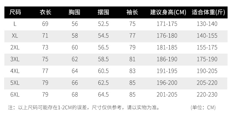 L-130-140; XL-140-155; 2XL-155-175; 3XL-175-190; 4XL-190-205; 5XL-205-220; 6XL-220-230