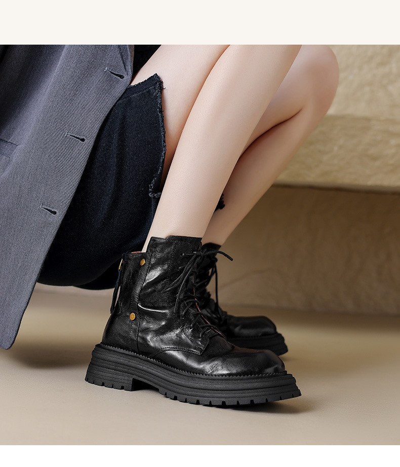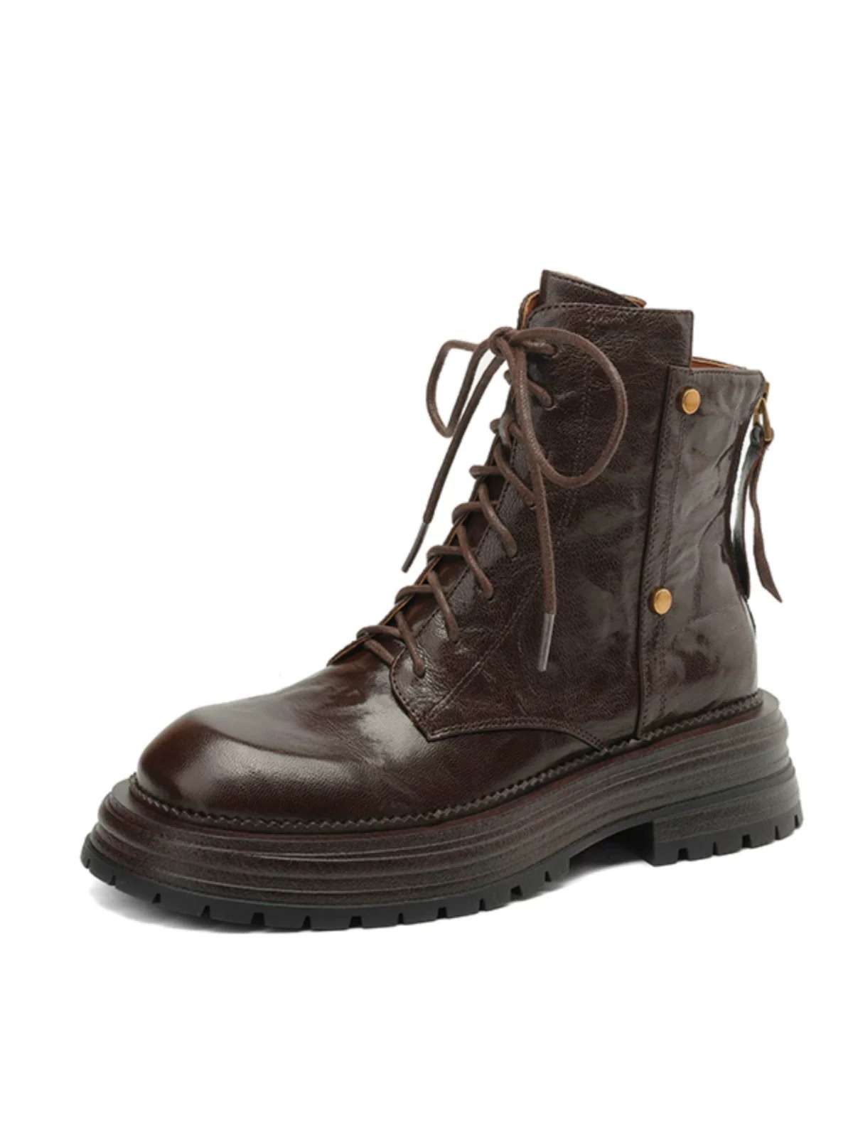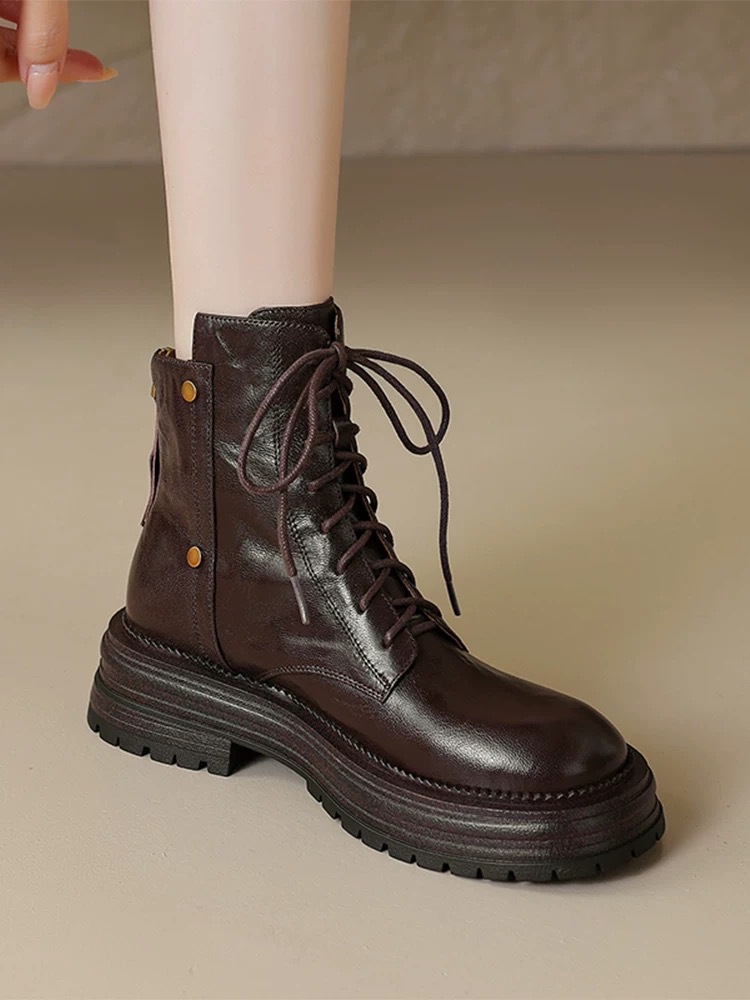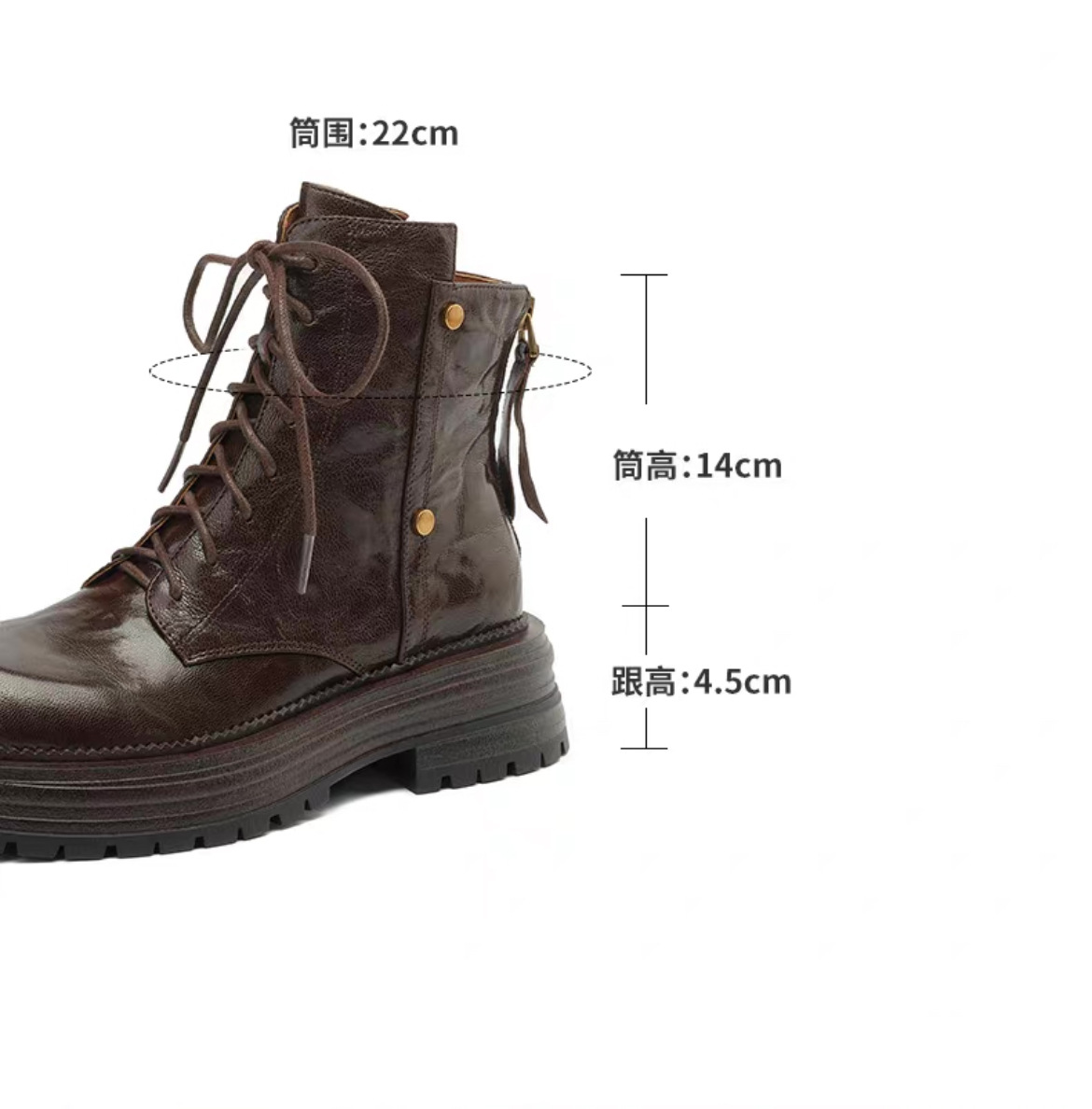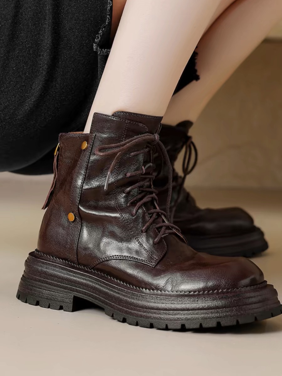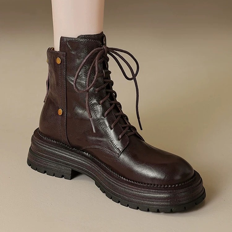 Qiangshengda ~ европейские и американские коричневые короткие сапоги из ручной кожи на толстой подошве для женщин, осенне-зимние сапоги в британском стиле с круглым носком 2024 года.