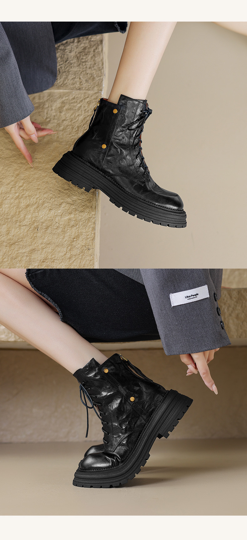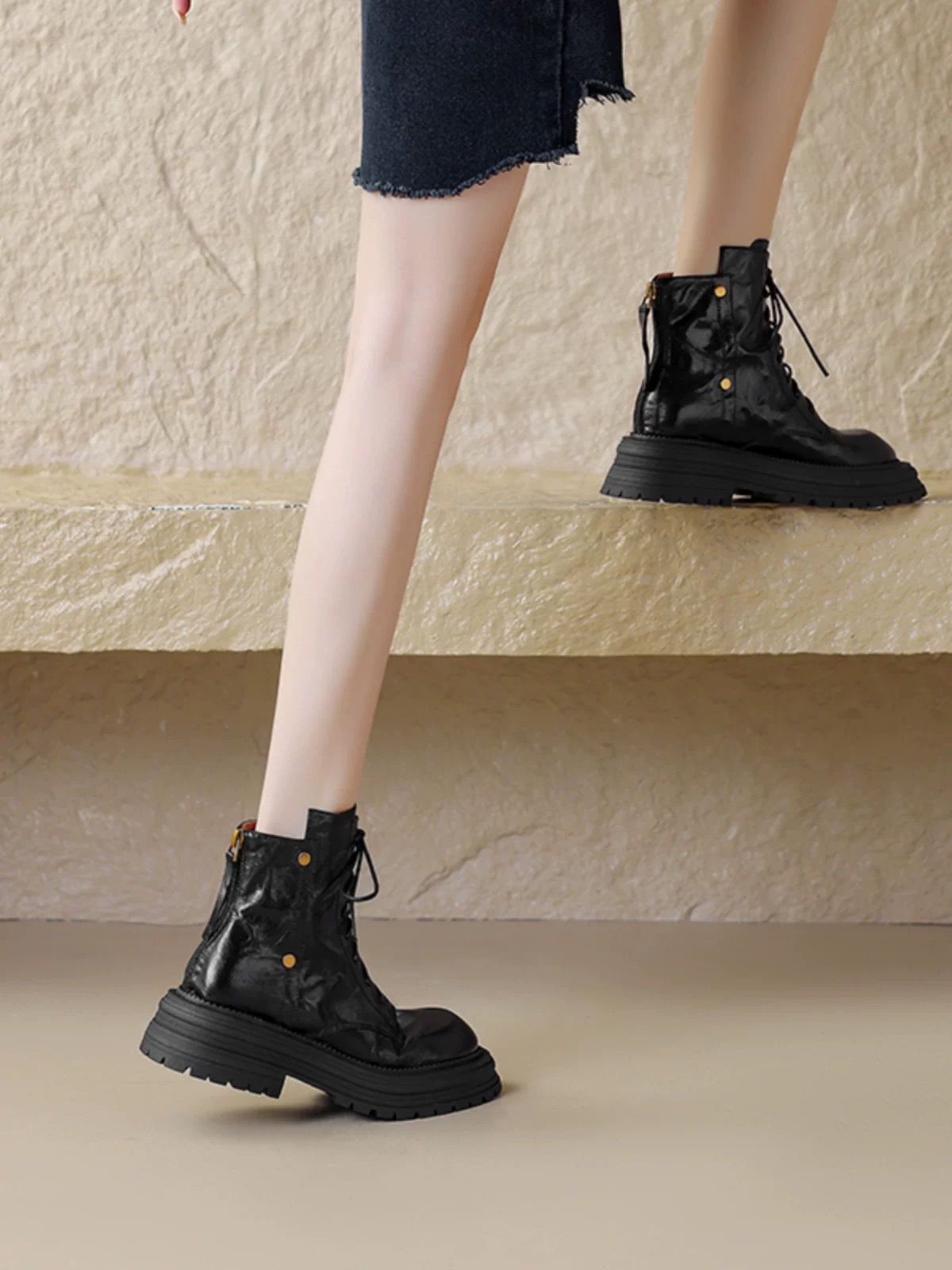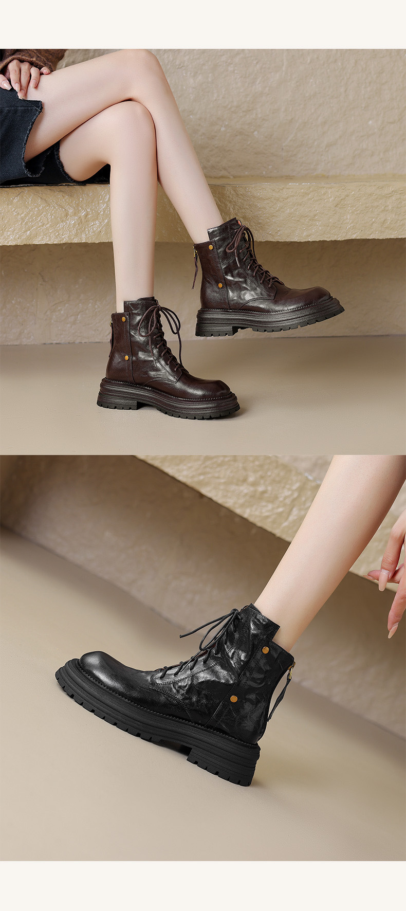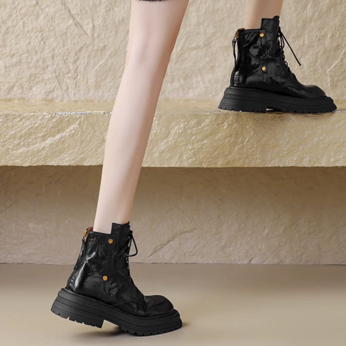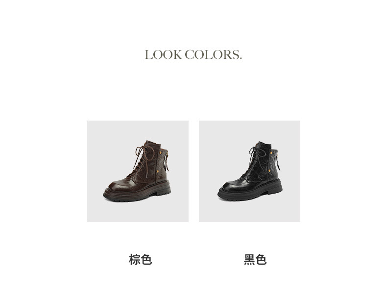 Qiangshengda ~ европейские и американские коричневые короткие сапоги из ручной кожи на толстой подошве для женщин, осенне-зимние сапоги в британском стиле с круглым носком 2024 года.