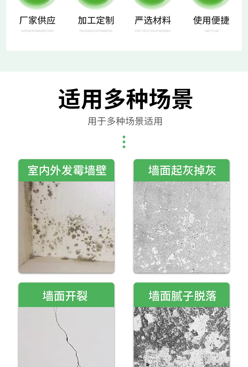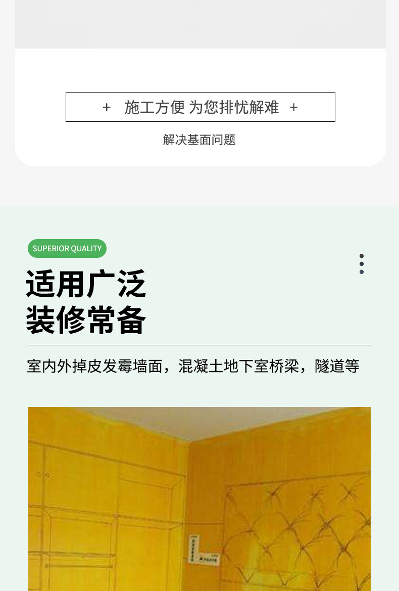 Подходит для базовой обработки цементных стеновых полов, штукатурных стен и других базовых слоев. Он выполняет функции герметизации базового слоя, предотвращения попадания влаги и плесени, укрепления базового слоя и улучшения адгезии.
