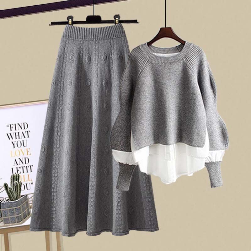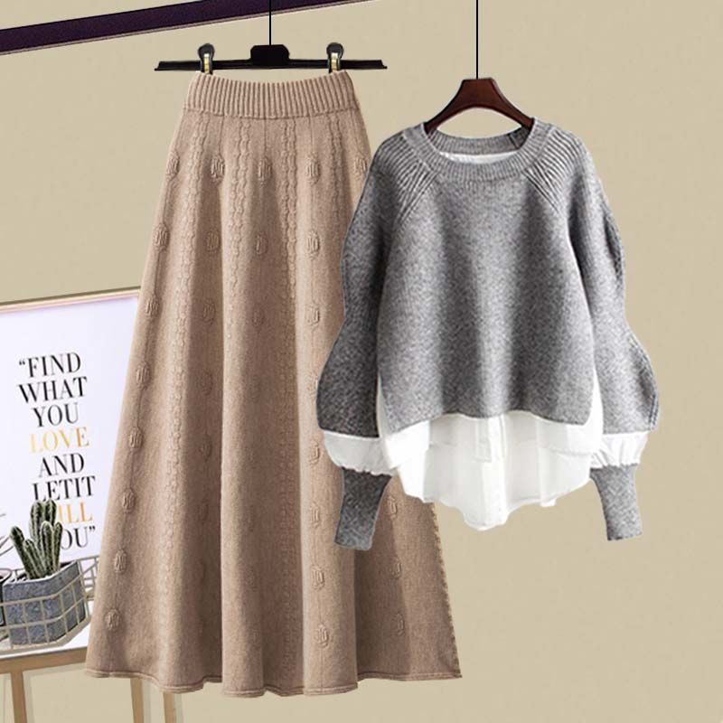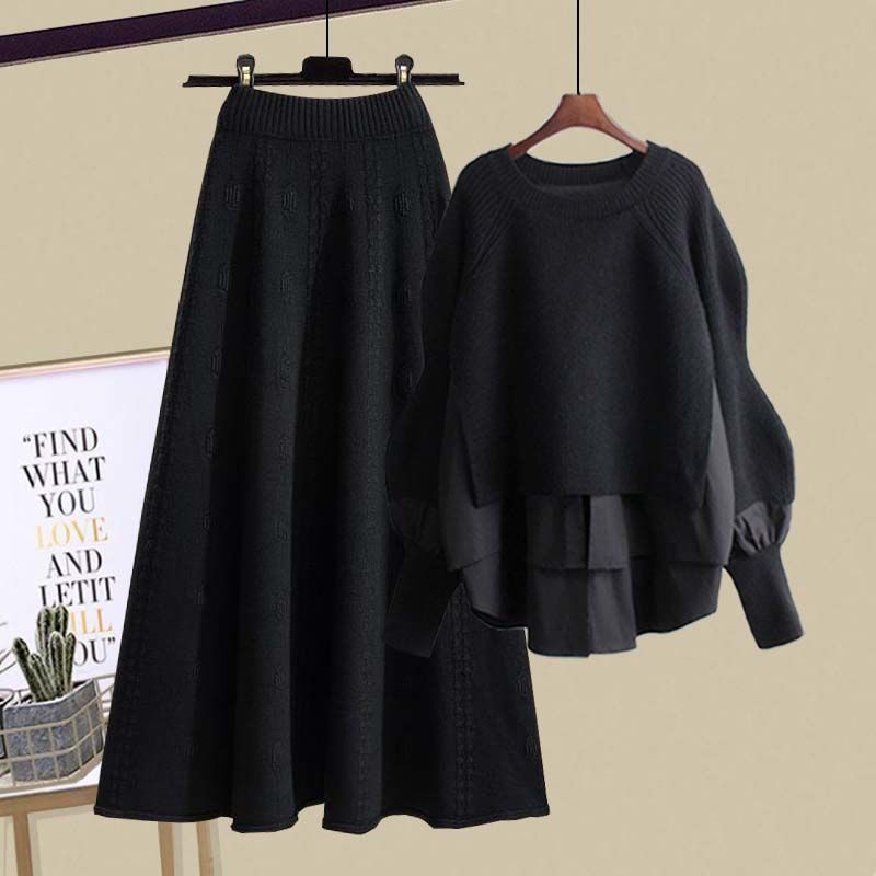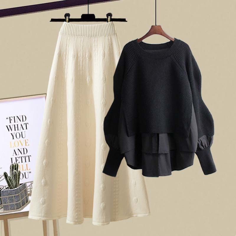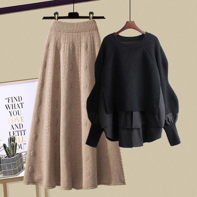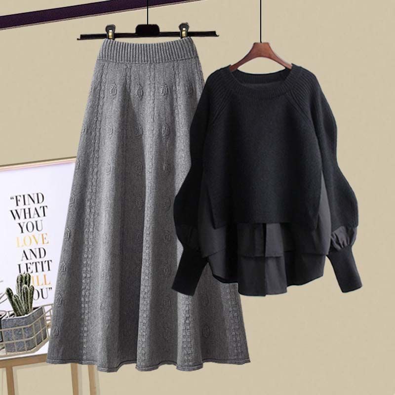 Зимний наряд для женщин больших размеров 2025 года: новый облегающий вязаный комплект из двух предметов (свитер и юбка) для молодежного образа.