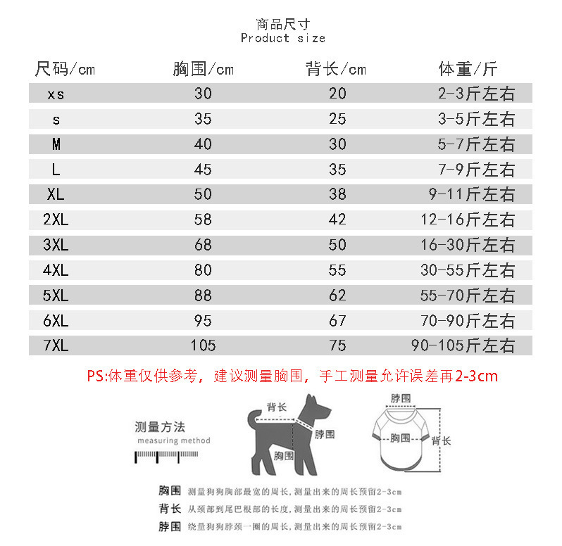 XS (обхват груди 30 см 0.5-1.5kg домашнее животное); S (обхват груди 35 см 1.5-2.5kg); М (обхват груди 40 см 2.5-4kg); L (обхват груди 45 см 4-5.5kg); 5XL (размер груди 88 Длина спины 62 27.5-35kg); 6XL (размер груди 95, длина спины 67 35-42.5kg); 7XL (обхват груди 105 см 45-52.5kg); XL (обхват груди 52 см 5.5-7.5kg); 2XL (обхват груди 58 см 7.5-11kg); 3XL (размер груди 68 см 11-17.5kg); 4XL (обхват груди 78 см 17.5-27.5kg)