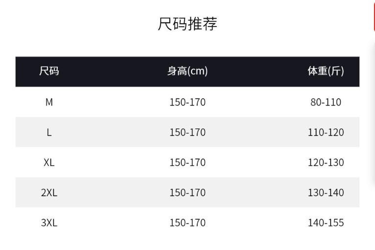 Рекомендация M 35-42.5kg; Рекомендации L 42.5-50kg; Рекомендуется XL 50-57.5kg; Рекомендуется XXL 57.5-65kg; Рекомендуется 3XL 65-72.5kg; Рекомендуется 4XL 72.5-80kg