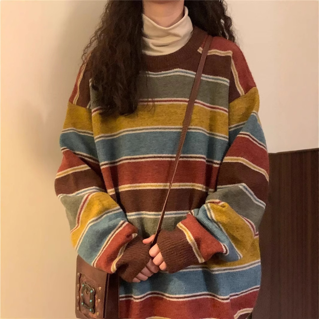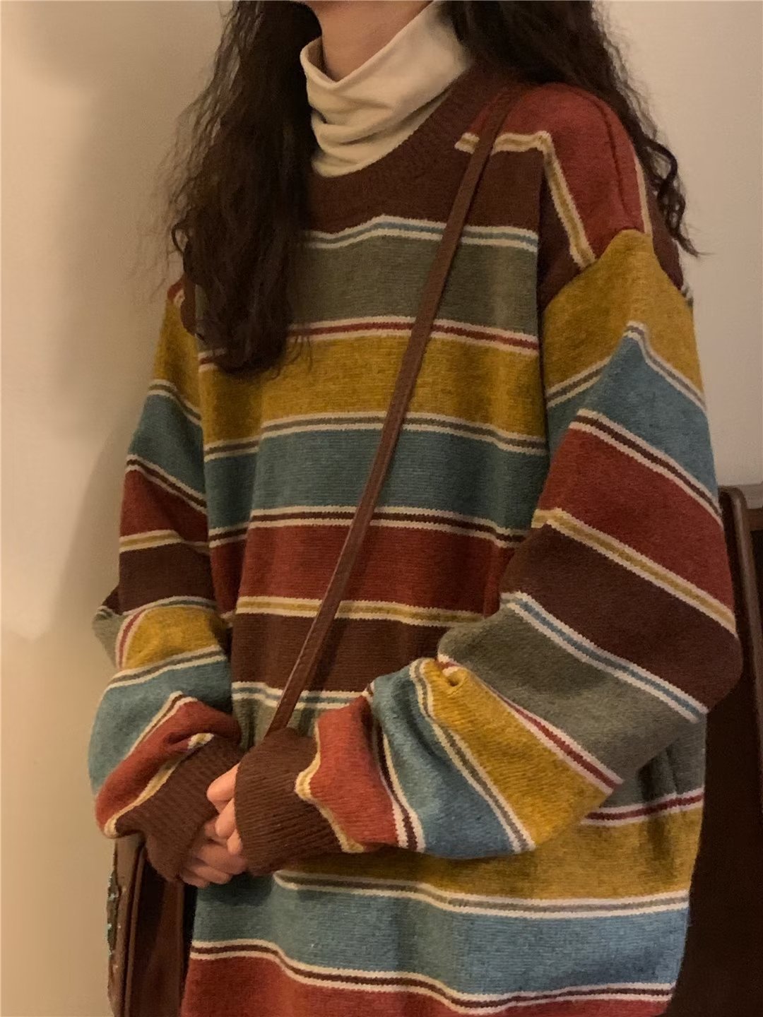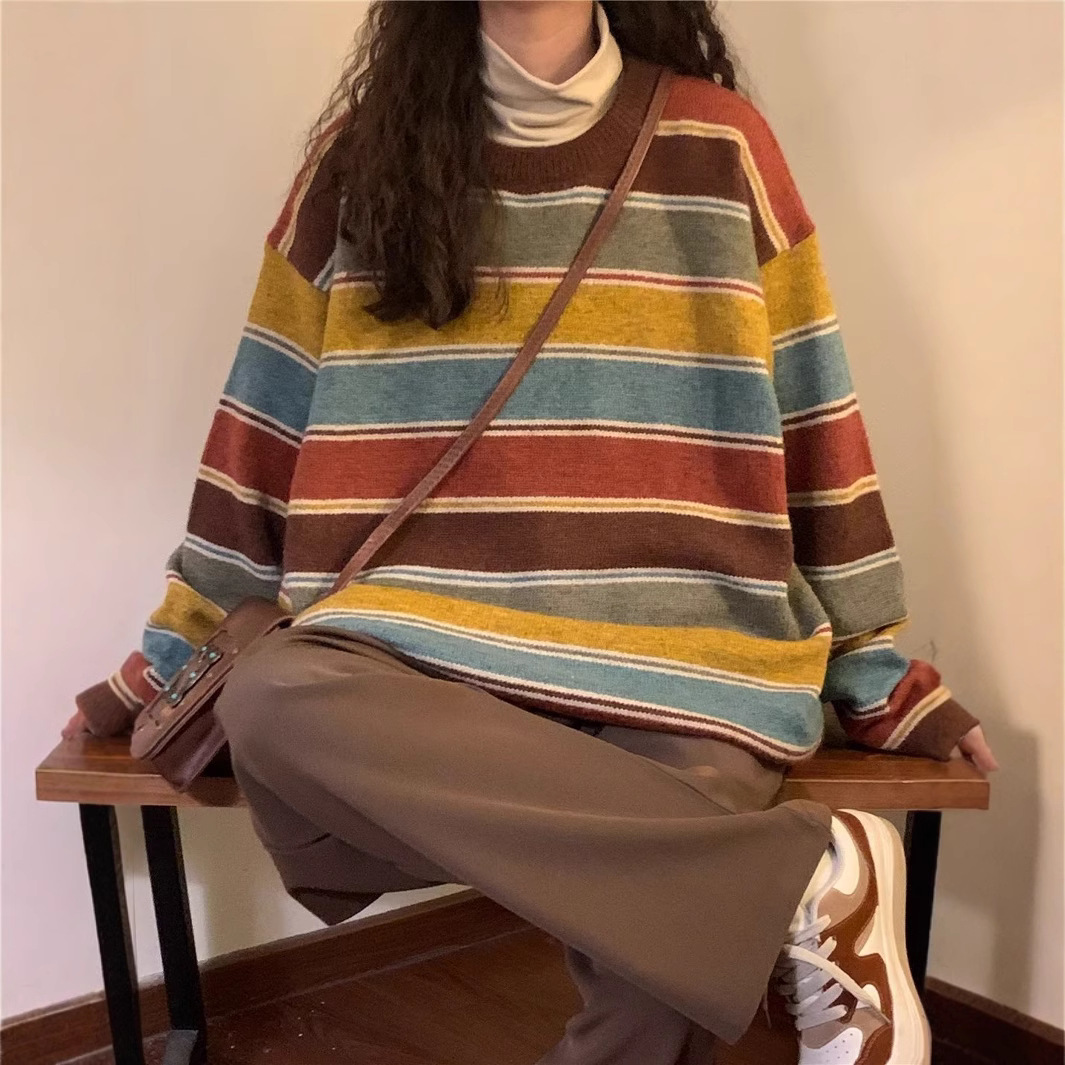 Женский свитер в стиле кэжуал с цветными блоками и разноцветными полосками, новинка осени-зимы 2025 года, универсальный вязаный топ с длинным рукавом в стиле «солт».