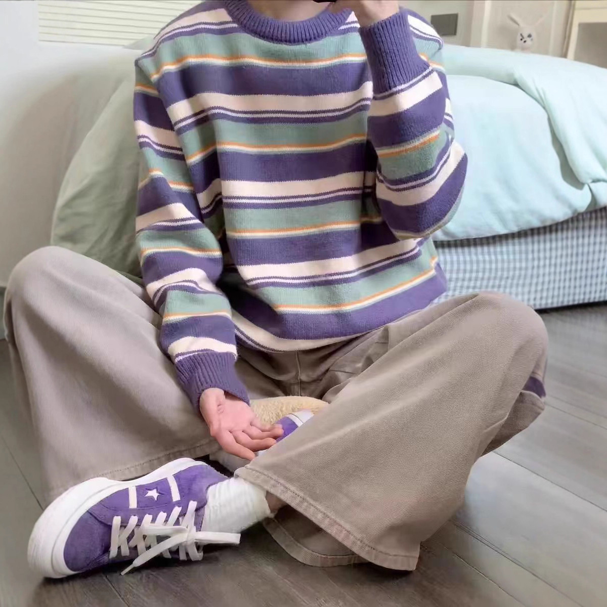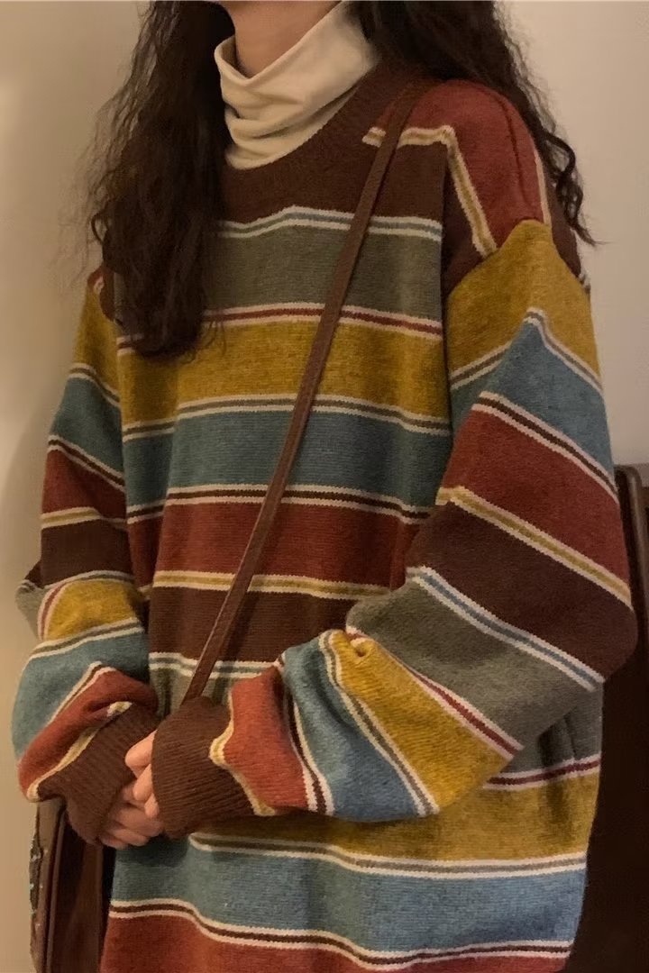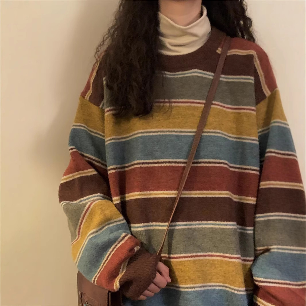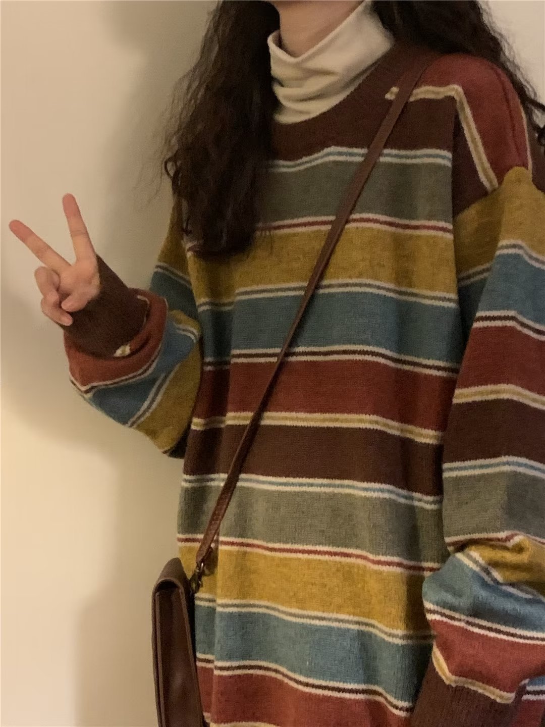 Женский свитер в стиле кэжуал с цветными блоками и разноцветными полосками, новинка осени-зимы 2025 года, универсальный вязаный топ с длинным рукавом в стиле «солт».