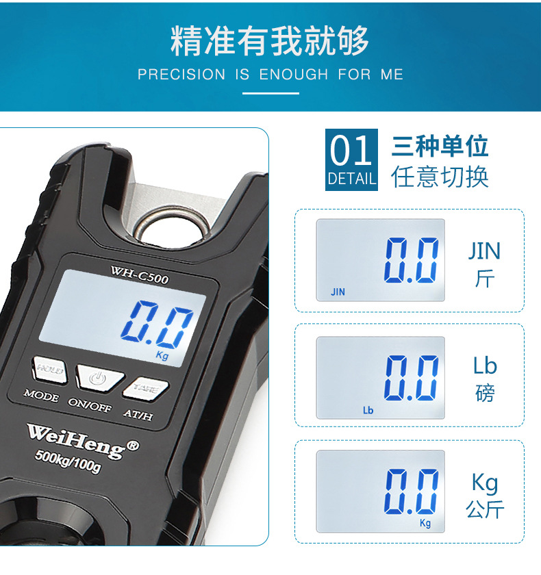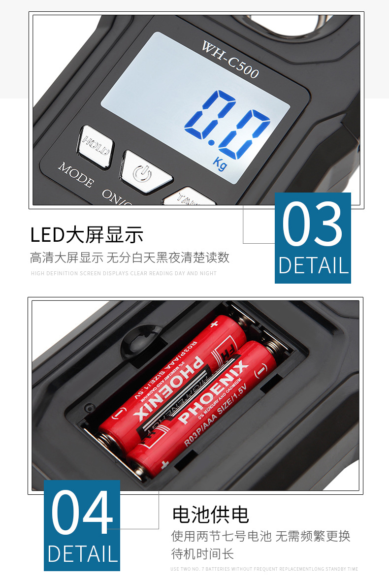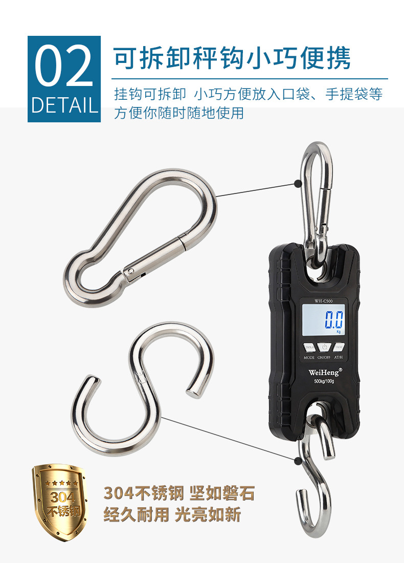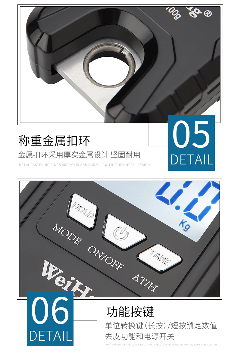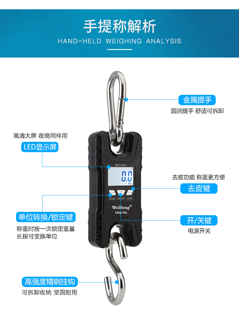2. 特点:超大量程;全视角LCD液晶;高档白色LED背光;加粗精钢挂钩,电镀按键;双色选择