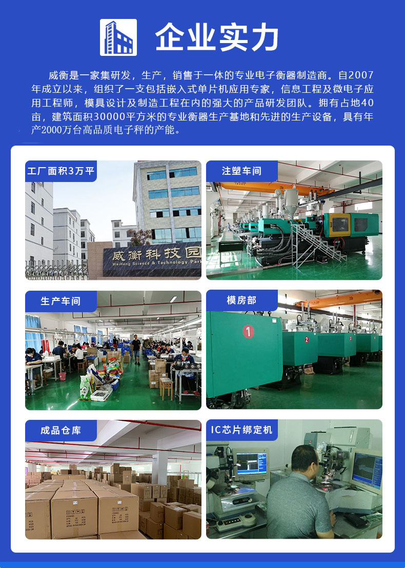 威衡是一家集研发,生产,销售于一体的专业电子衡器制造商。自2007年成立以来,组织了一支包括嵌入式单片机应用专家,信息工程及微电子应用工程师,模具设计及制造工程在内的强大的产品研发团队。拥有占地40亩,建筑面积30000平方米的专业衡器生产基地和先进的生产设备,具有年产2000万台高品质电子秤的产能。