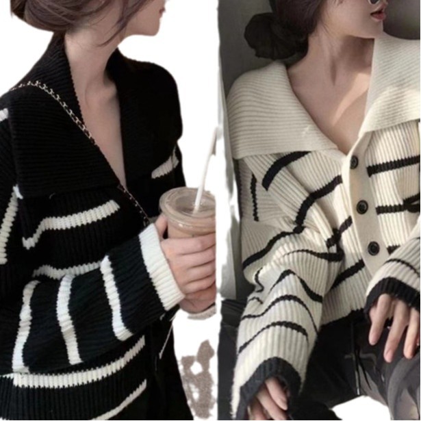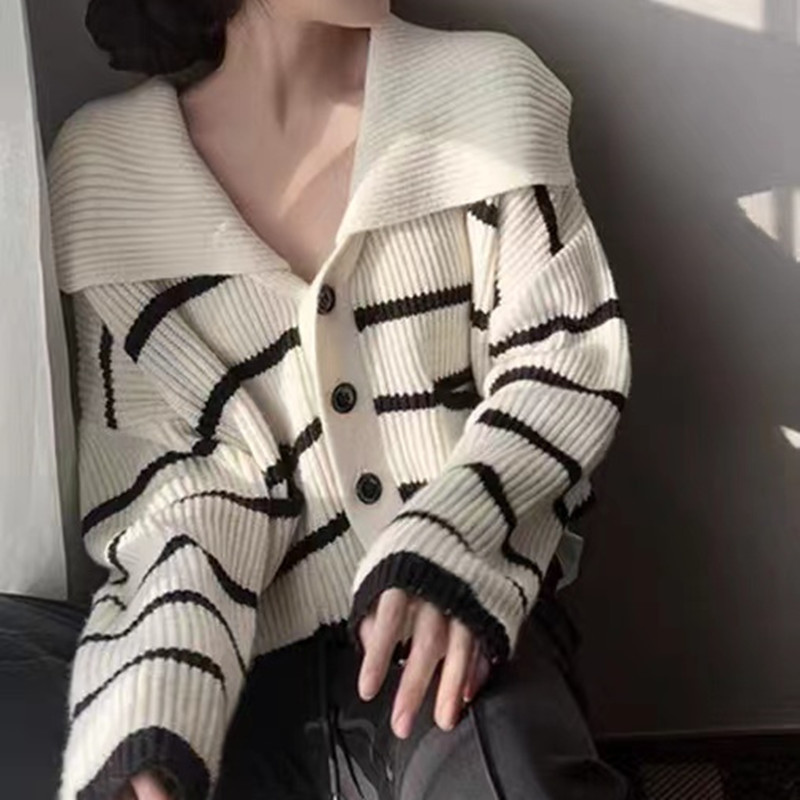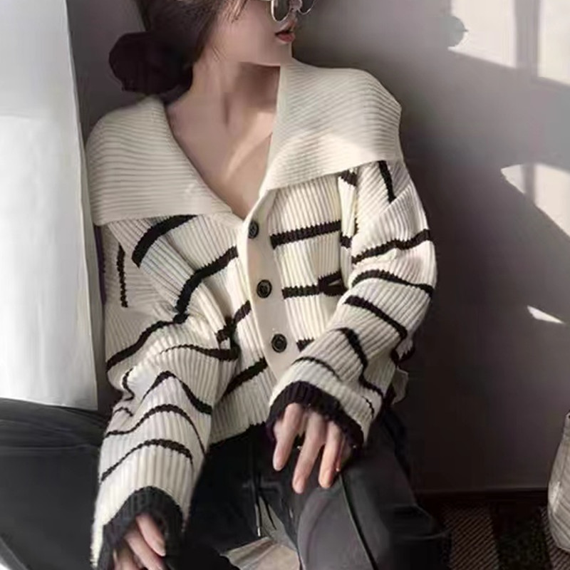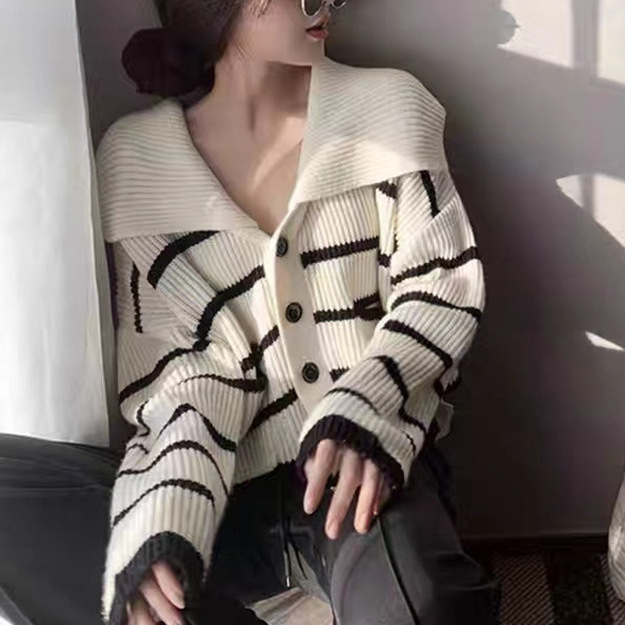 В полоску трикотажный кардиган свитер куртка женский 2025 весна и осень новый свободный отворот