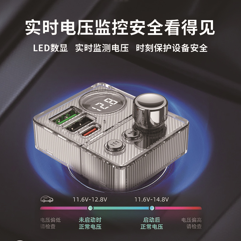 9:硬件功能:FM发射、蓝牙、USB充电、读U盘. 电压显示/ 彩色灯,QC3.0+PD双快充功能。