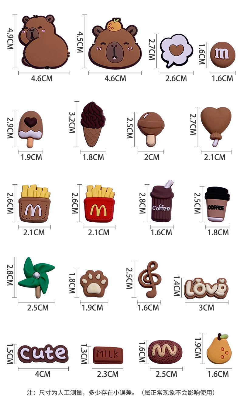 Мягкий клей: искусственная кожа PP [4,9*4,6 см]; Мягкий клей: верхняя оранжевая карта кожа [4,5*4,6 см]; Мягкий клей: коричневый картофель фри [2,6*2,1 см]; Мягкий клей: красная картофель фри [2,6*2,1 см]; Мягкий клей: Love Esicle [2,9*1,9 см]; Мягкий клей: хлеб [1,6*2,5 см]; Мягкий клей: любовь [1,4*3 см]; Мягкий клей: МИЛЫЙ [1,5*4 см]; Мягкий клей: мороженое кофейного цвета [3,2*1,8 см]; Мягкий клей: кофе [2,8*1,6 см]; Мягкий клей: КАВЫ [2,5*1,8 см]; Мягкий клей: любовь [2,7*2,1 см]; Мягкий клей: леденца (2,5*2 см]; Мягкий клей: кошачий коготь [1,8*1,9 см]; Мягкий клей: музыкальная нота [2,5*1,6 см]; Мягкий клей: пузырьковое сердце [2,7*2,6 см]; Мягкий клей: М бобы [1,6*1,6 см]; Мягкий клей: груша [1,9*1,6 см]; Мягкий клей: MILK [1,3*2,3 см]; Мягкий клей: ветряная мельница [2,8*2,5 см]