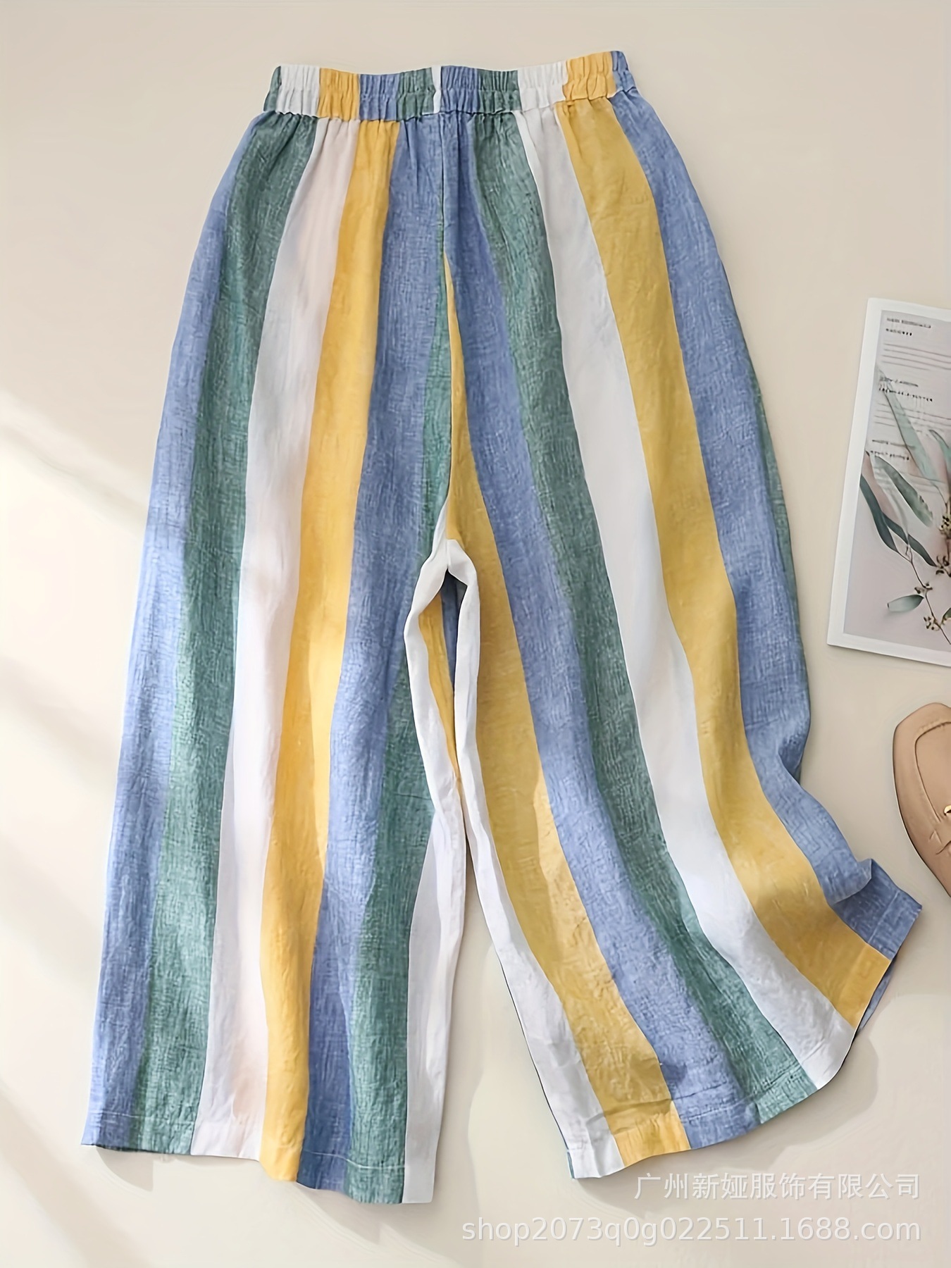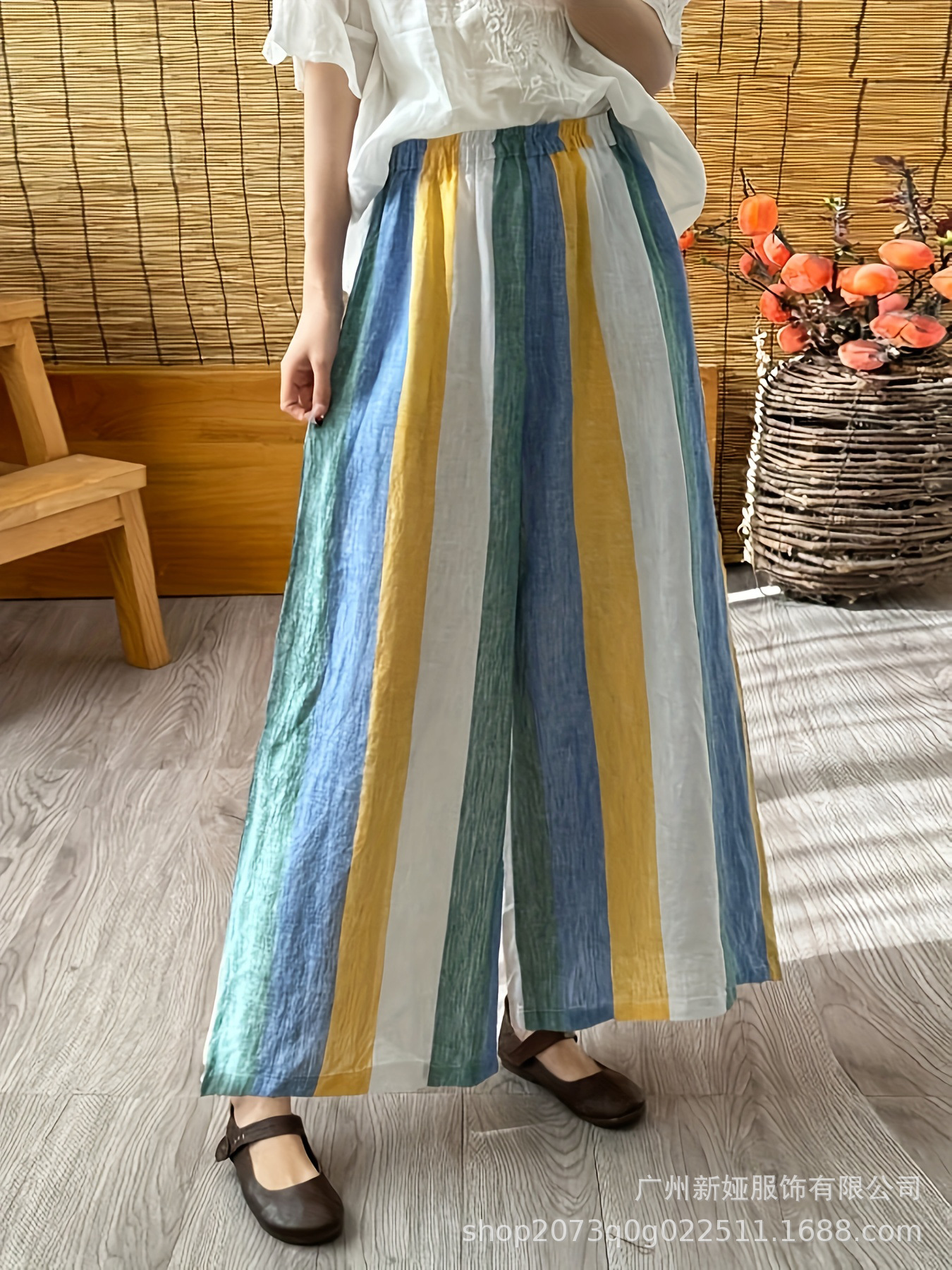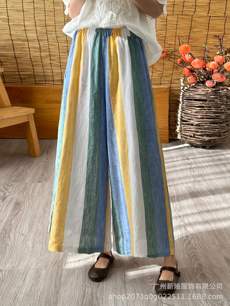 2024 цветные полосатые колотые широкие брюки большой размер конопли женская одежда