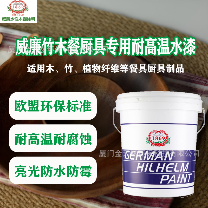 威廉竹木餐具耐高温水性木器漆环保性优异,符合欧盟和中国环保标准,可达美国FDA食品标准;漆膜具有高硬度,防水,防霉,耐高温,耐腐蚀等特性。本品对木、竹、植物纤维等餐具厨具制品或表面有饰面保护与阻隔有害物质的作用。