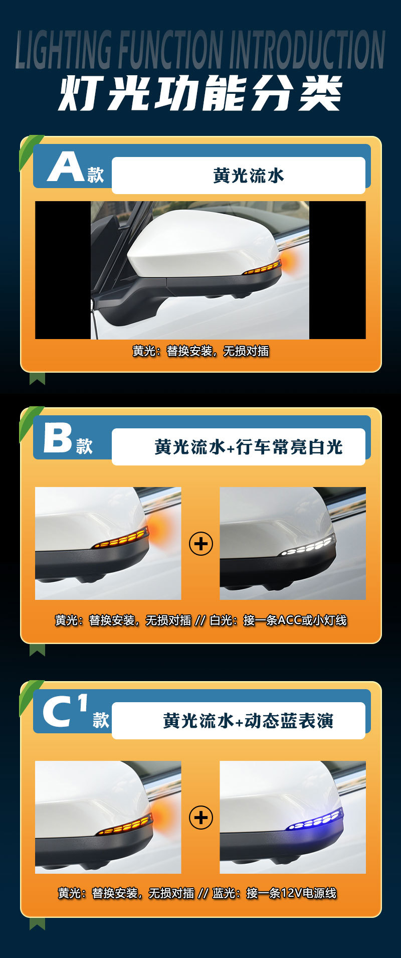 Желтая проточной свет + дневные ходовые огни с белым светом всегда включены; Токающая вода желтого света + динамический синий; Желтая свет, текущая вода + динамический синий + напольный свет; Желтый свет, текущая вода + дневные ходовые огни с белым светом, всегда включенные + динамический белый + напольный свет