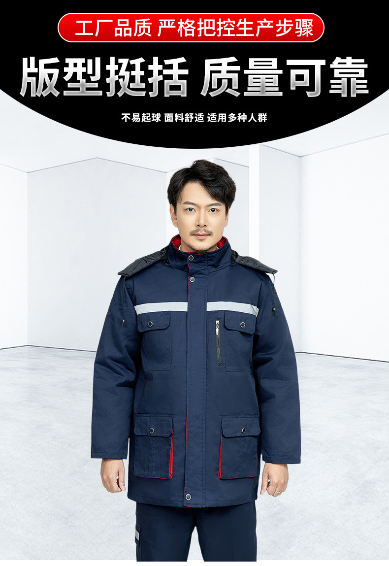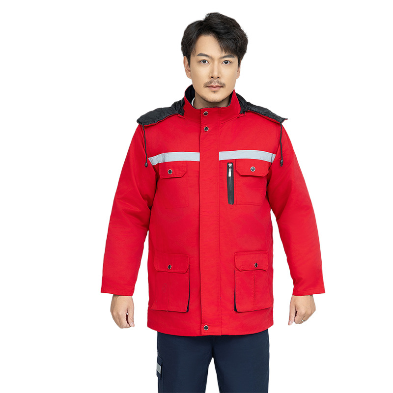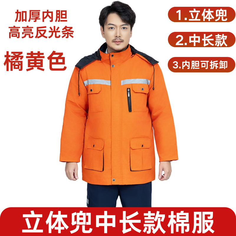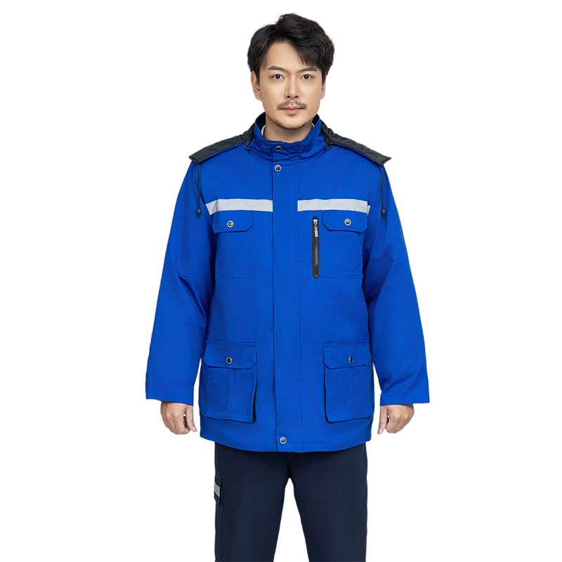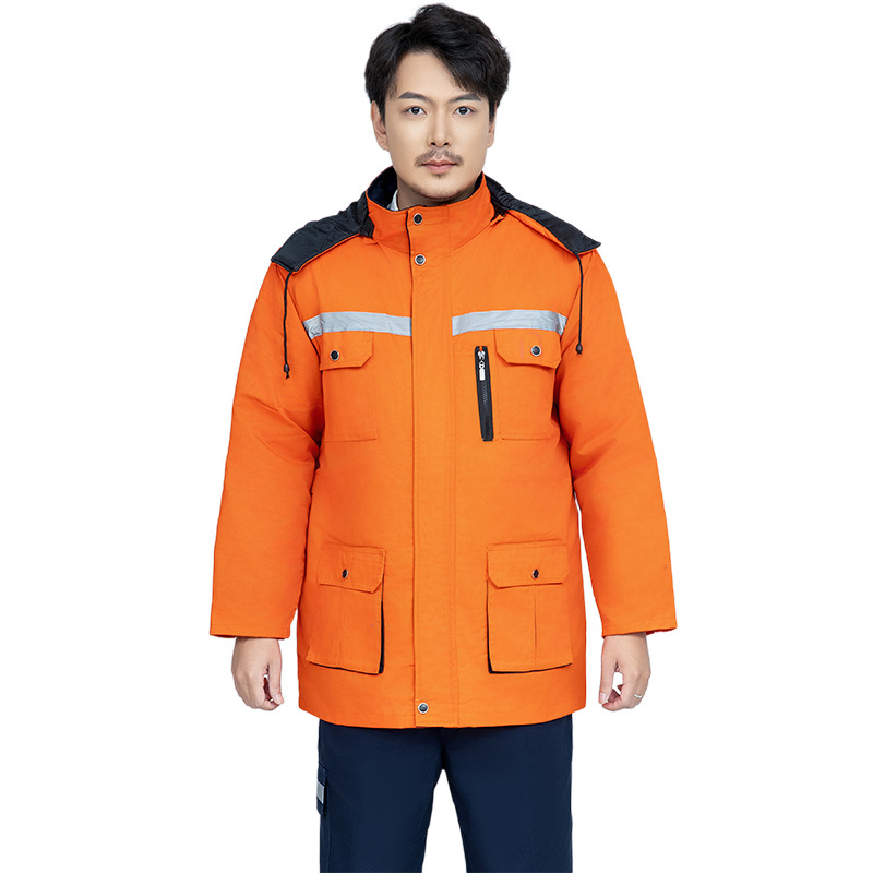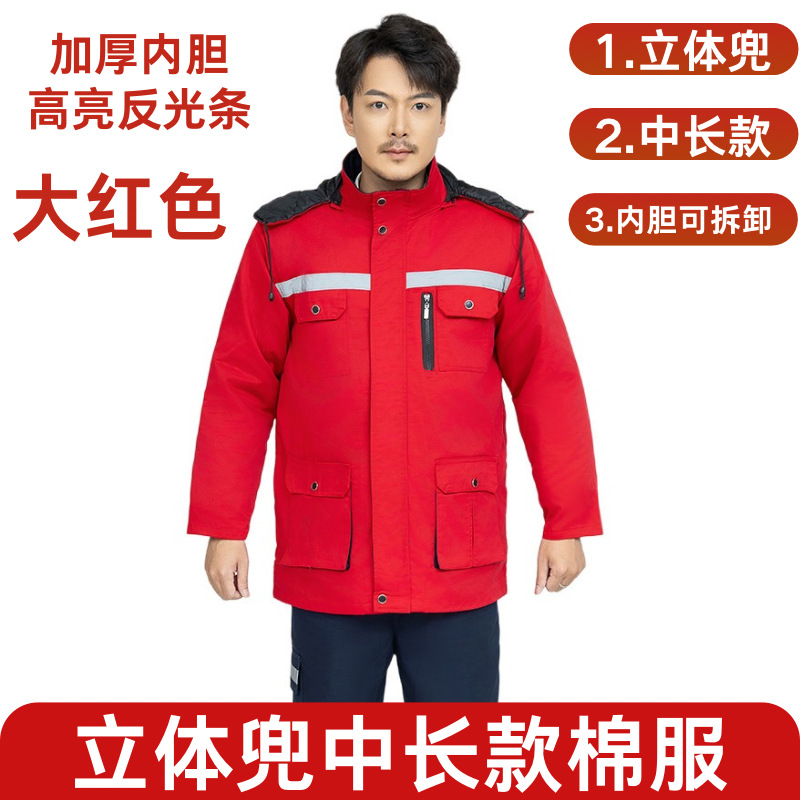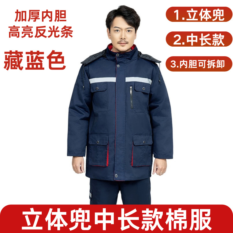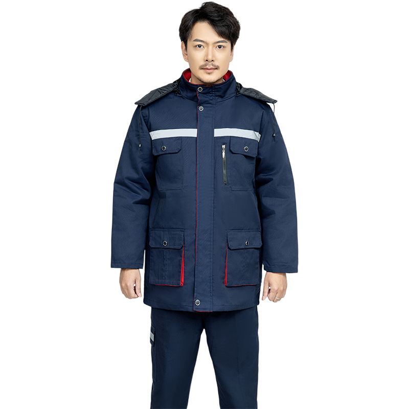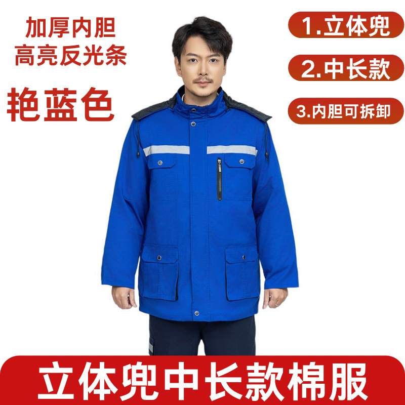 Зимнее хлопковое пальто средней длины, утепленное для защиты от холода, со съемными светоотражающими полосами, подходит для авторемонта, прочный смесовой материал полиэстер-хлопок, средней длины, съемный хлопок.