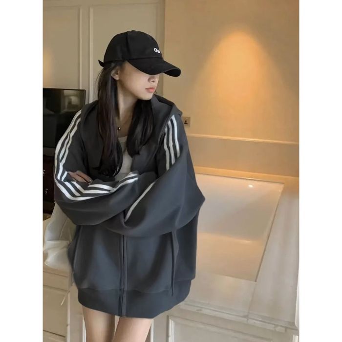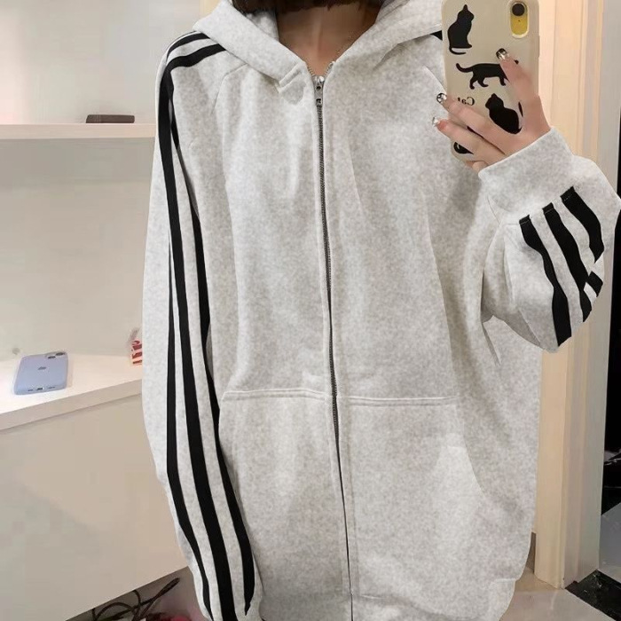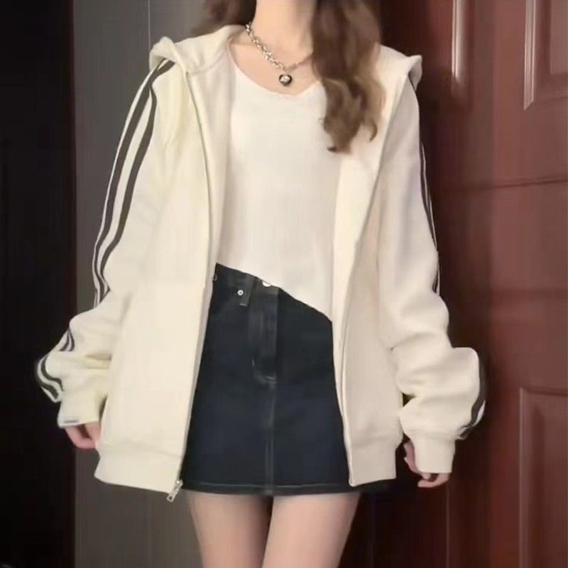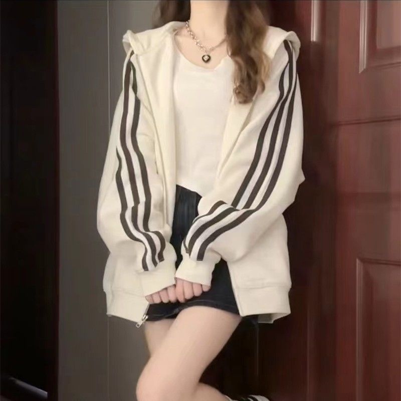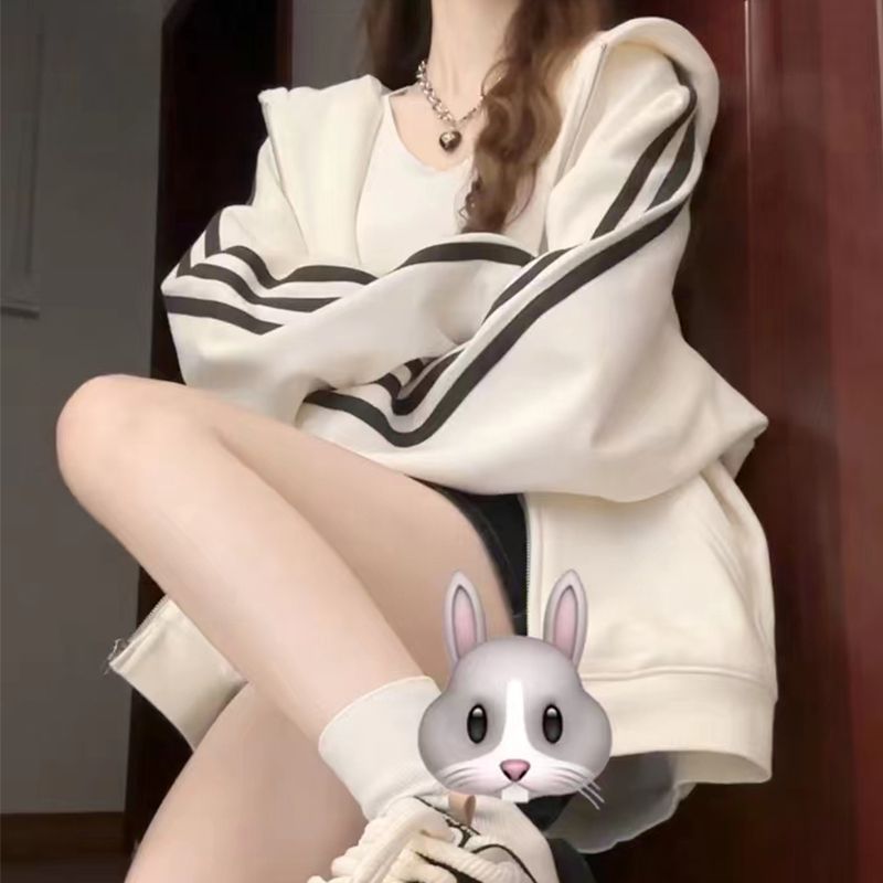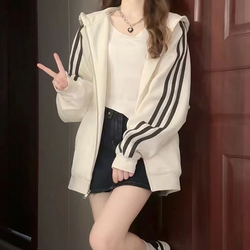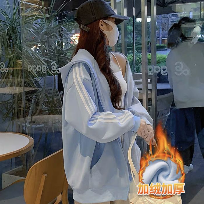 Трехполосный свитер женский маленький с капюшоном кардиган пальто осенью ленивый ветер плюшевый толстый куртка на молнии женский