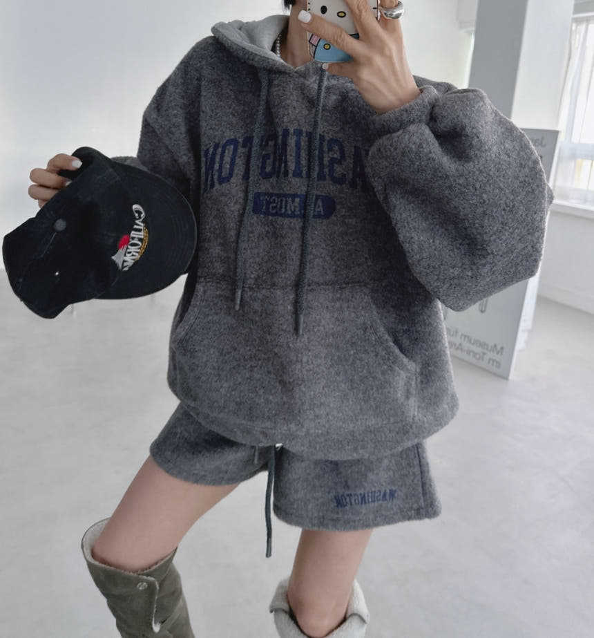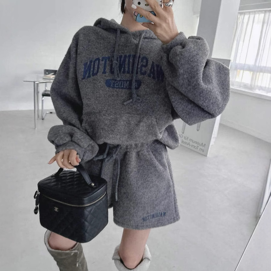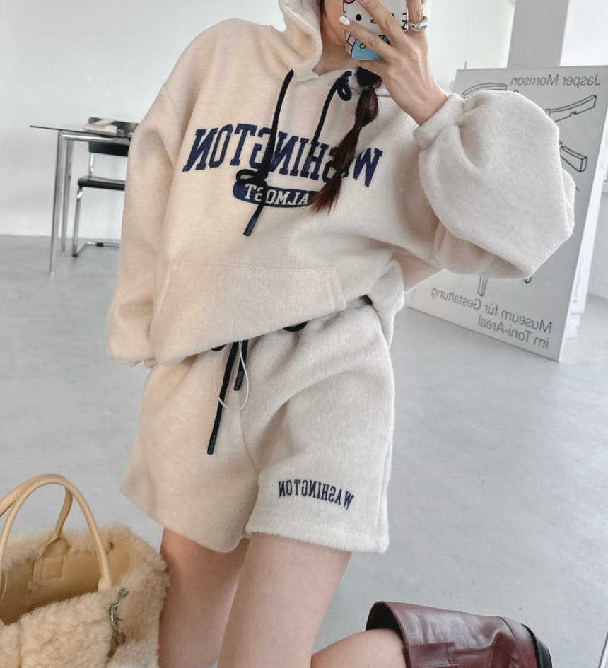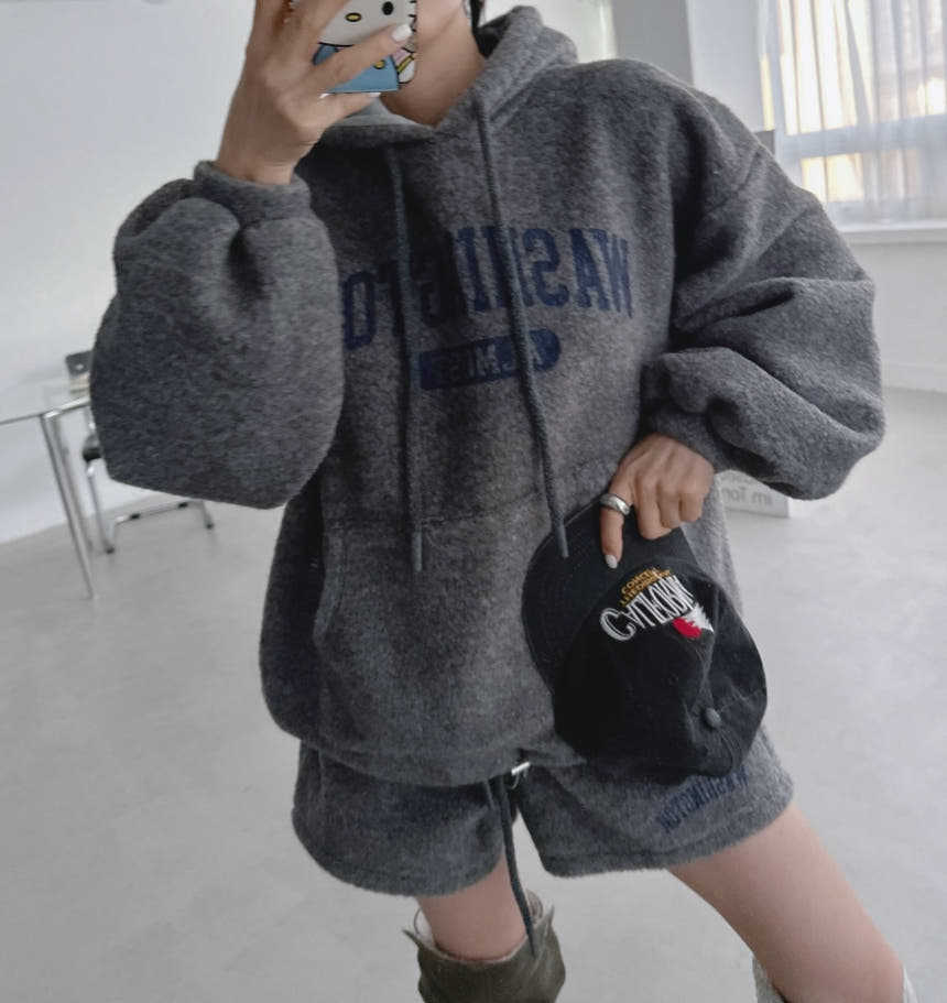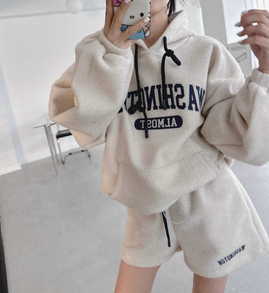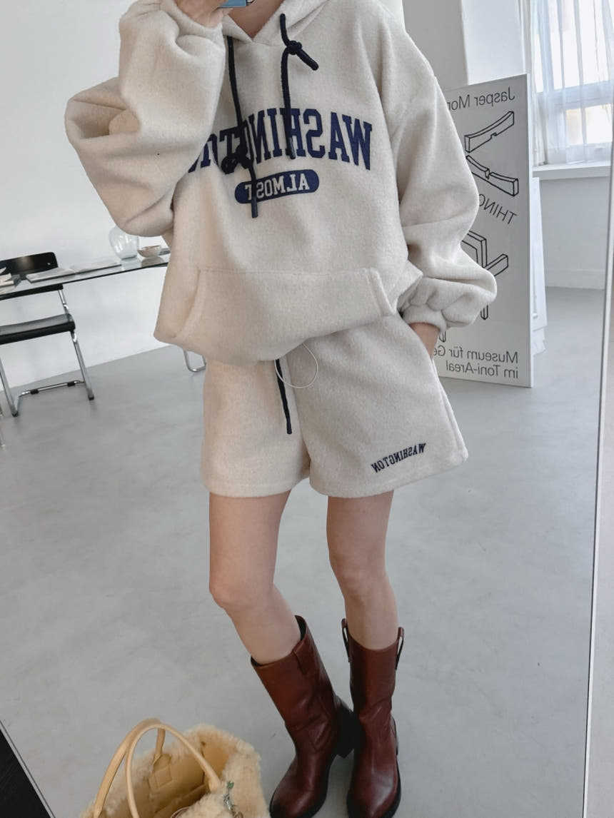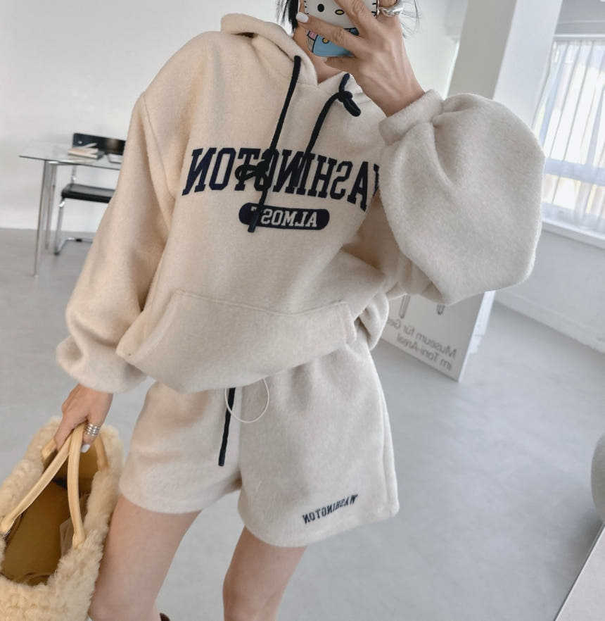 Комплект для женщин: осенне-зимний повседневный стиль, толстовка с капюшоном свободного кроя с принтом в виде букв, омолаживающая, + шорты с завышенной талией на завязках.