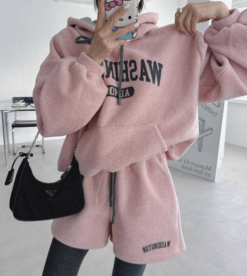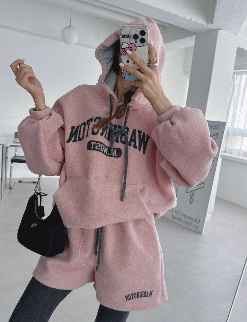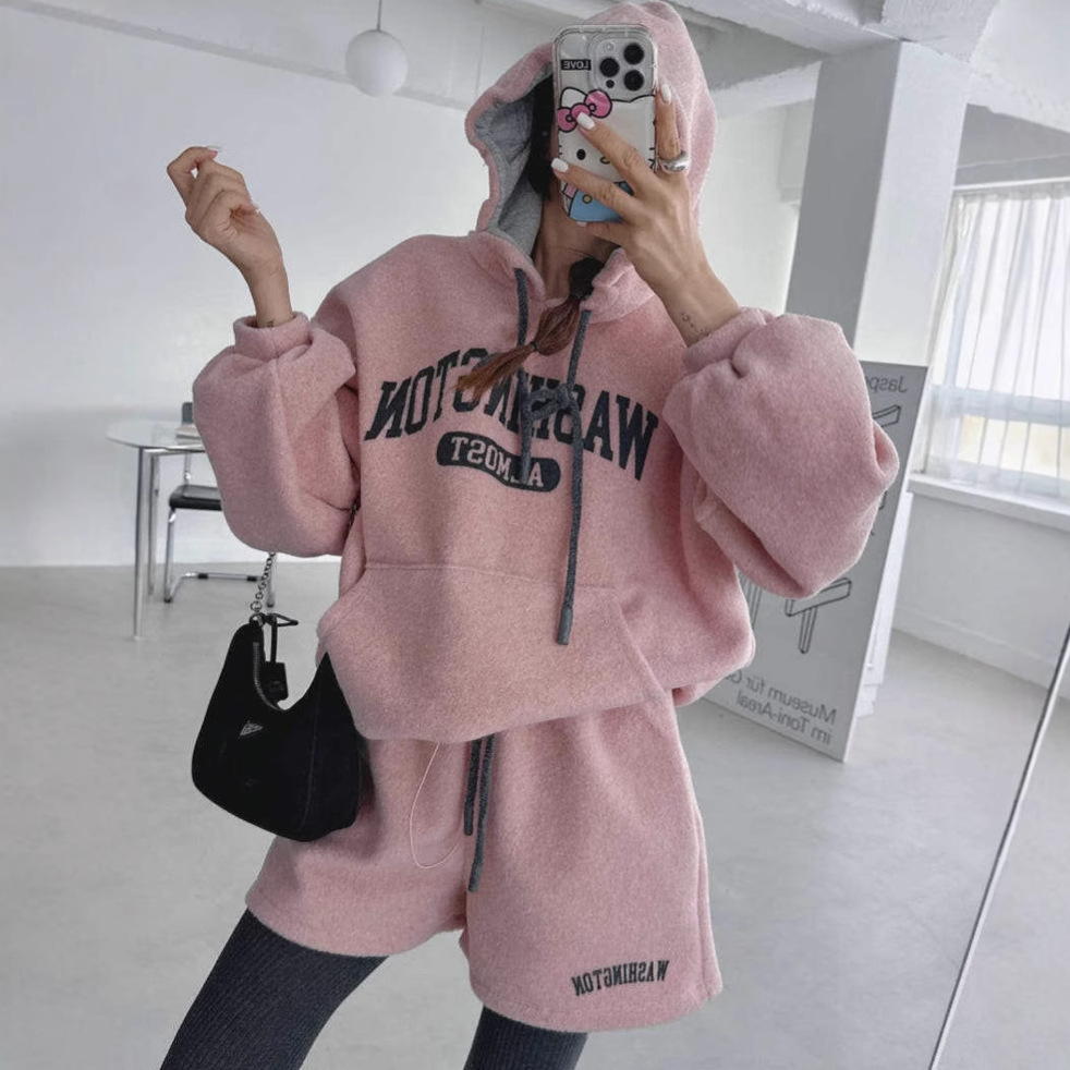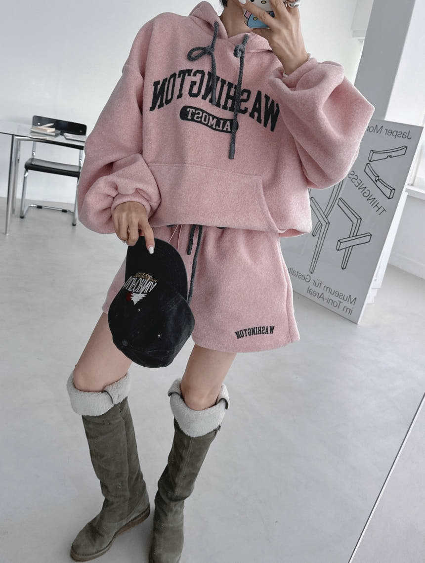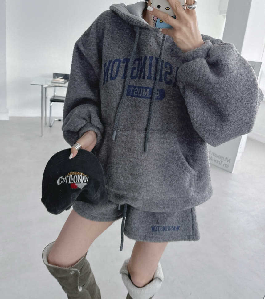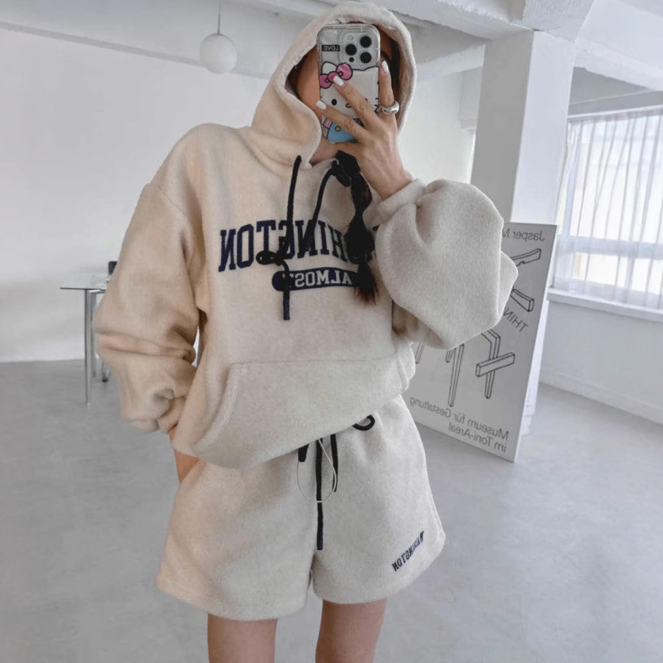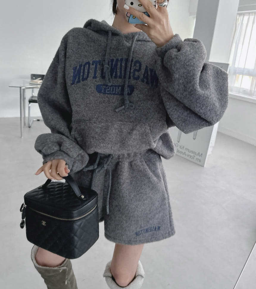 Комплект для женщин: осенне-зимний повседневный стиль, толстовка с капюшоном свободного кроя с принтом в виде букв, омолаживающая, + шорты с завышенной талией на завязках.