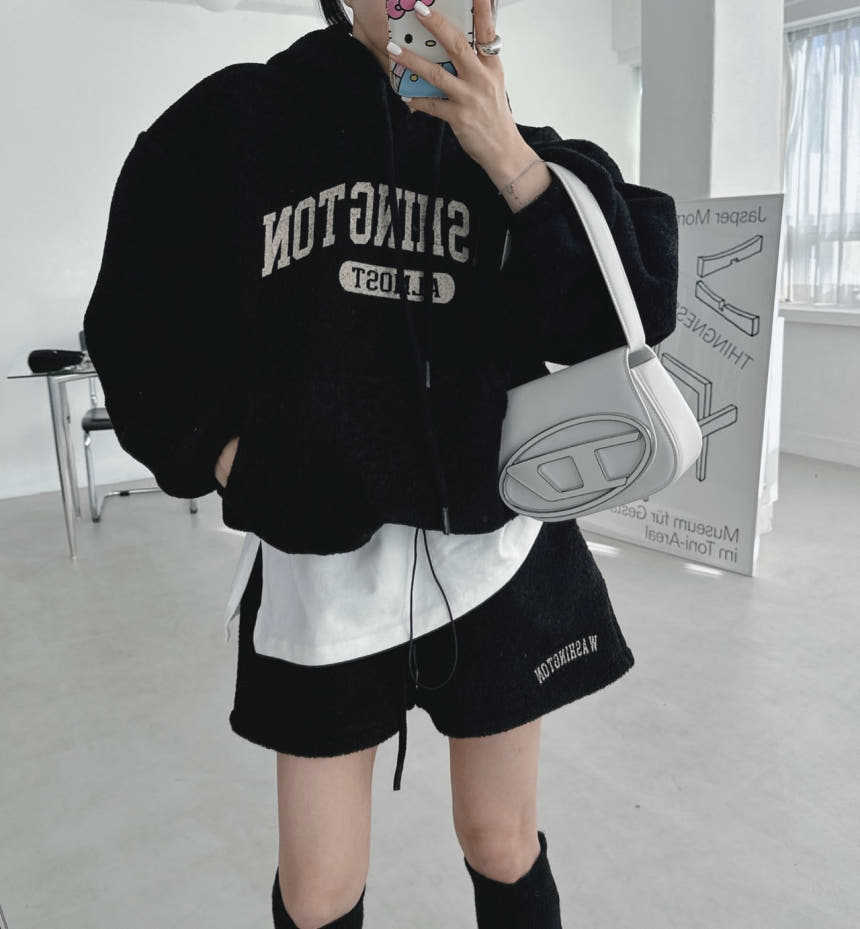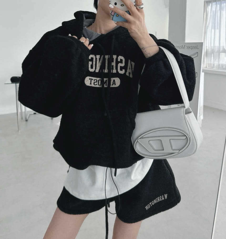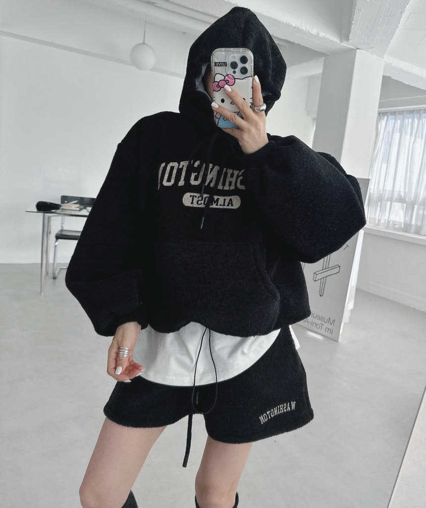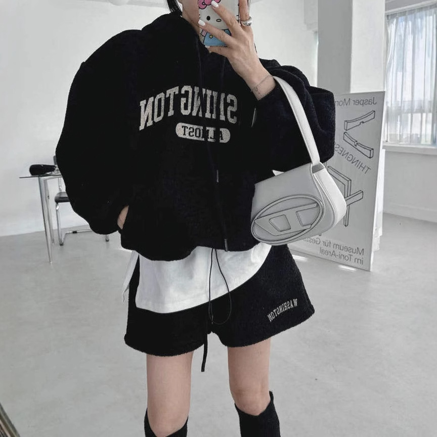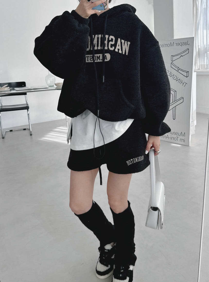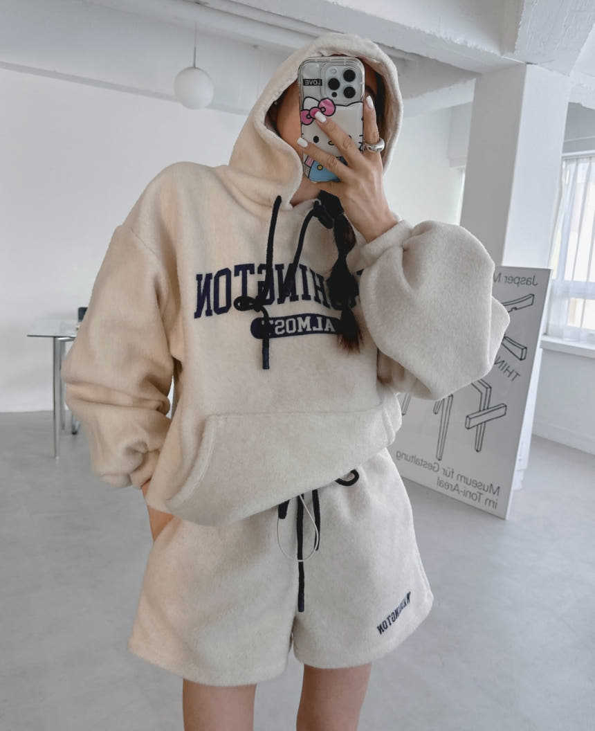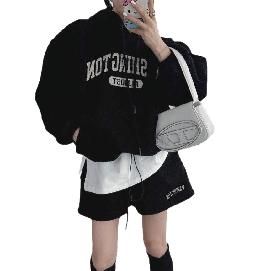 Комплект для женщин: осенне-зимний повседневный стиль, толстовка с капюшоном свободного кроя с принтом в виде букв, омолаживающая, + шорты с завышенной талией на завязках.