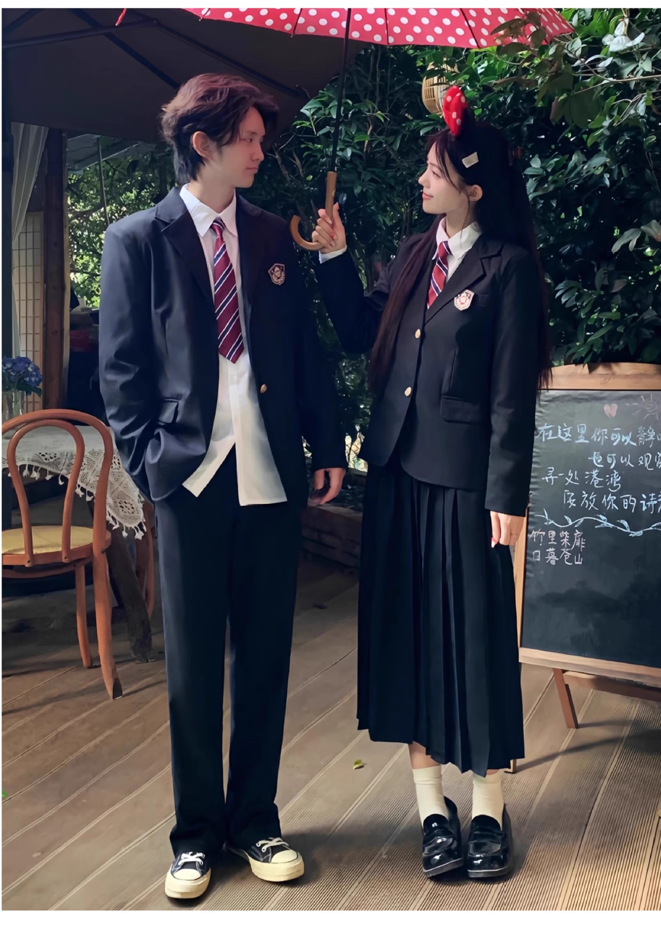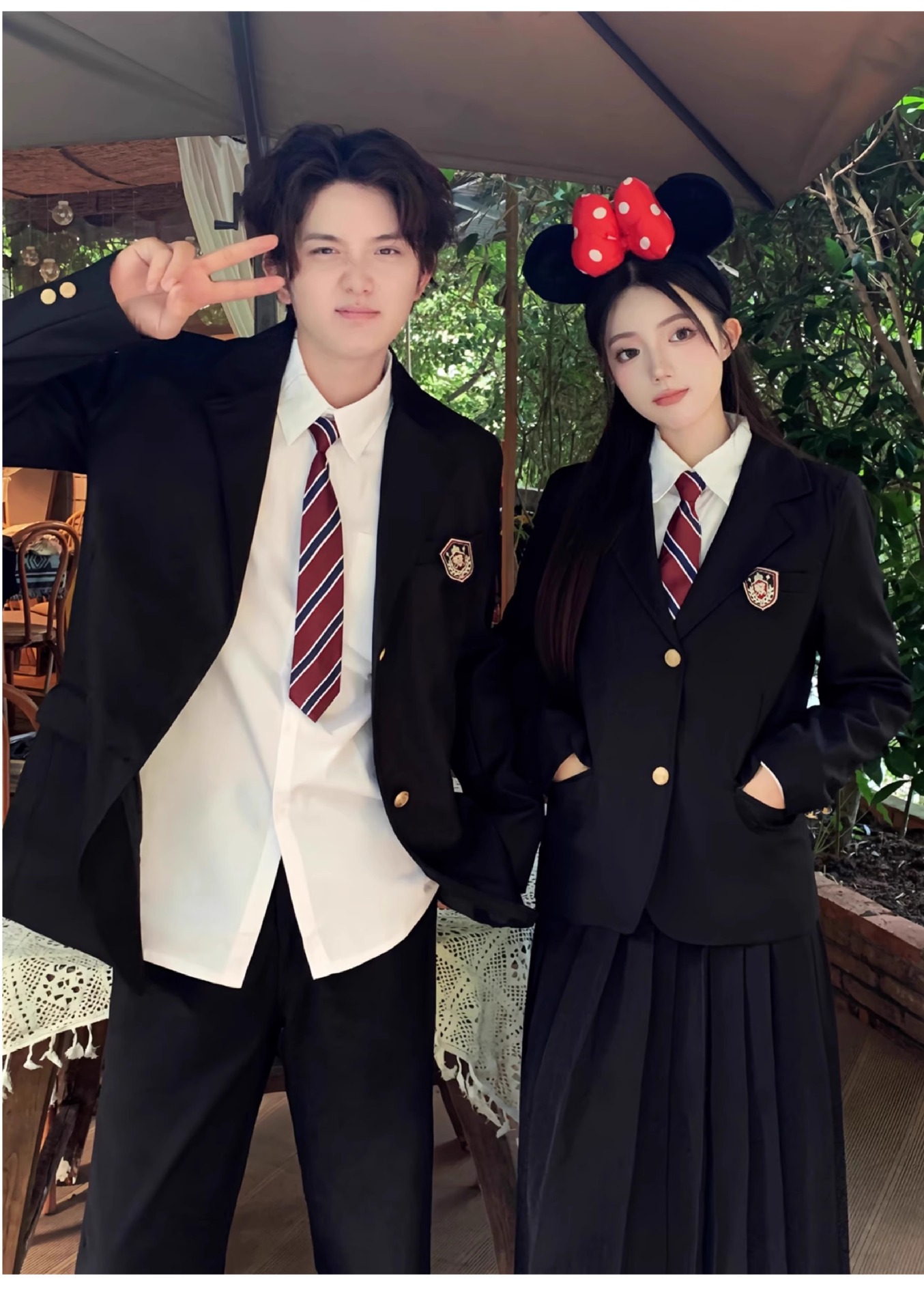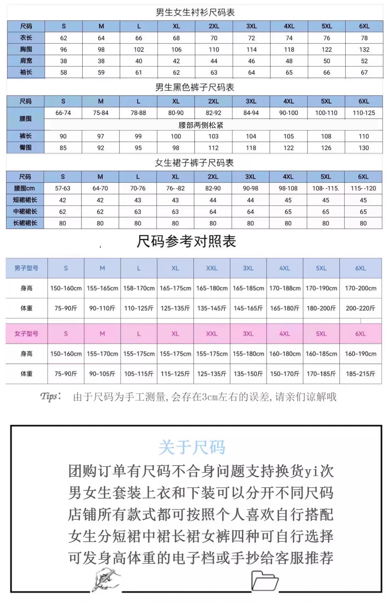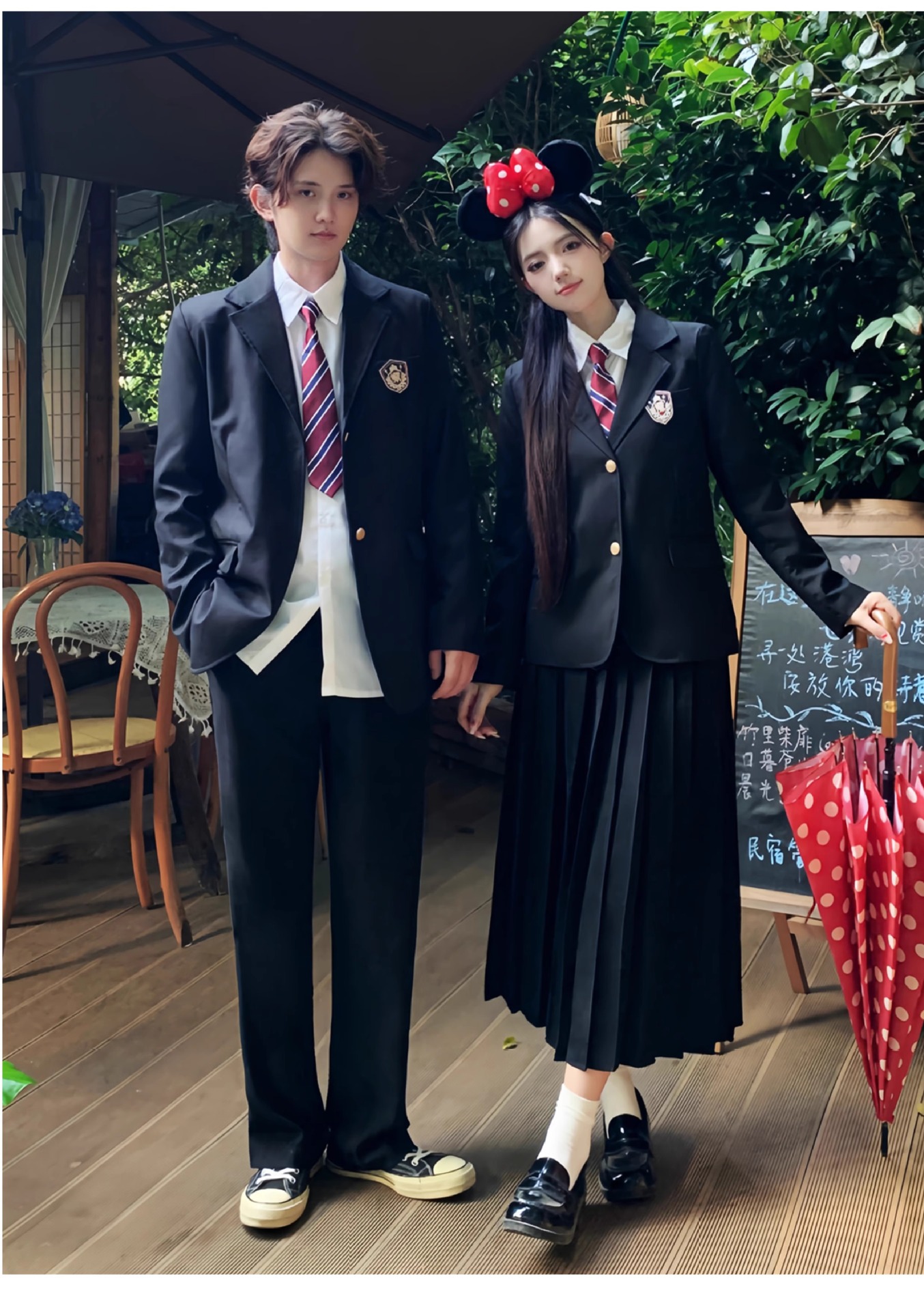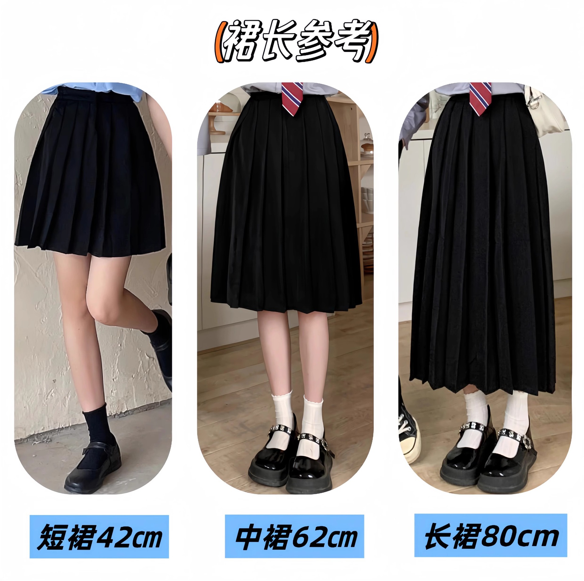 Женская белая рубашка с длинными рукавами + черная длинная юбка + женский черный костюм с двумя золотыми пуговицами + красный полосатый галстук + красный значок; Мужская белая рубашка с длинными рукавами + черные брюки + мужской черный костюм с двумя золотыми пуговицами + красный полосатый галстук + красный значок; Черная юбка 42см; Черная юбка миди 63см.; Черная длинная юбка 80см.