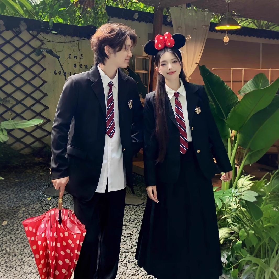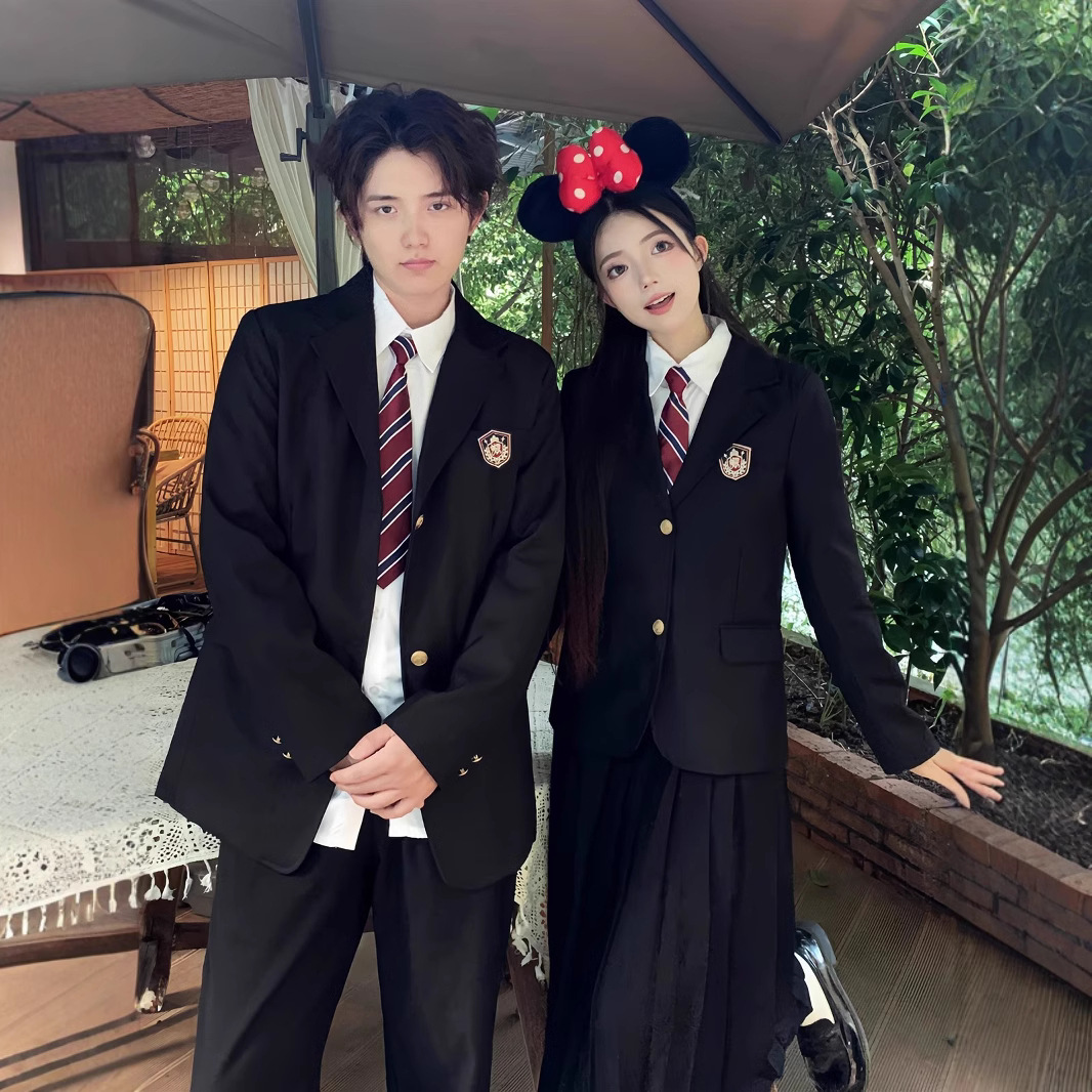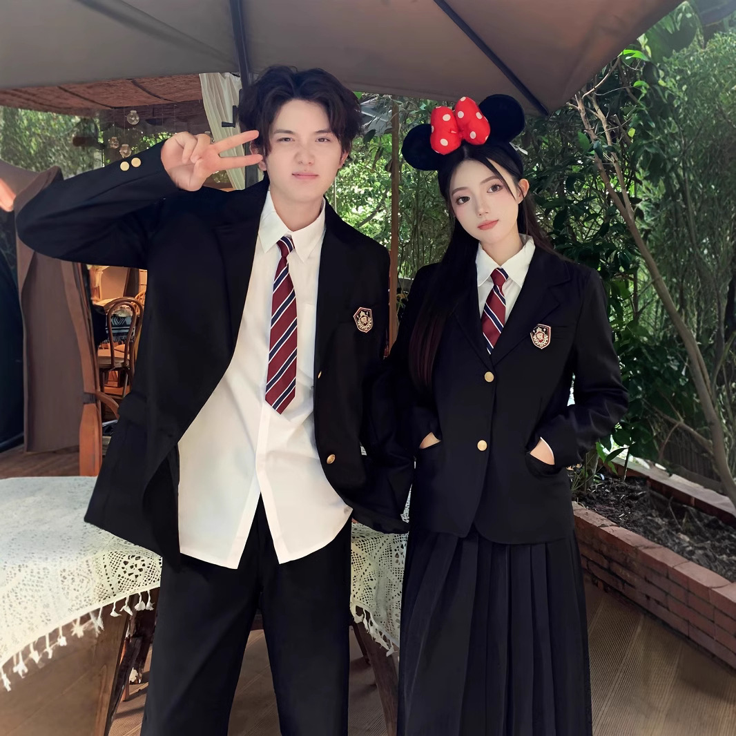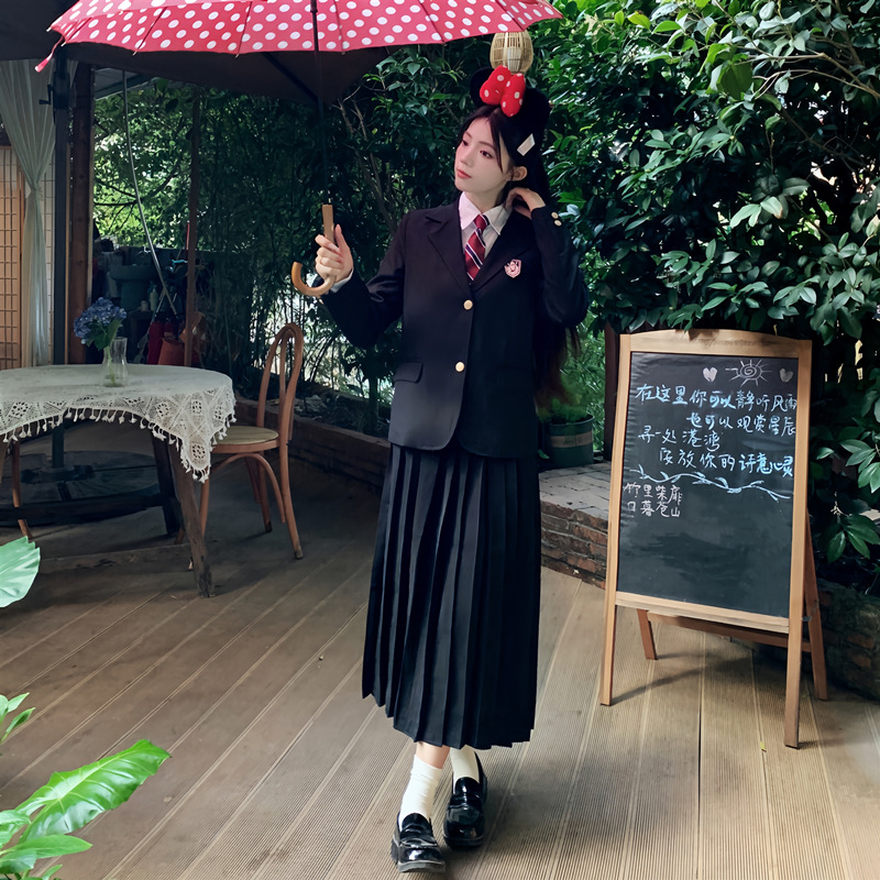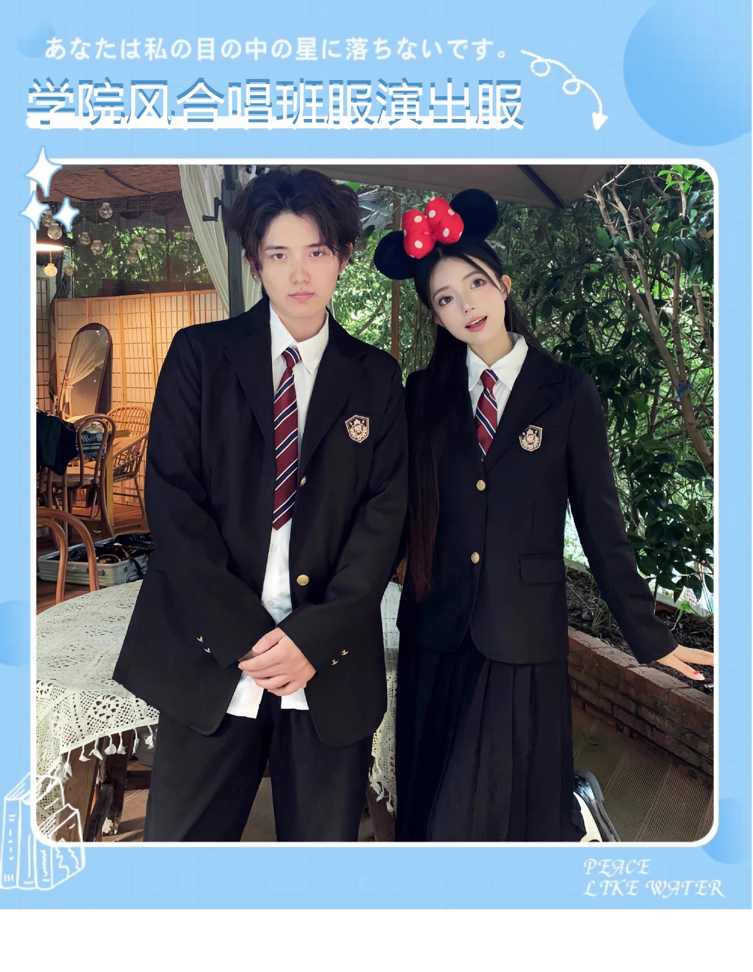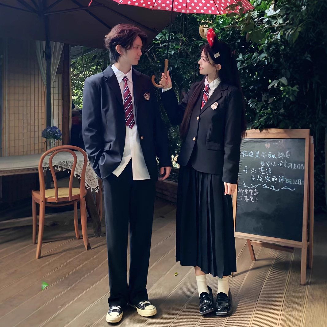 Женская белая рубашка с длинными рукавами + черная длинная юбка + женский черный костюм с двумя золотыми пуговицами + красный полосатый галстук + красный значок; Мужская белая рубашка с длинными рукавами + черные брюки + мужской черный костюм с двумя золотыми пуговицами + красный полосатый галстук + красный значок; Черная юбка 42см; Черная юбка миди 63см.; Черная длинная юбка 80см.