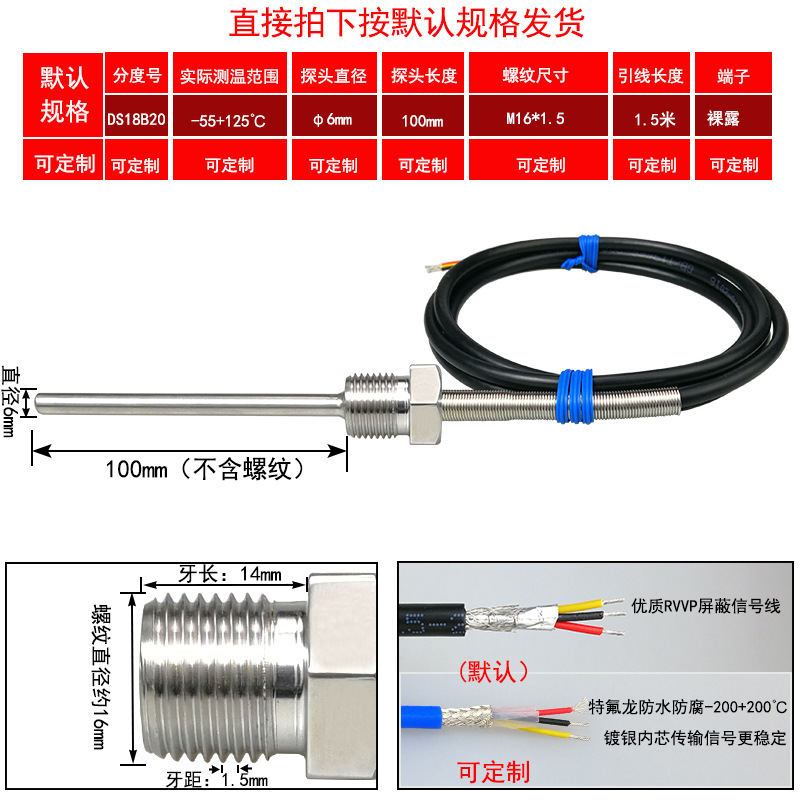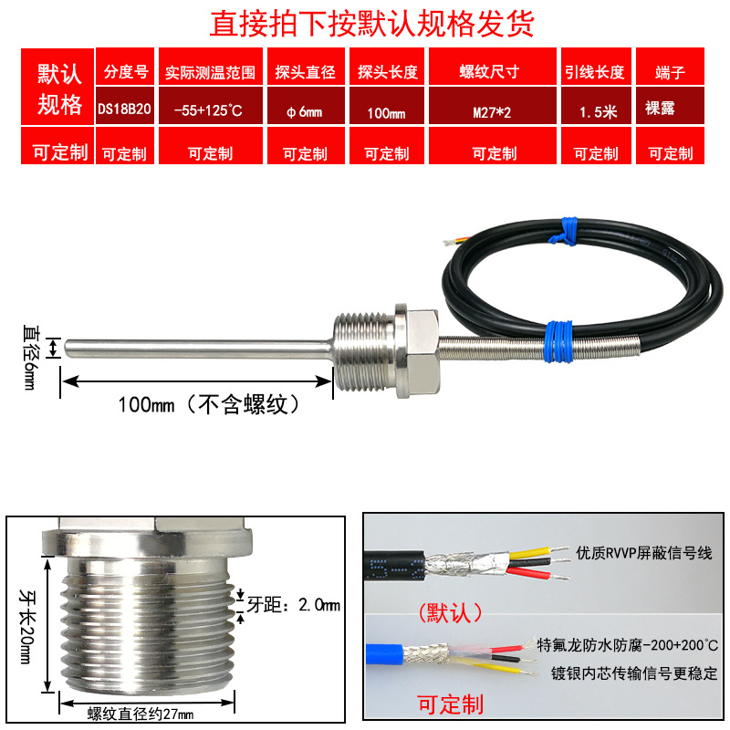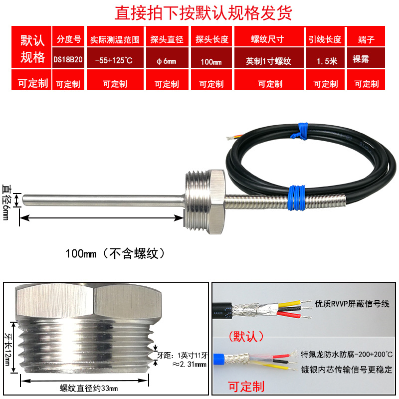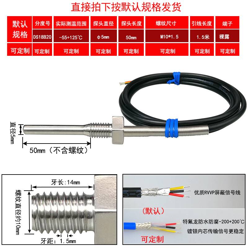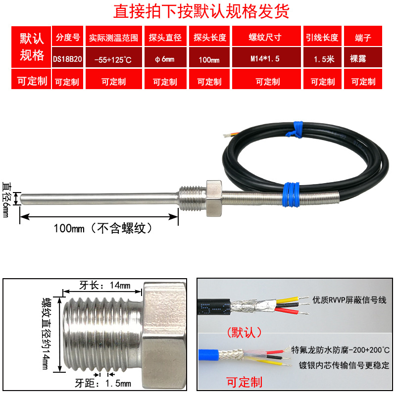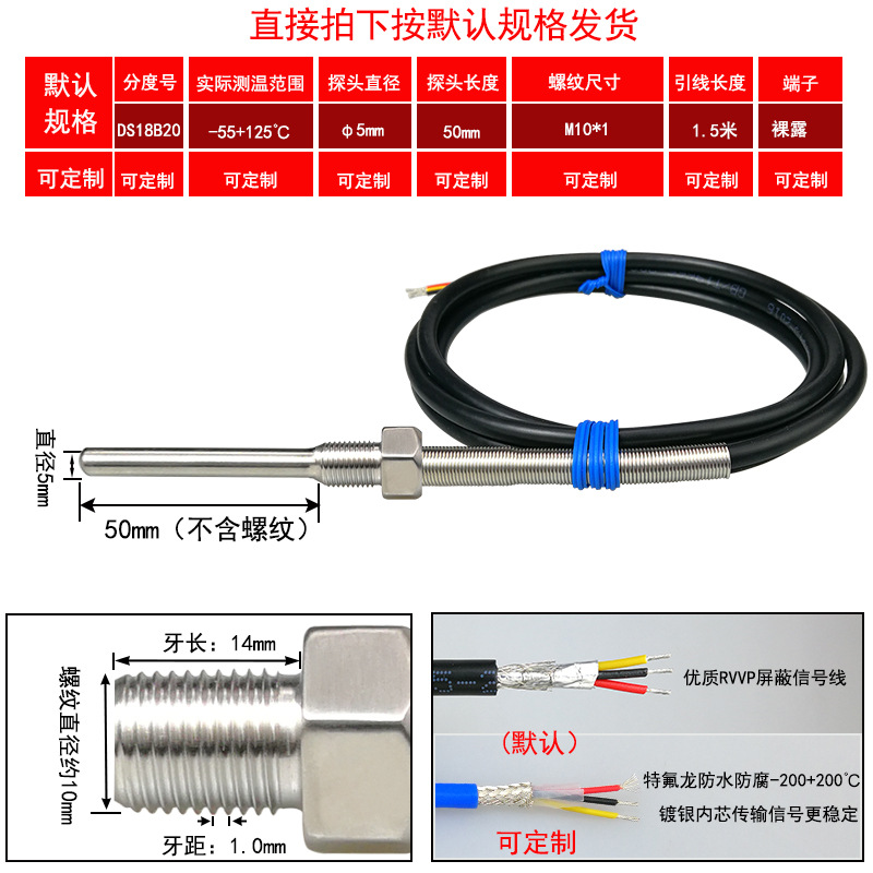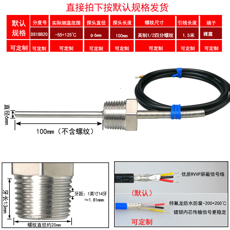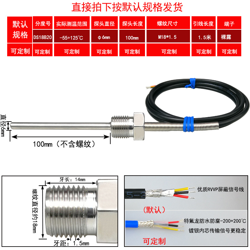 DS18B20/M8*1/φ5*50 мм* 1.5m; DS18B20/M8*1,25/φ5*50 мм* 1.5m; DS18B20/M10*1/φ5*50 мм* 1.5m; DS18B20/M10*1,5/φ5*50 мм* 1.5m; DS18B20/M12*1/φ6*100 мм* 1.5m; DS18B20/M12*1,5/φ6*100 мм* 1.5m; DS18B20/M12*1,75/φ6*100 мм* 1.5m; DS18B20/M14*1,5/φ6*100 мм* 1.5m; DS18B20/M16*1,5/φ6*100 мм* 1.5m; DS18B20/M18*1,5/φ6*100 мм* 1.5m; DS18B20/M20*1,5/φ6*100 мм* 1.5m; DS18B20/M27*2/φ6*100 мм* 1.5m; DS18B20/Импerial PT1/8 одноточечная резьба/φ5*50 мм* 1.5m; DS18B20/Импerial PT1/4 двухточечная резьба/φ6*100 мм* 1.5m; DS18B20/Импerial PT3/8 трехточечная резьба/φ6*100 мм* 1.5m; DS18B20/Импerial PT1/2 четверть резьбы/φ6*100 мм* 1.5m; DS18B20/Импerial PT3/4 шеститочечная резьба/φ6*100* 1.5m; DS18B20/Импертериал 1inch резьба/φ6*100 мм* 1.5m; Применимая настройка