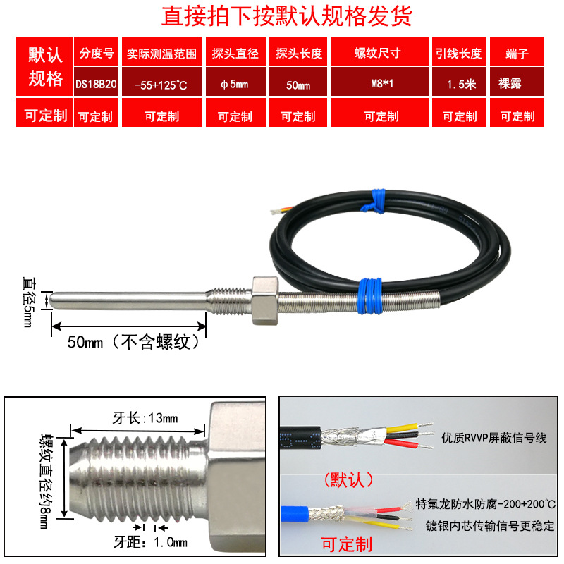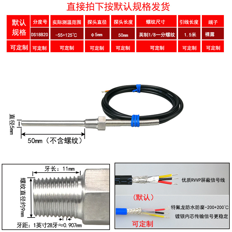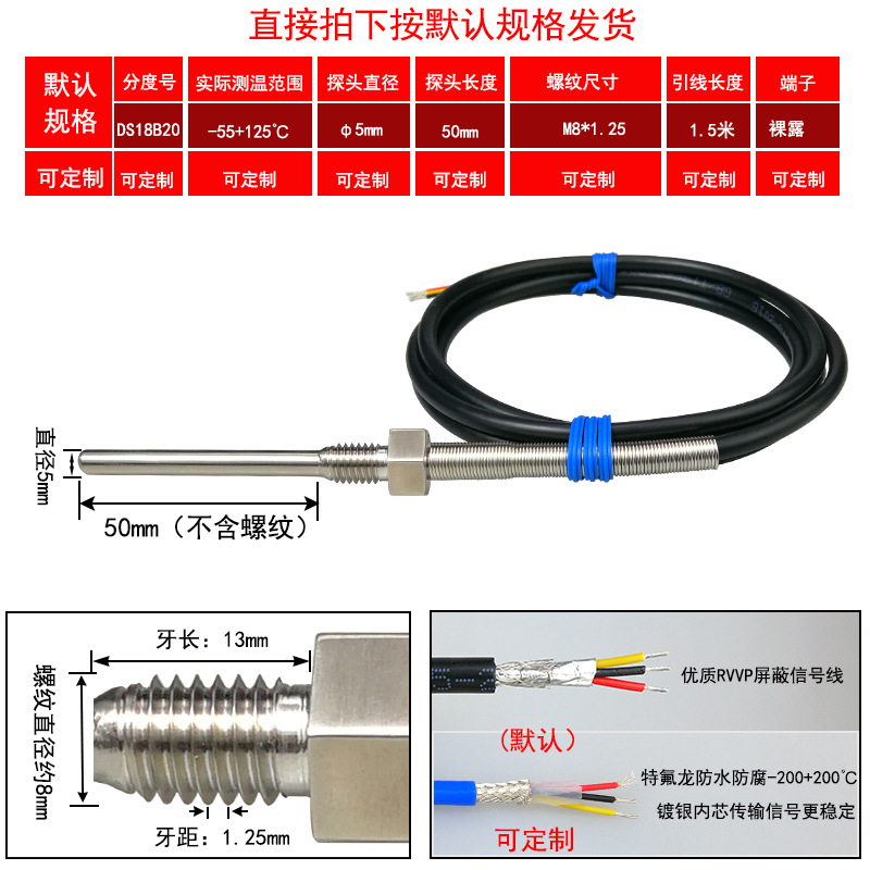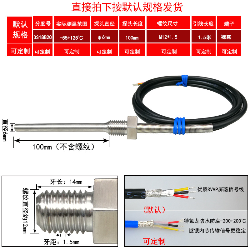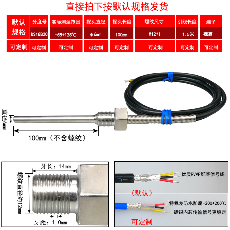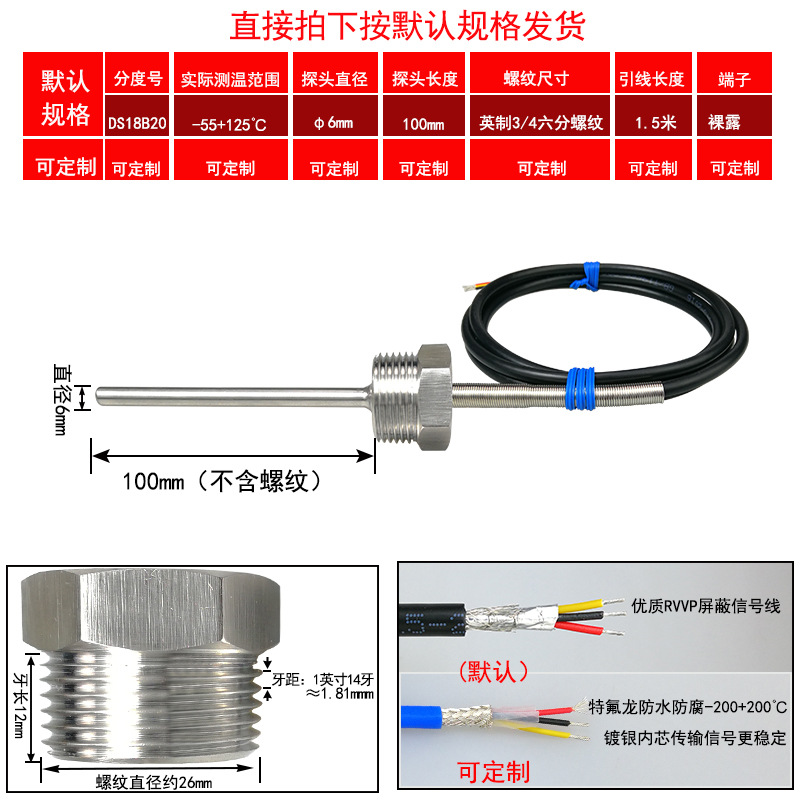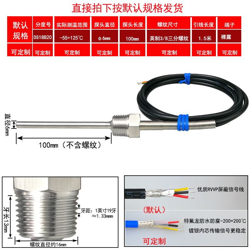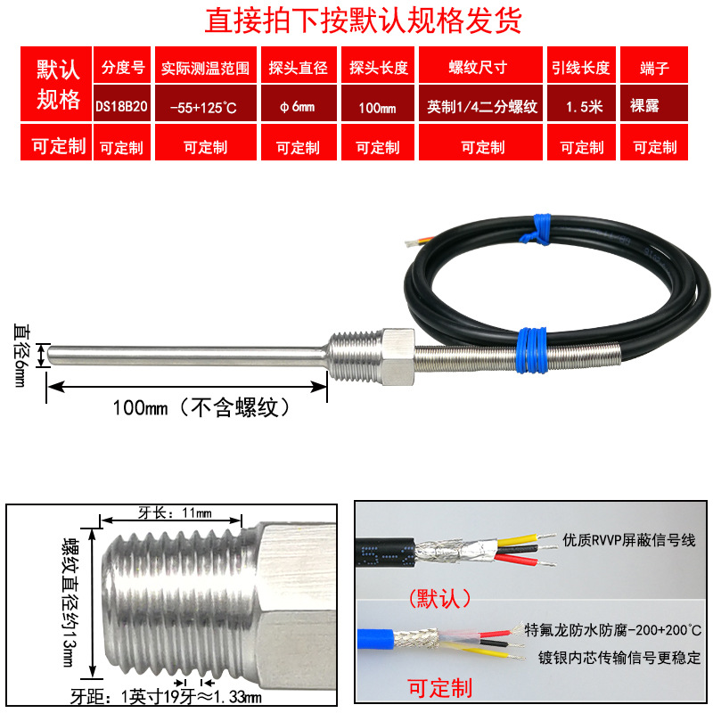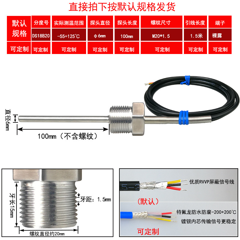 DS18B20/M8*1/φ5*50 мм* 1.5m; DS18B20/M8*1,25/φ5*50 мм* 1.5m; DS18B20/M10*1/φ5*50 мм* 1.5m; DS18B20/M10*1,5/φ5*50 мм* 1.5m; DS18B20/M12*1/φ6*100 мм* 1.5m; DS18B20/M12*1,5/φ6*100 мм* 1.5m; DS18B20/M12*1,75/φ6*100 мм* 1.5m; DS18B20/M14*1,5/φ6*100 мм* 1.5m; DS18B20/M16*1,5/φ6*100 мм* 1.5m; DS18B20/M18*1,5/φ6*100 мм* 1.5m; DS18B20/M20*1,5/φ6*100 мм* 1.5m; DS18B20/M27*2/φ6*100 мм* 1.5m; DS18B20/Импerial PT1/8 одноточечная резьба/φ5*50 мм* 1.5m; DS18B20/Импerial PT1/4 двухточечная резьба/φ6*100 мм* 1.5m; DS18B20/Импerial PT3/8 трехточечная резьба/φ6*100 мм* 1.5m; DS18B20/Импerial PT1/2 четверть резьбы/φ6*100 мм* 1.5m; DS18B20/Импerial PT3/4 шеститочечная резьба/φ6*100* 1.5m; DS18B20/Импертериал 1inch резьба/φ6*100 мм* 1.5m; Применимая настройка