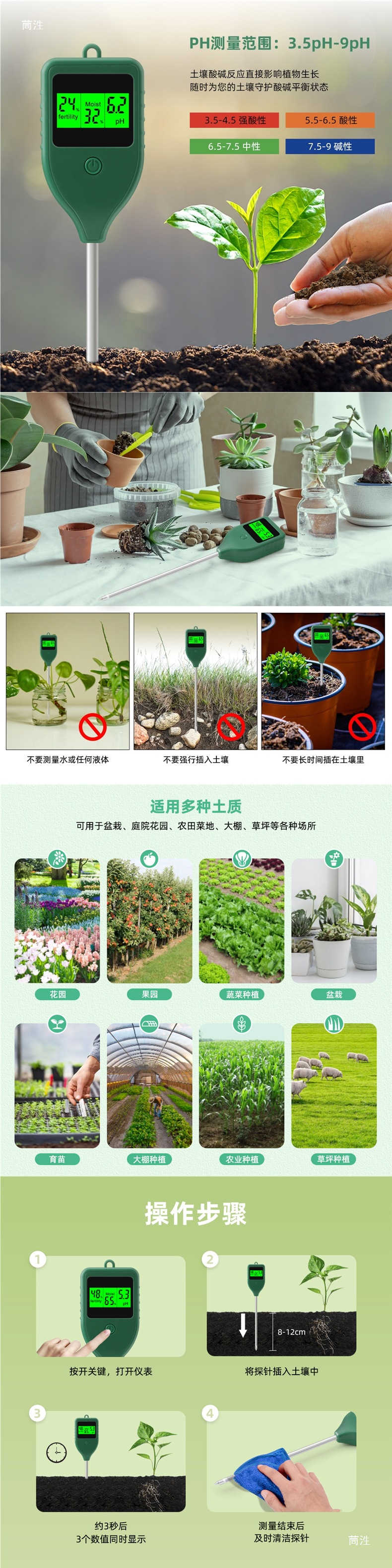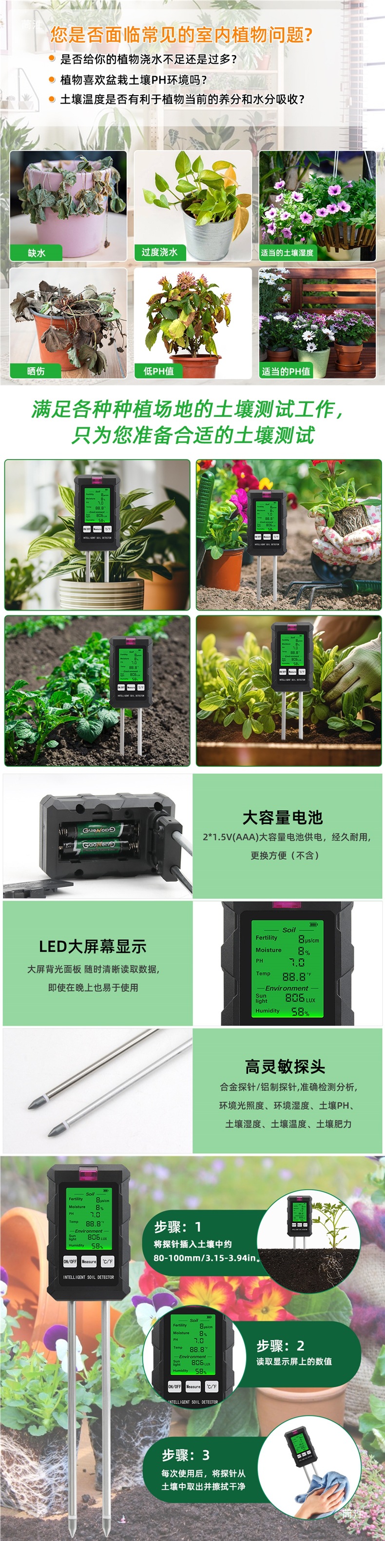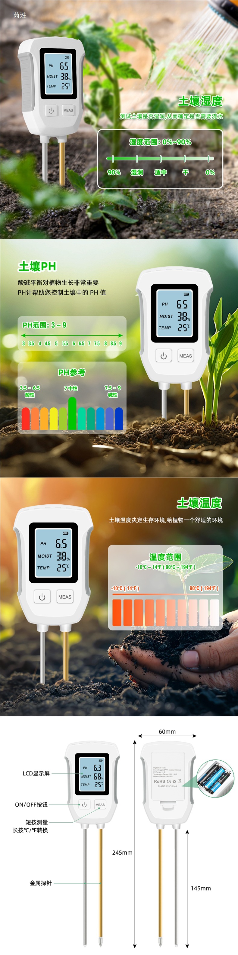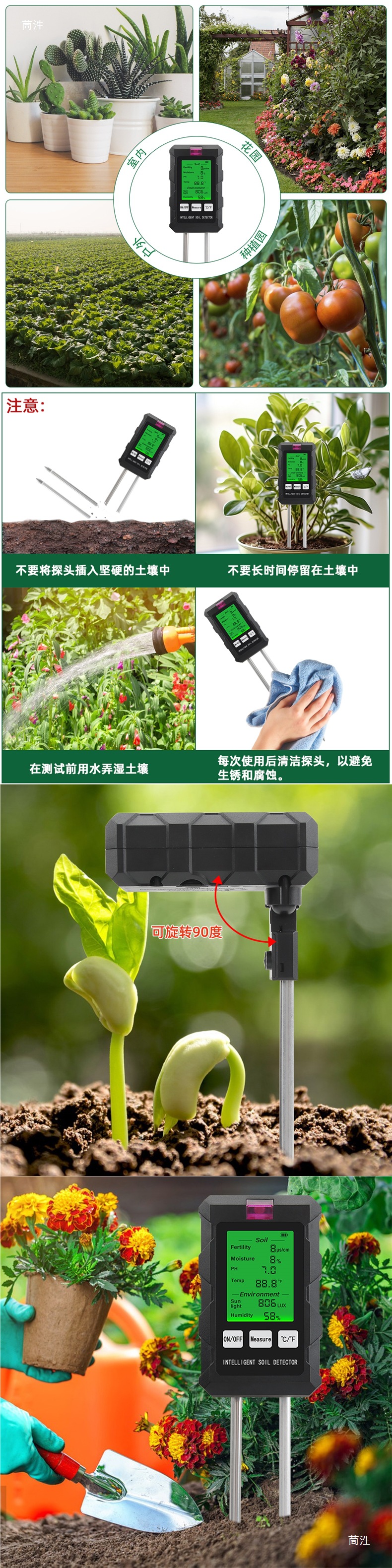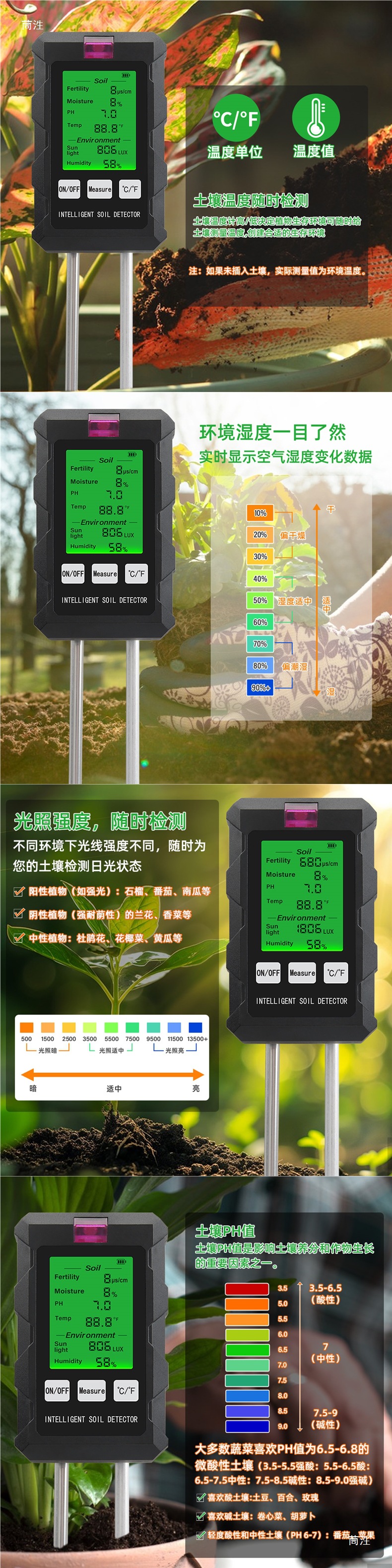 Двойной датчик детектора почвы 3-в-1 [PH/температура/влажность]; Цифровой дисплей измеритель почвы 3-в-1 [ph pH/влажность/фести]; Указатель измеритель почвы 4-в-1 [фаз/влажность/интенсивность света/пятствия питания]; Измеритель почвы 6-в-1 [значение вкуса/значение pH/значение света/влажность окружающей среды/влажность почвы/температура]