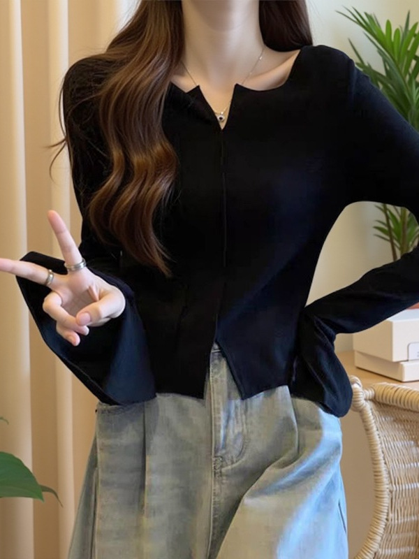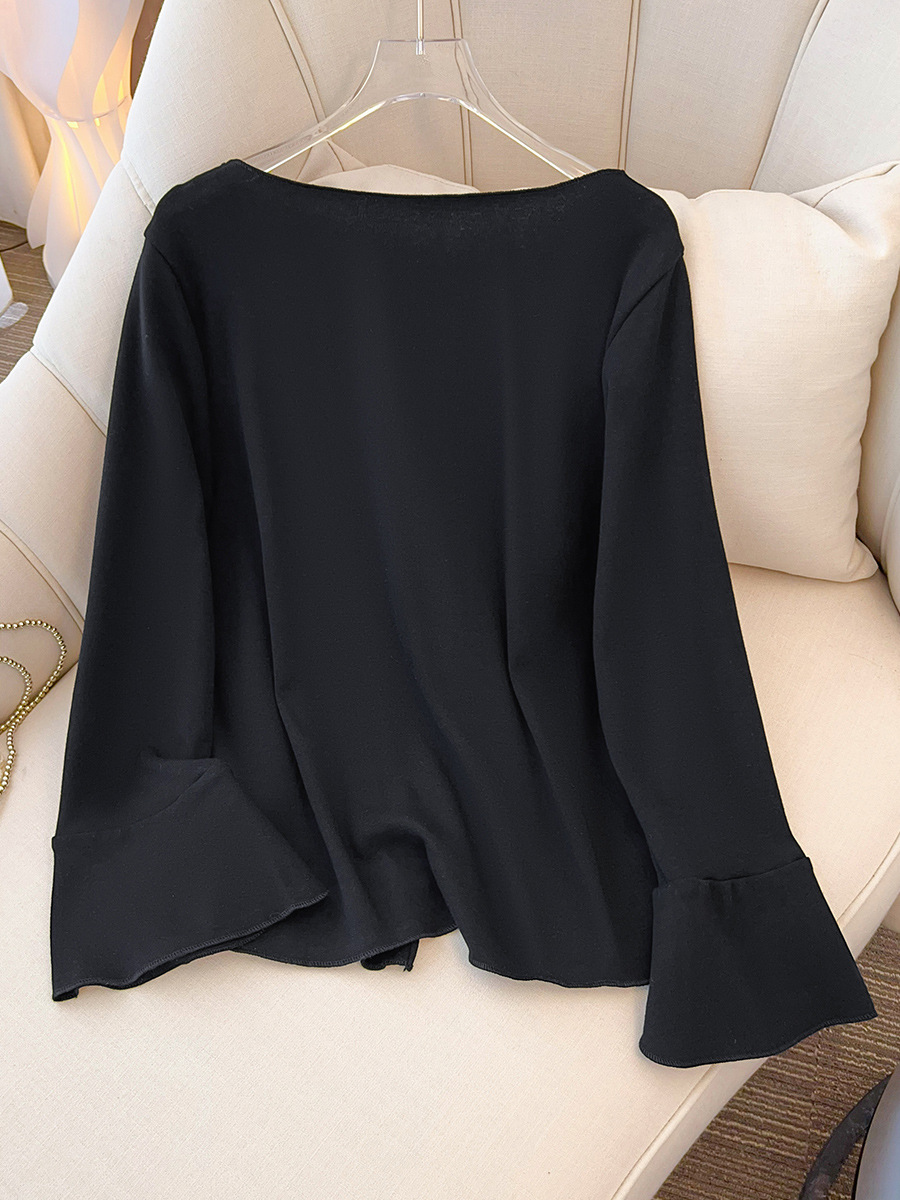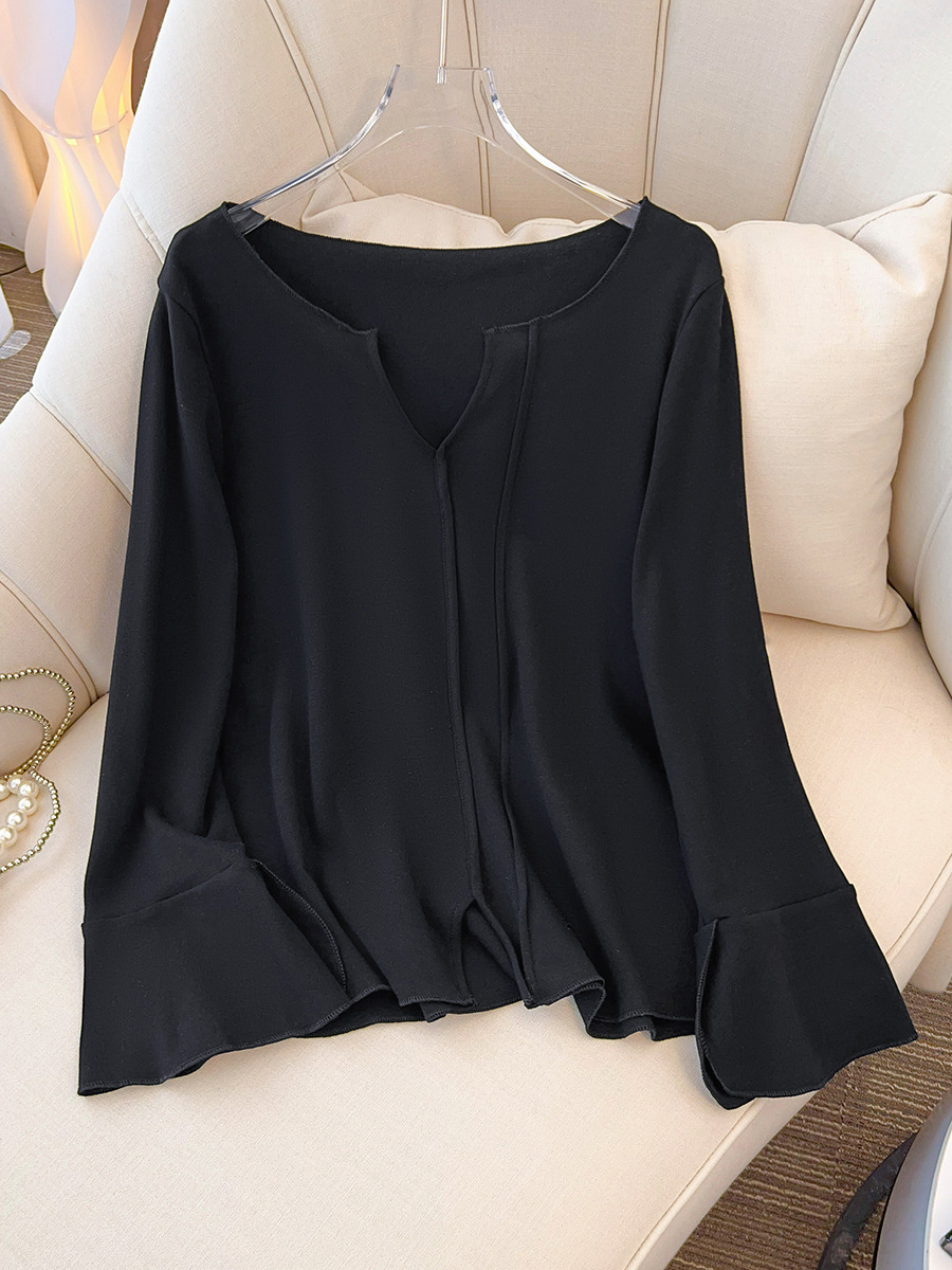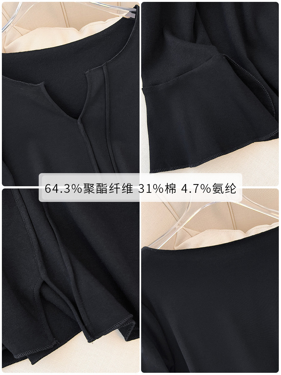 细节说明:袖口是喇叭袖设计,手腕处有开叉,布料柔软有弹性,透气性良好,上身舒适不扎人。适合20度左右穿,也可以当打底穿,外面套外套