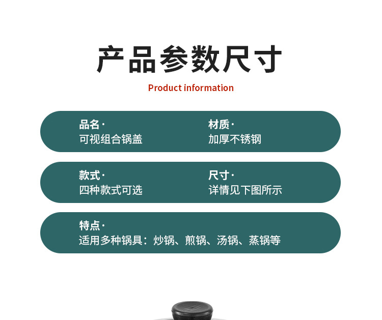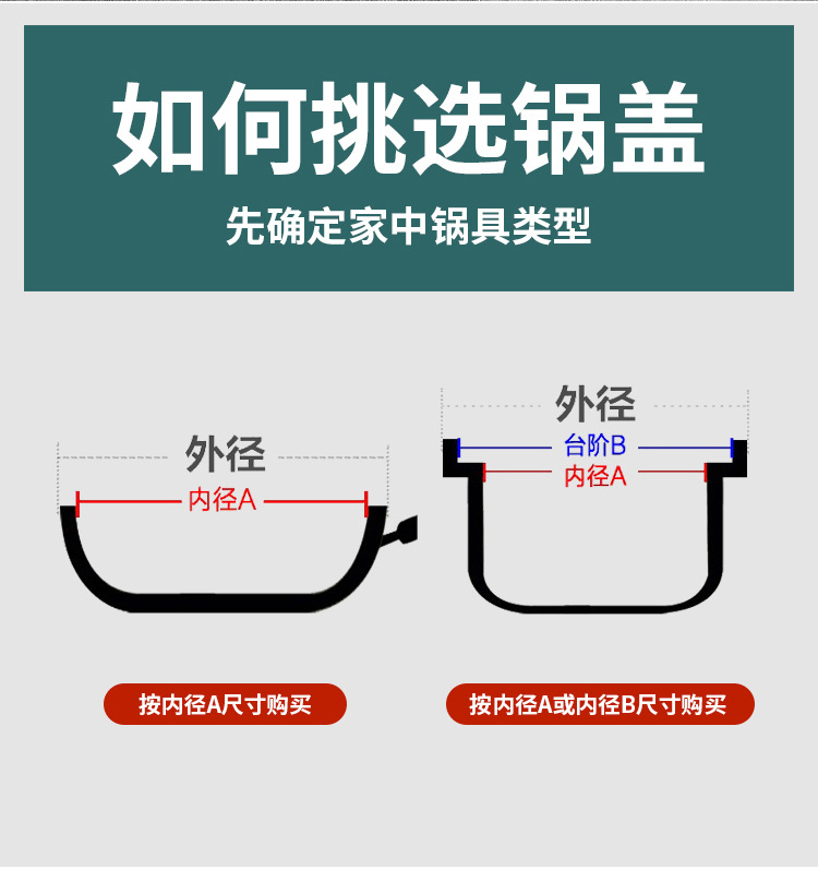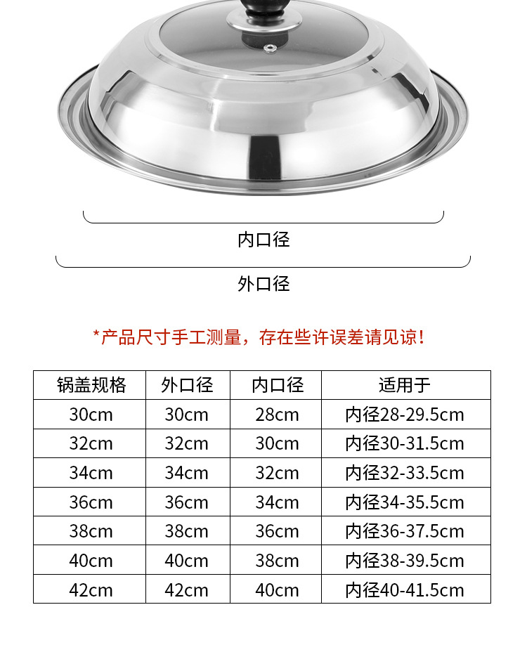 30CM锅盖适用28-29.5炒锅,32CM锅盖适用30-31.5炒锅,34CM锅盖适用32-33.5炒锅,36CM锅盖适用34-35.5炒锅,38CM锅盖适用36-37.5炒锅,40CM锅盖适用38-39.5炒锅,42CM锅盖适用40-41.5炒锅