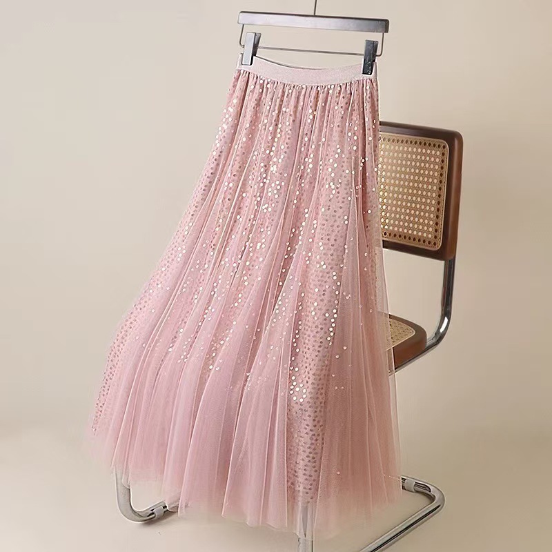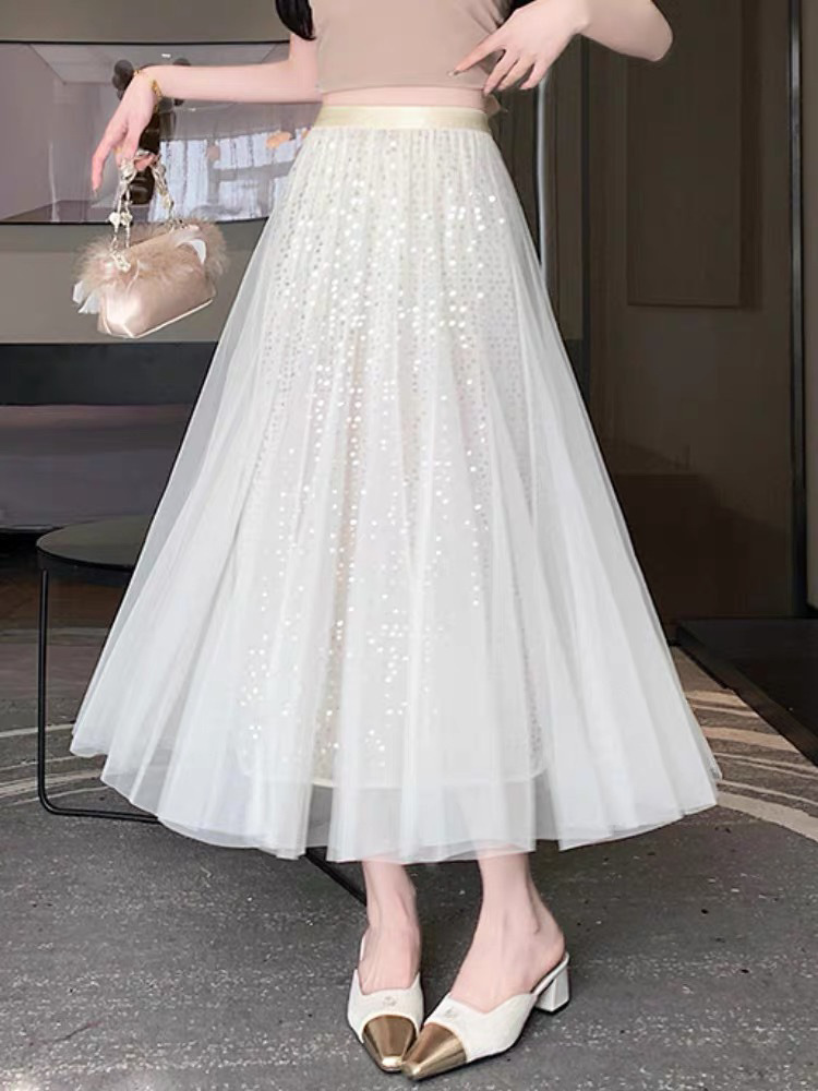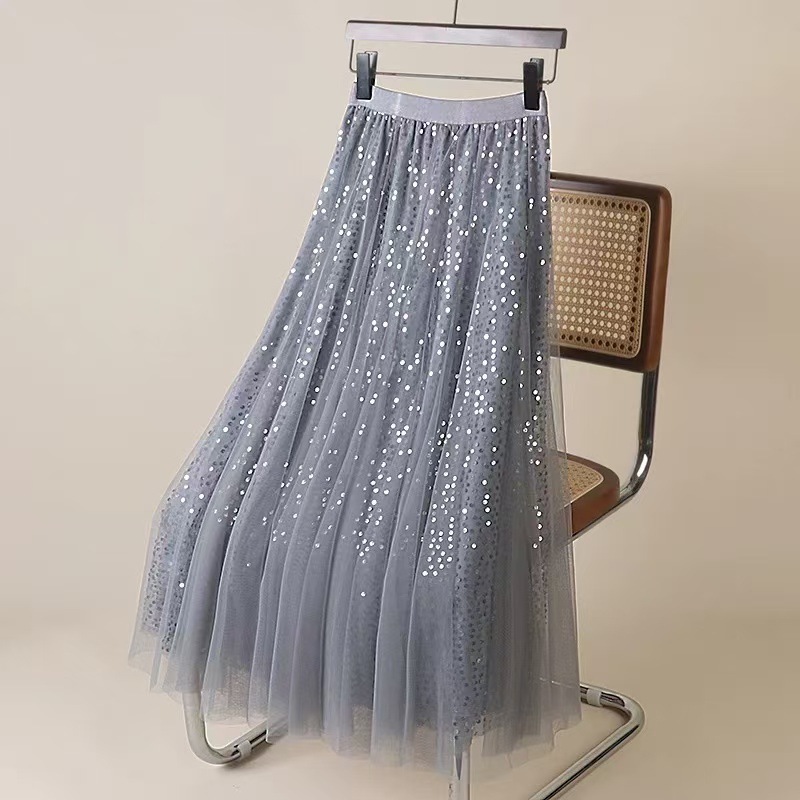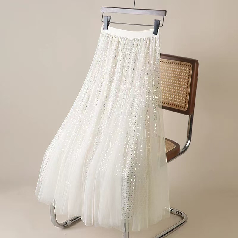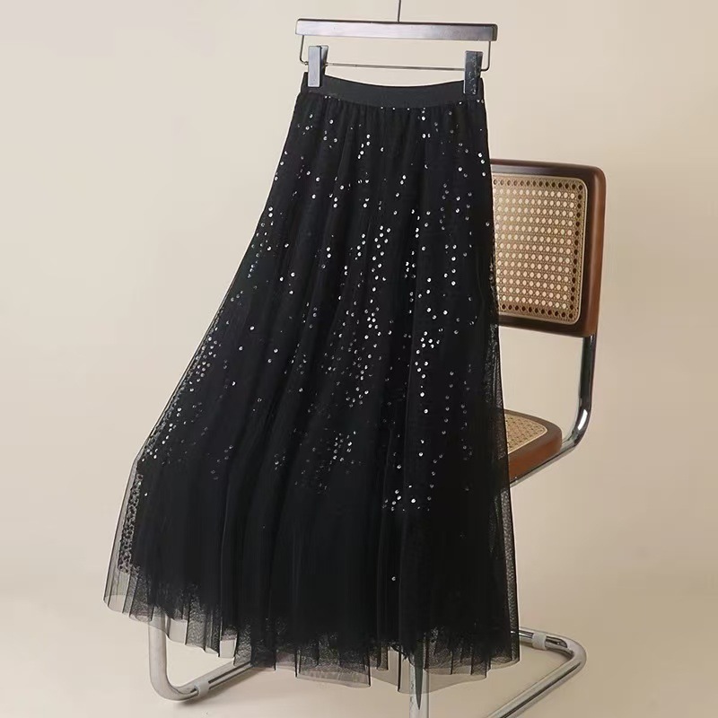Фэнтезийная французская сетчатая юбка с пайетками для женщин, новый стиль 2022, драпировка с высокой талией, утягивающий вид, трапециевидная юбка-зонтик с большим подолом, бусы