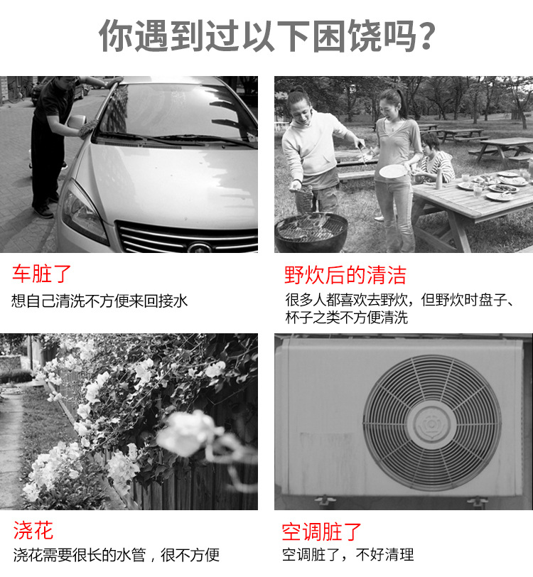 Подходит для чистки автомобилей на открытом воздухе, чистки кондиционеров, уборки в стиле кемпинга на открытом воздухе, полива сада, чистки домашних животных, гигиенической чистки в помещении и на открытом воздухе и т. д.