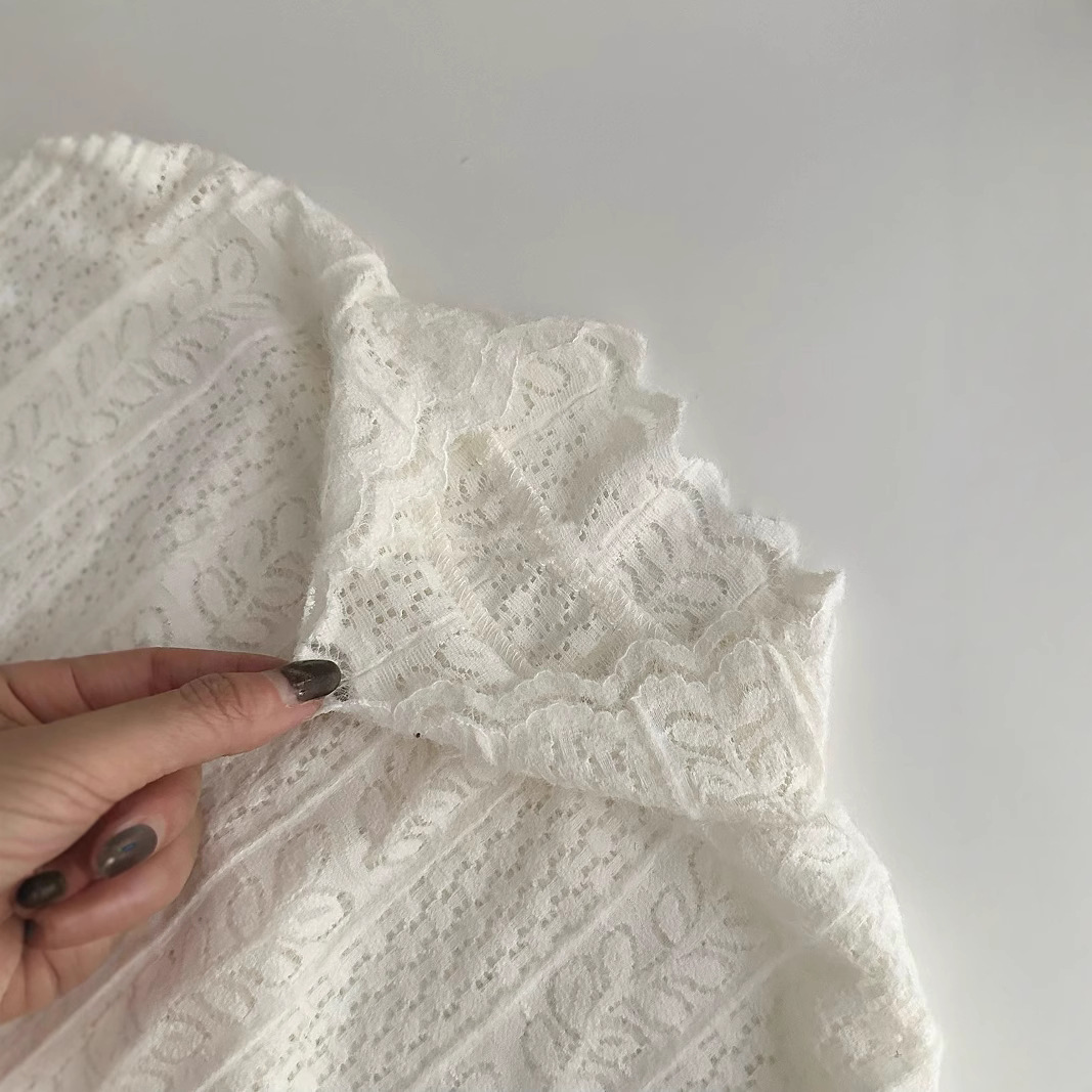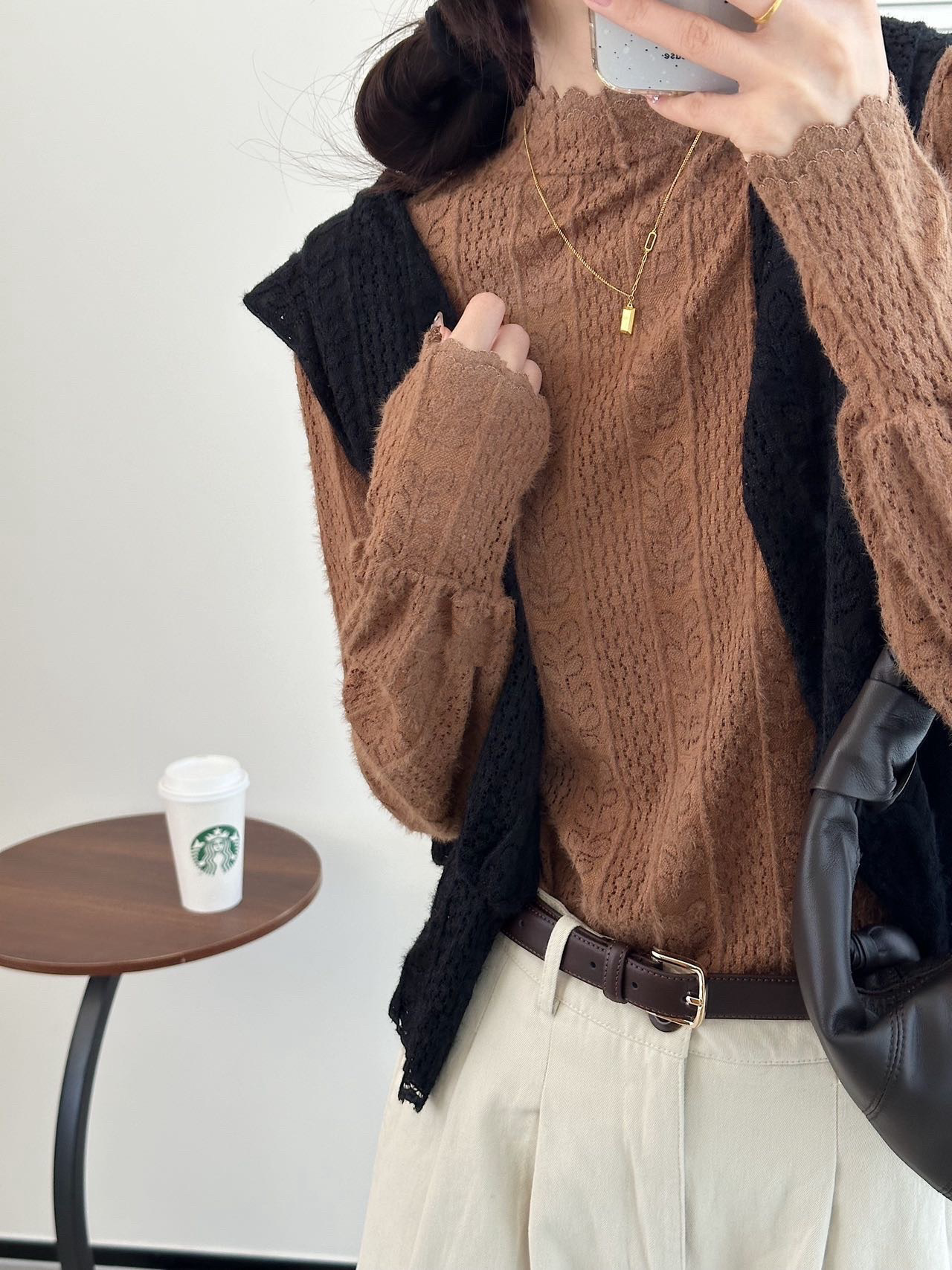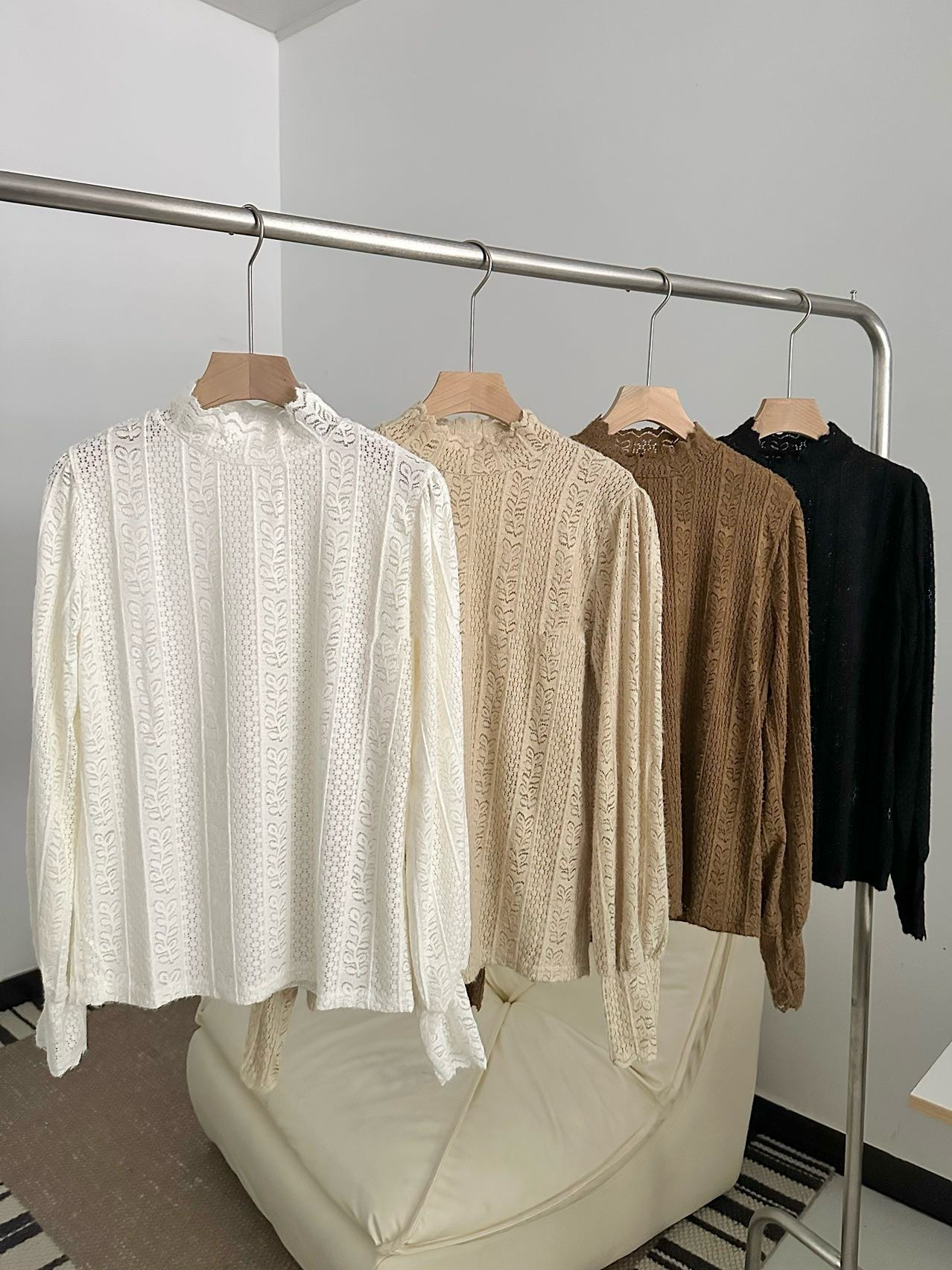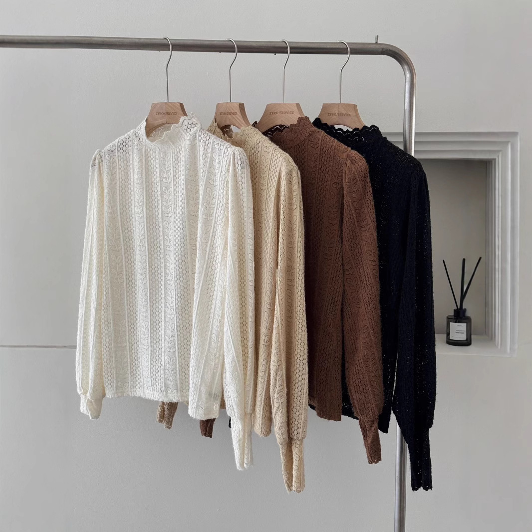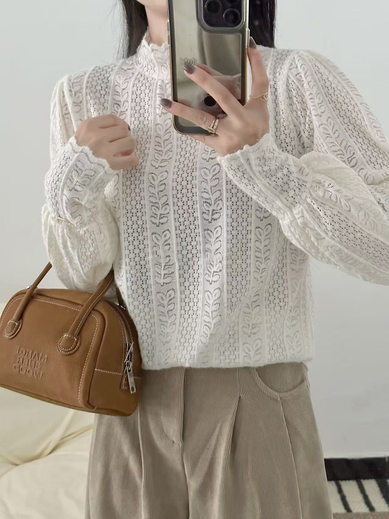 Красота перевернула женскую французскую кружевную нижнюю рубашку с полувысоким воротником с кружевным воротником элегантный дикий топ с длинными рукавами осенью и зимой