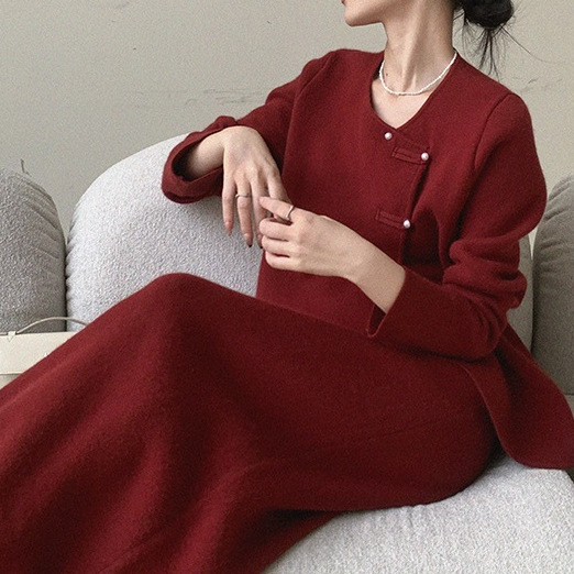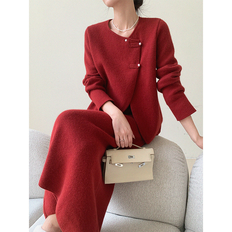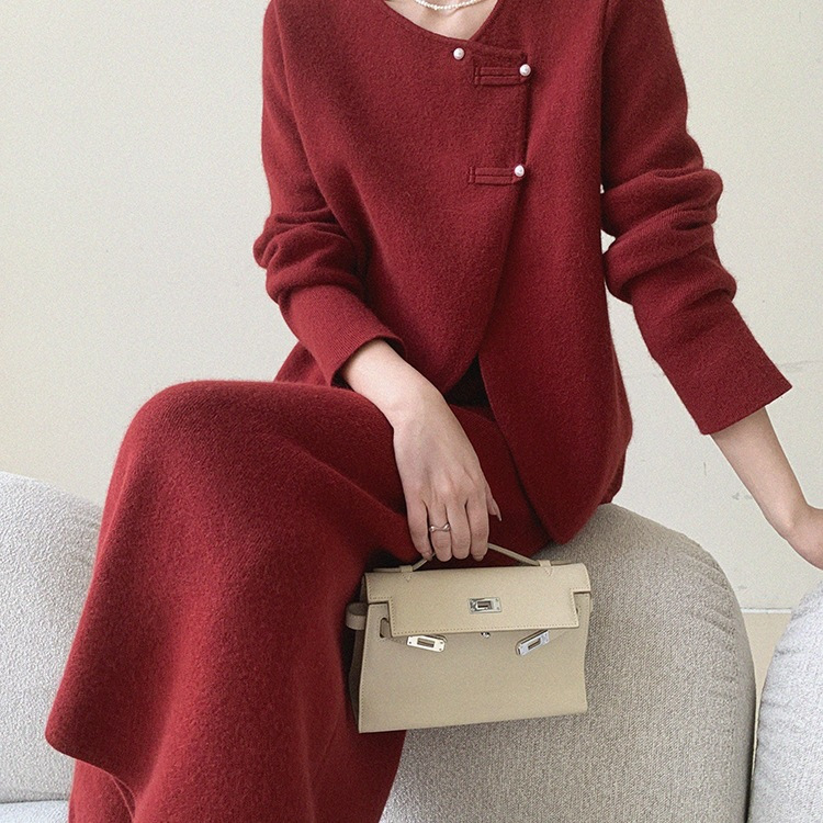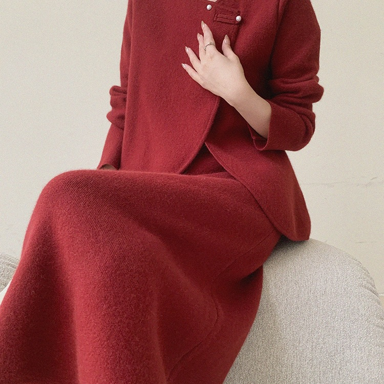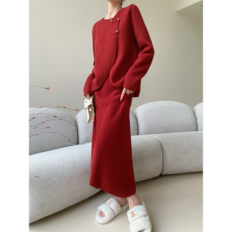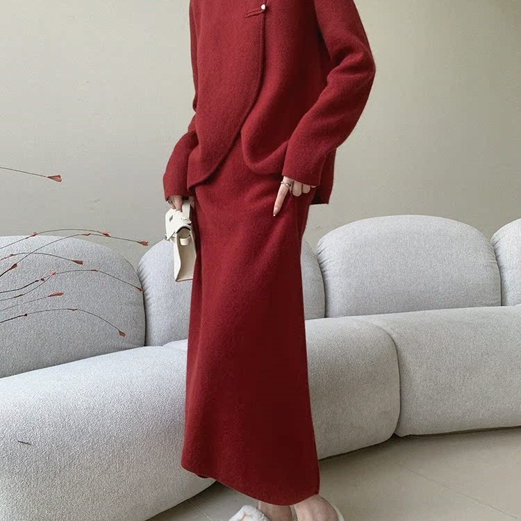 Красный трикотаж из двух частей женский осень зима 2024 новый дизайн топы с высокой талией юбка