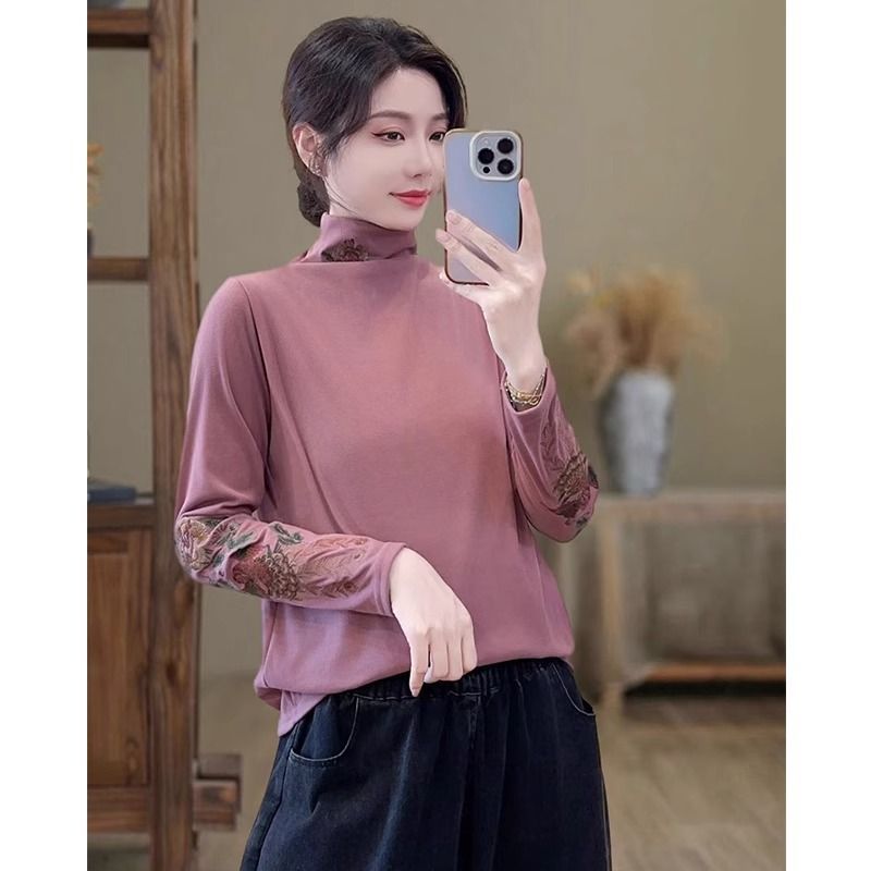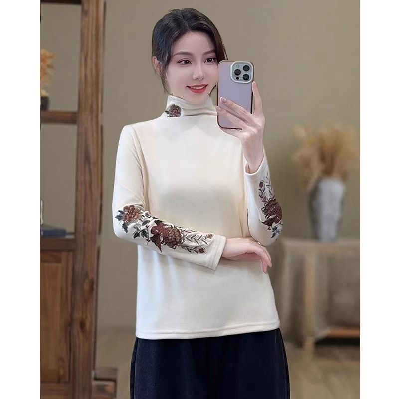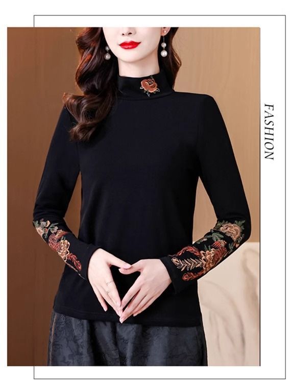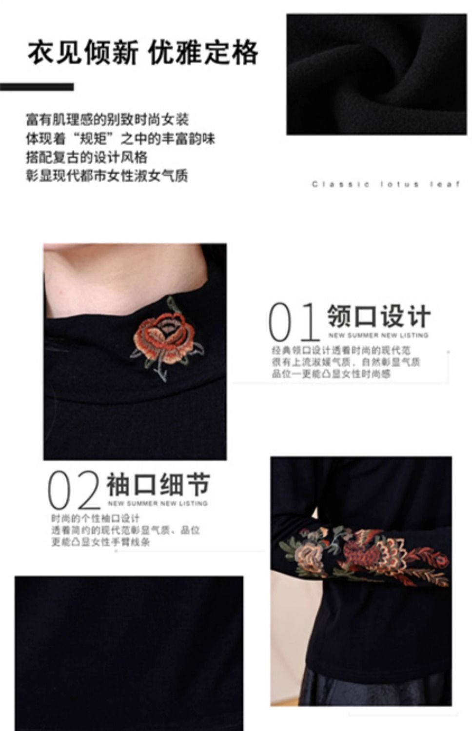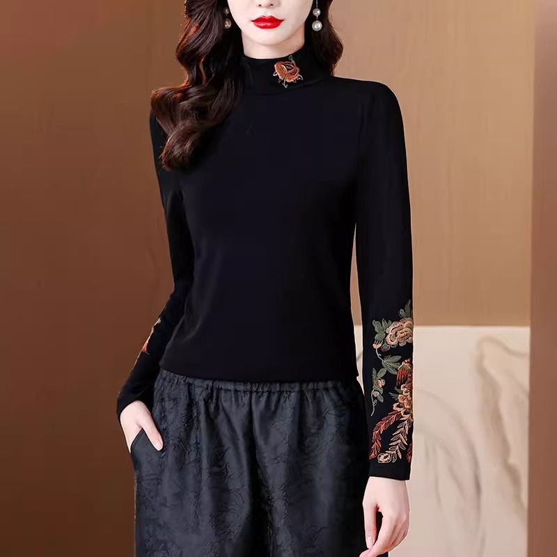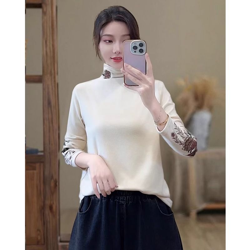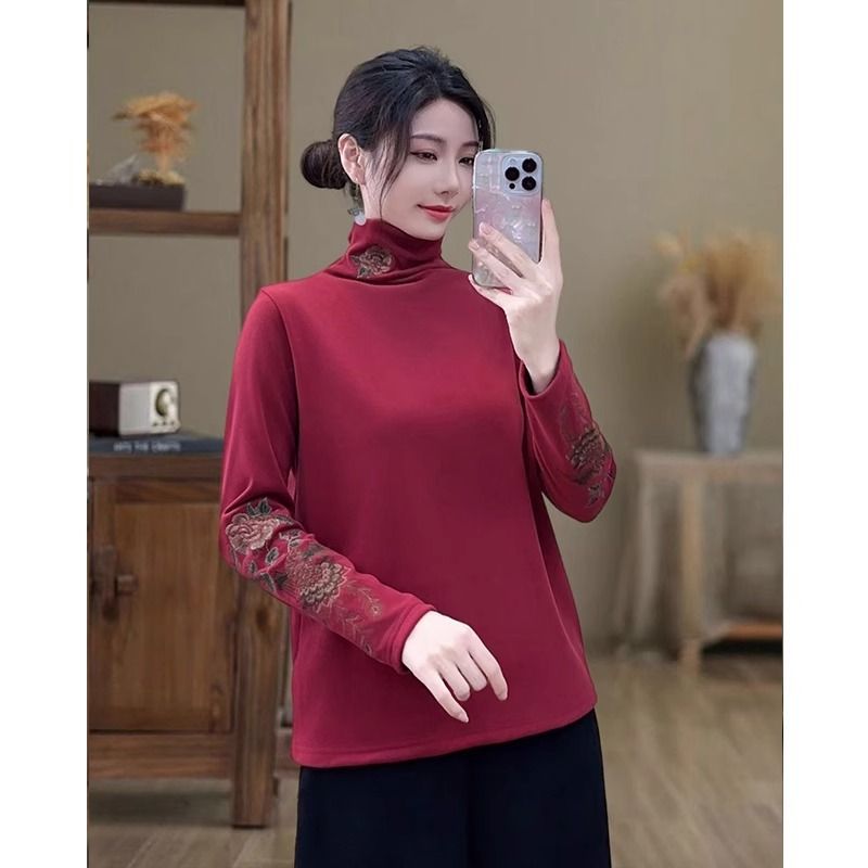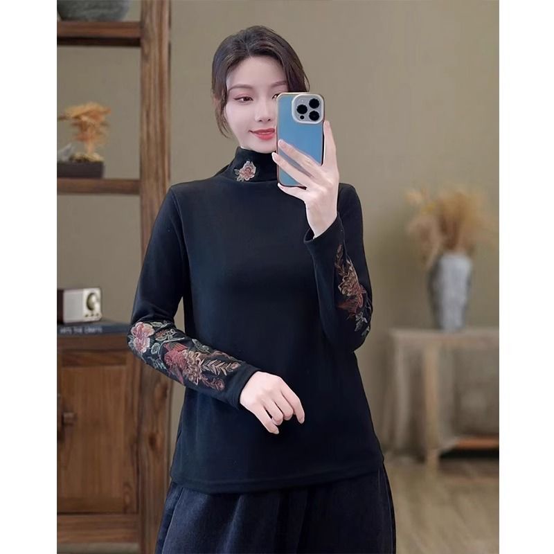 Вышивка осенне-зимний новый высокий воротник ретро теплый национальный Delong с длинными рукавами двухсторонняя футболка литературный нижний китайский топ
