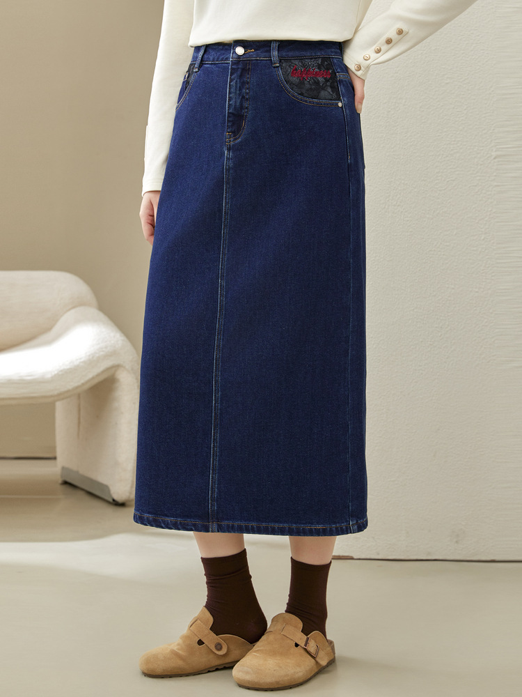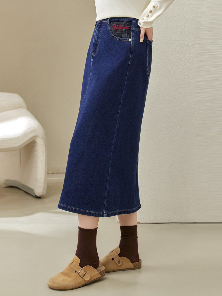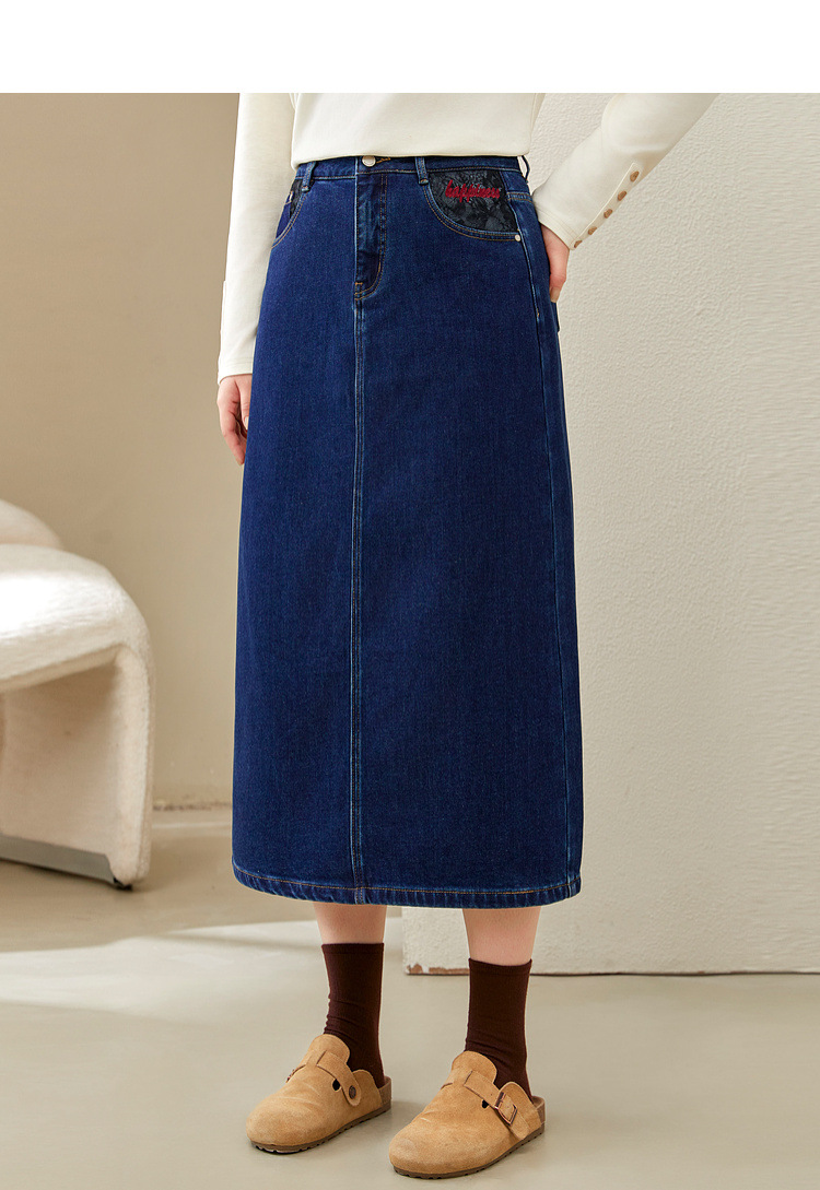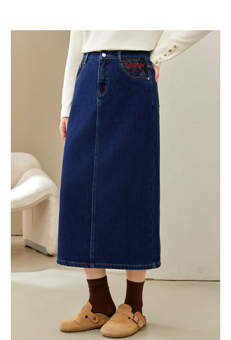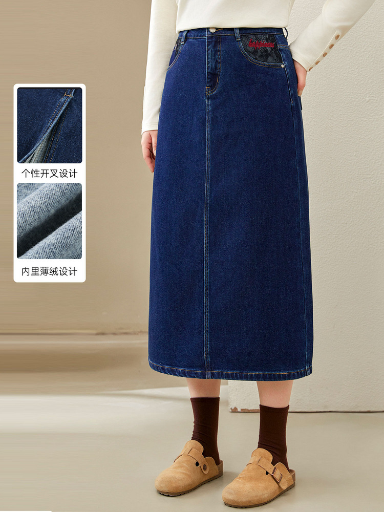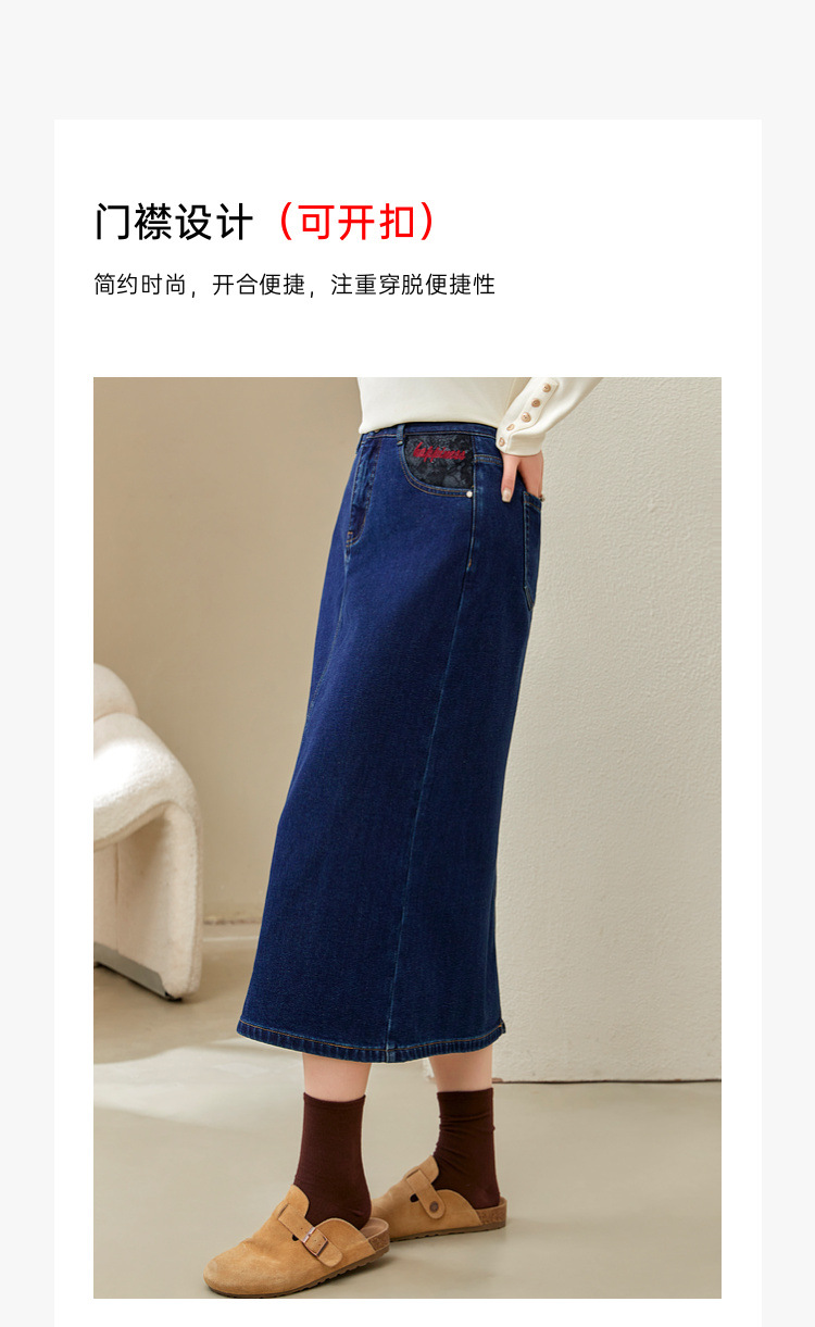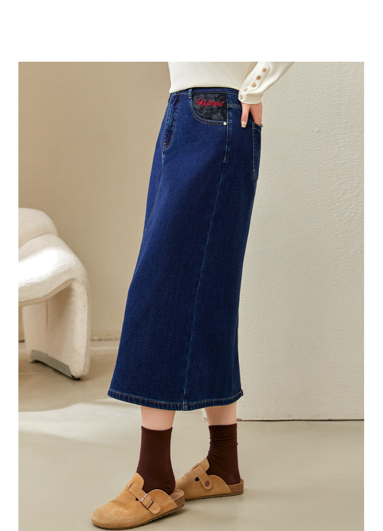 Полноцветное шоу большой размер женская темно-синяя мода индивидуальность с расколотой тонкая джинсовая юбка толстый mm2024 зимний новый стиль